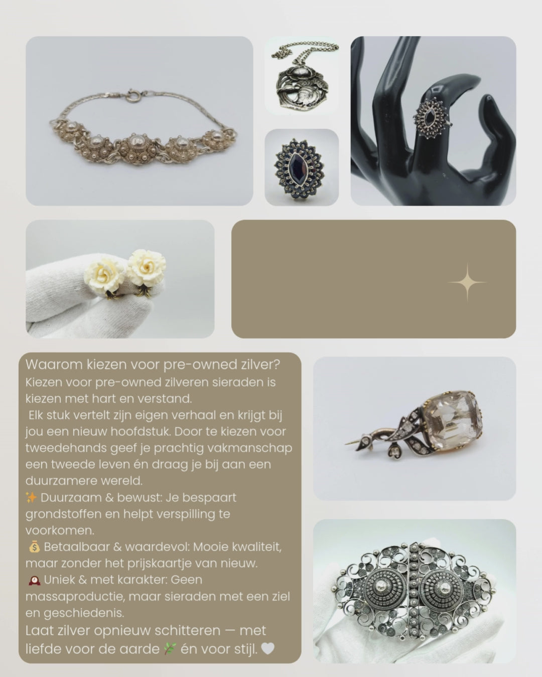 Waarom kiezen voor PRE-OWNED zilver? 💎 Unieke ontwerpen en vakmanschap. Oudere zilverstukken (zoals antiek of vintage) hebben vaak ontwerpen of technieken die tegenwoordig niet meer worden gemaakt.Dit geeft elk stuk karakter en een verhaal — aantrekkelijk voor verzamelaars of mensen die iets unieks willen dragen of gebruiken.