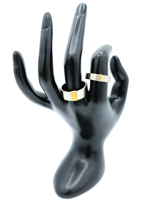 2 Stalen ringen met gouden applicatie, 585, 18,5 en 20 mm