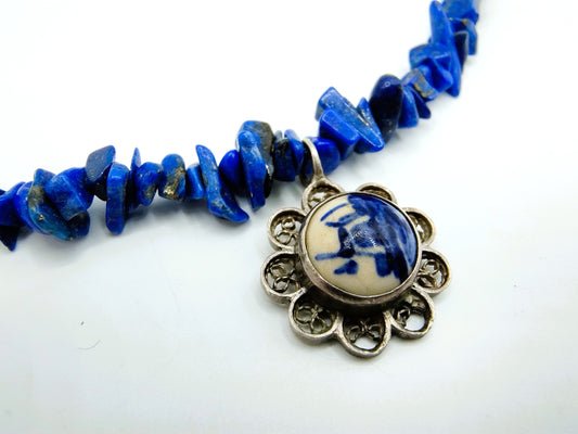Lapis lazuli ketting met zilveren Delfts blauwe hanger en slotje, 43,5 cm
