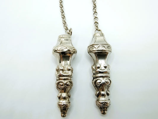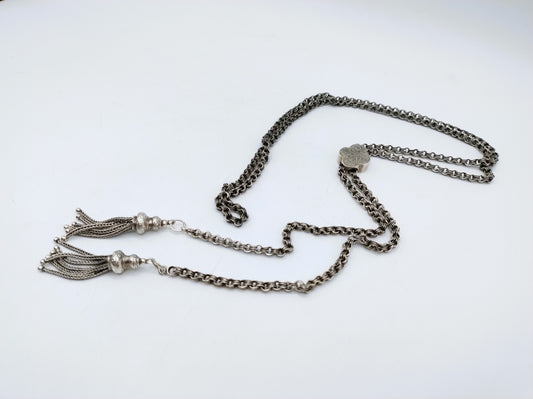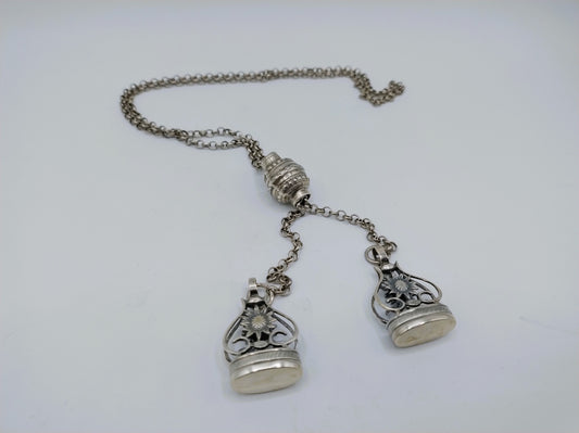 Silberne Jasseronkette mit Stricknadelkappen (Stiefel), 79 cm.