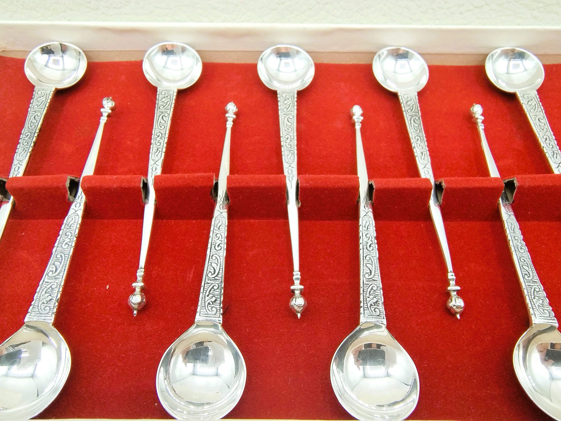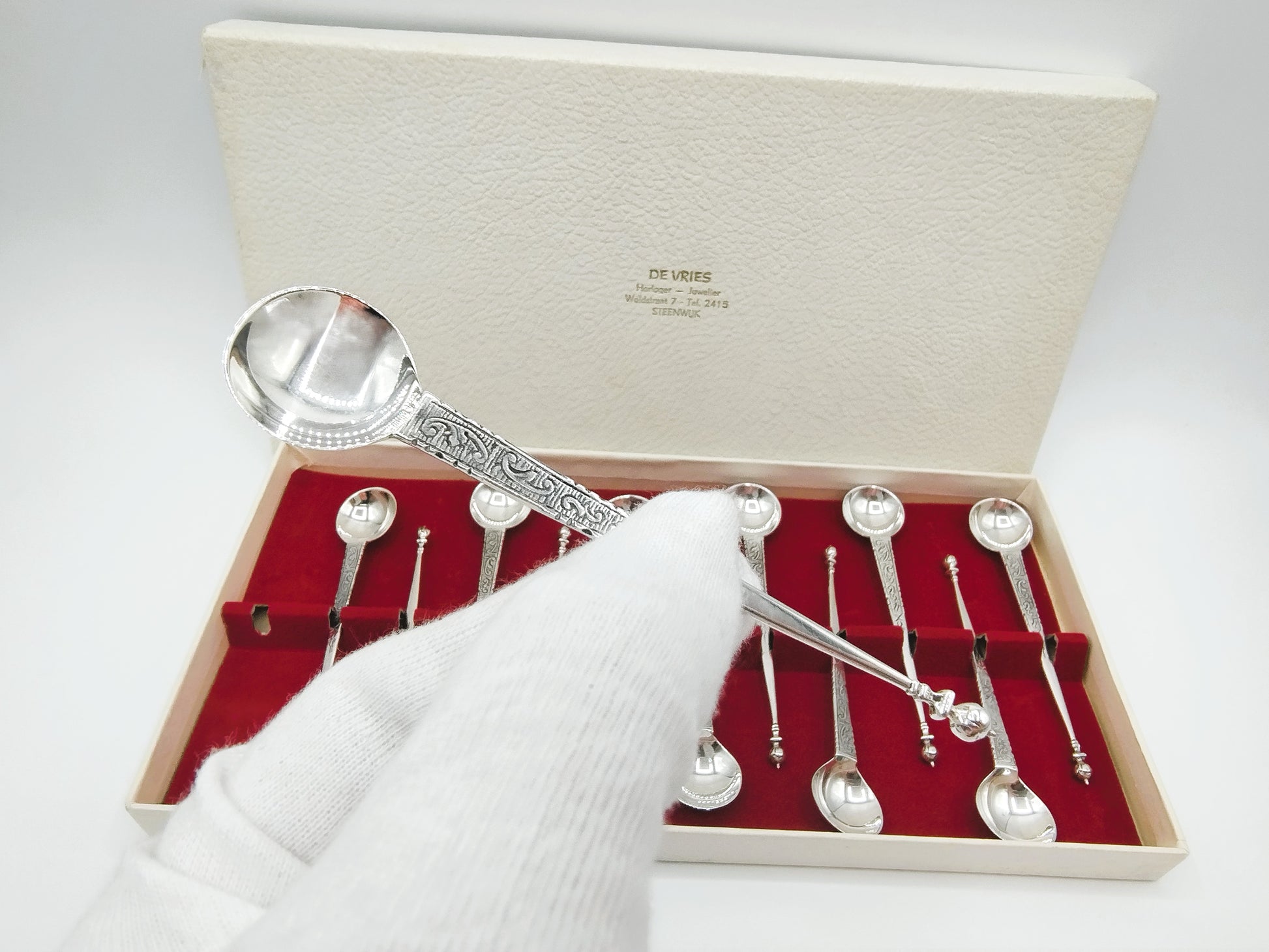 12-teiliges Set mit Teelöffeln der Fa. Bijkamp & Co aus Steenwijk. Dieses Meisterzeichen wurde zwischen 1946 und 1975 verwendet.