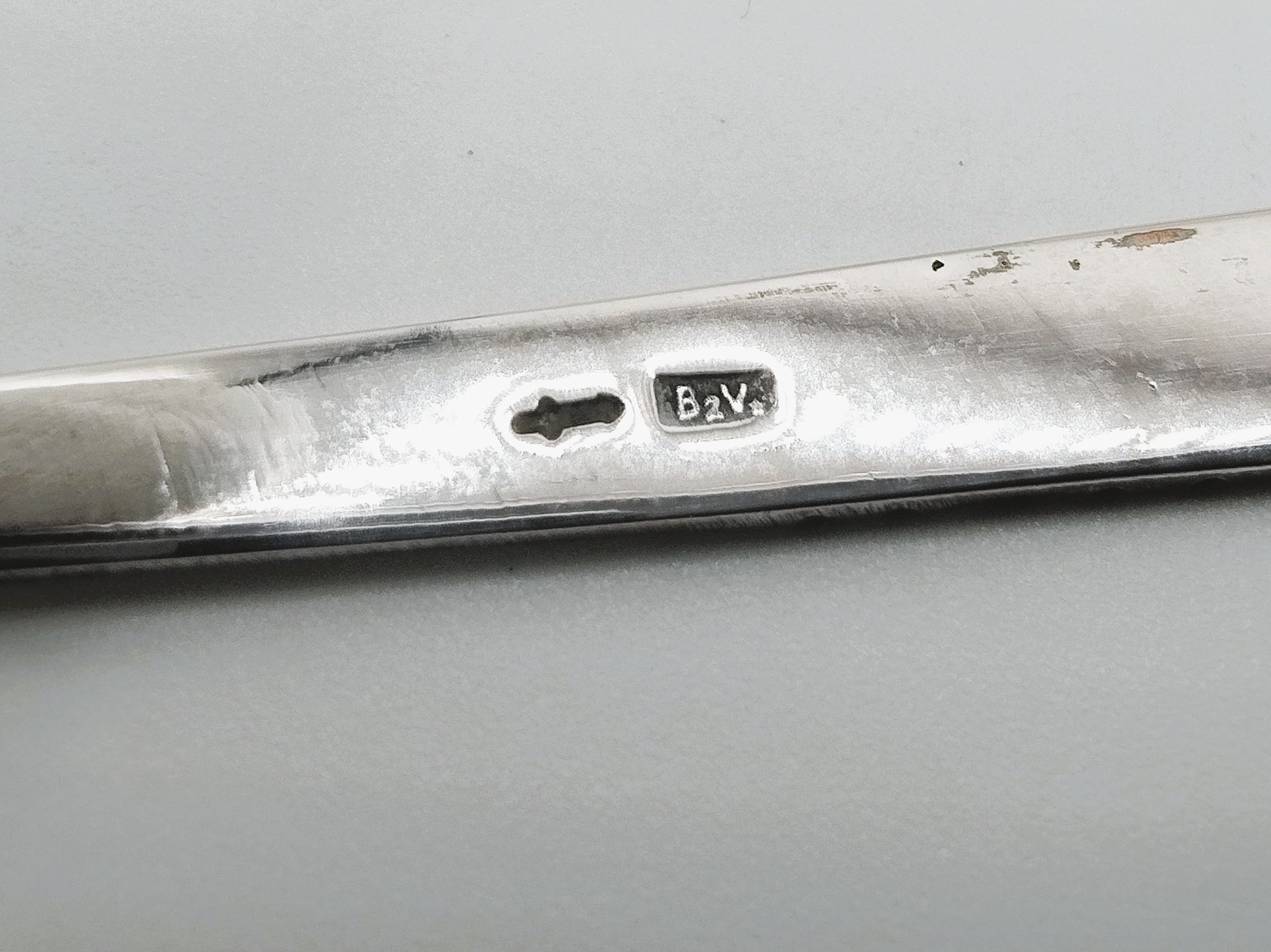 Die Löffel sind mit einer wunderschönen Gravur nach einem alten Vorbild aus dem 17. Jahrhundert versehen. Die Löffel sind mit der B2V-Meistermarke gekennzeichnet. Zusätzlich mit dem Schwert für Silber 2. Güteklasse gekennzeichnet.