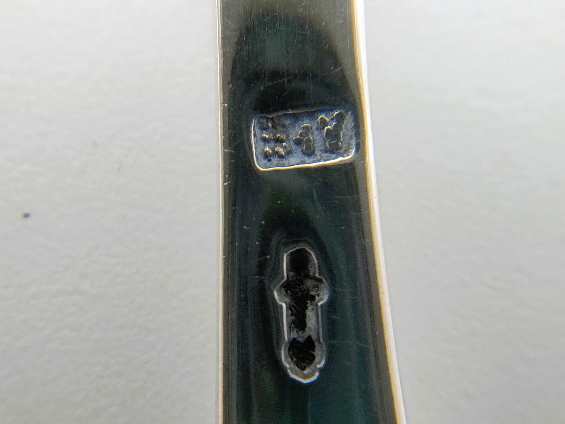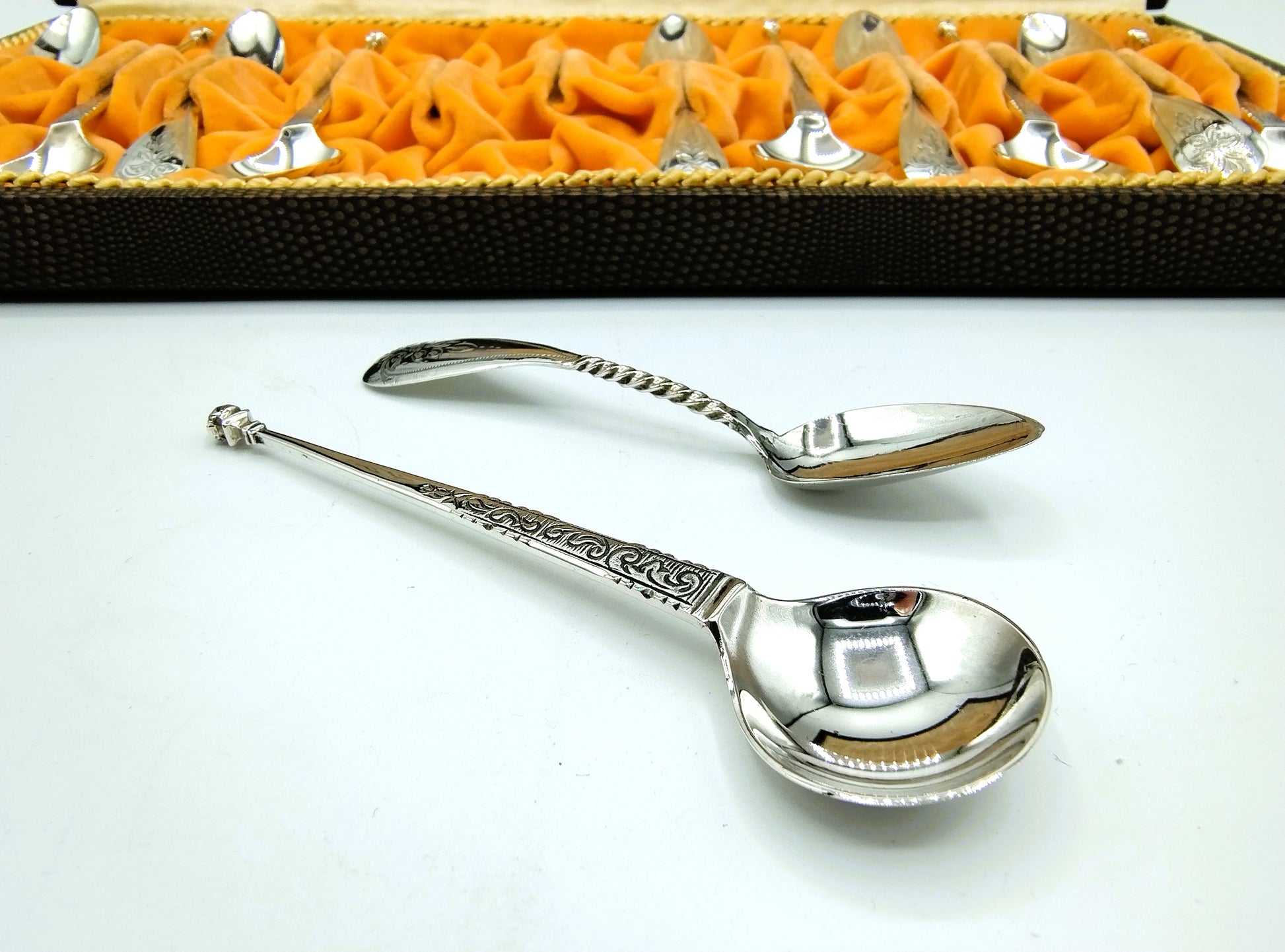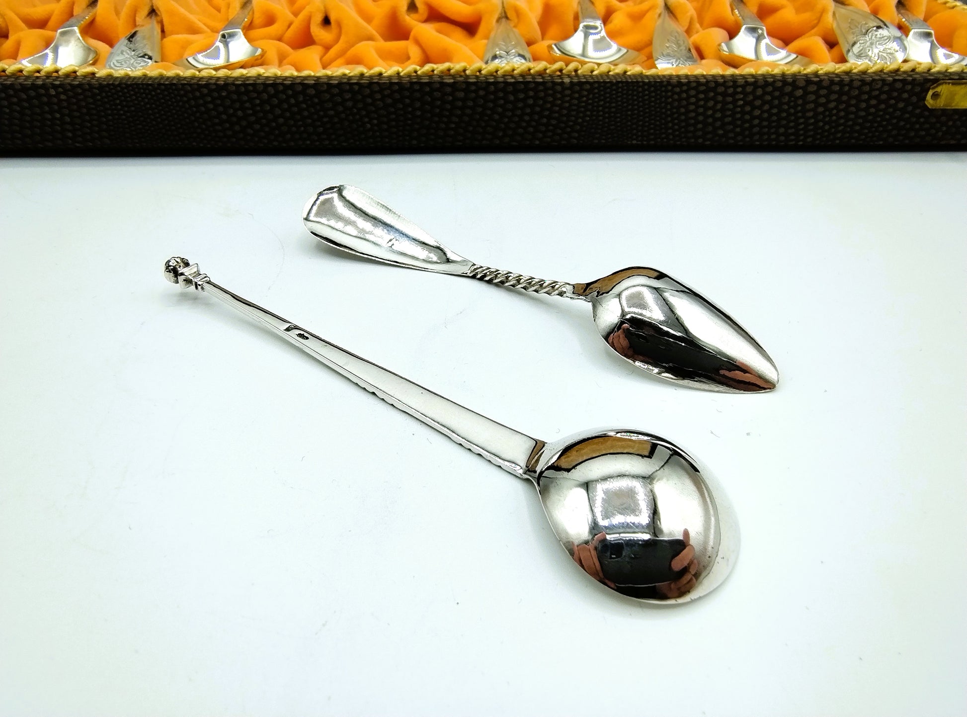 6 Löffel sind im Biedermeierstil dekoriert und mit der Meisterpunze PZ118 der Silberschmiede Suur versehen. 6 Löffel haben eine schöne Gravur nach einem alten Vorbild aus dem 17. Jahrhundert, markiert mit der Meistermarke B1V der Fa. Bijkamp & Co.