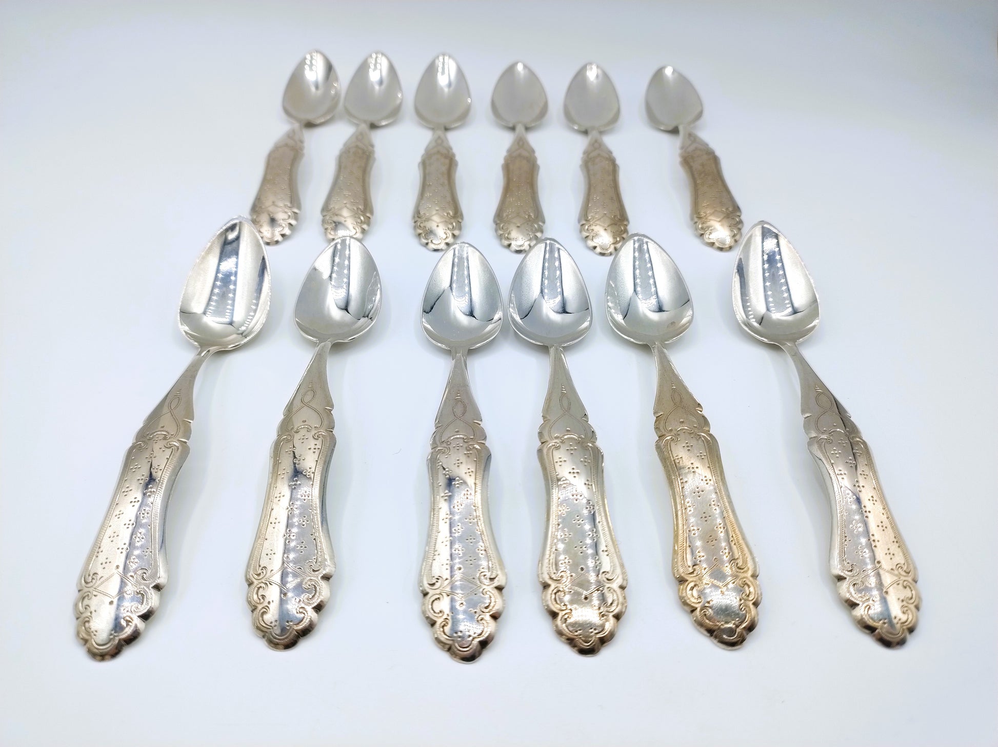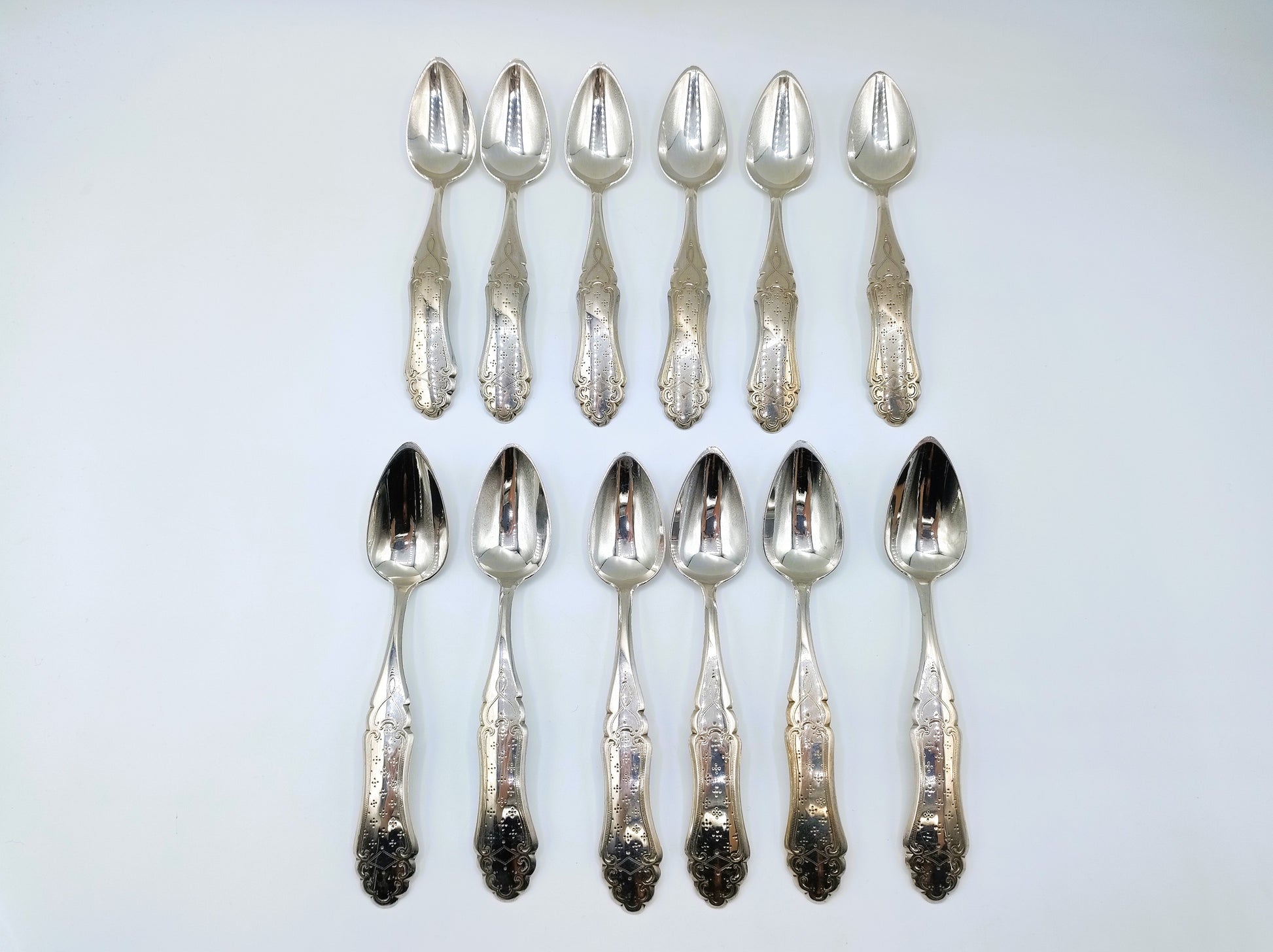 Set mit 12 silbernen Teelöffeln im Biedermeier-Stil, hergestellt vom Silberschmied G. Kuylenburg aus Schoonhoven / Weesp. Aktiv von 1867 bis 1877.