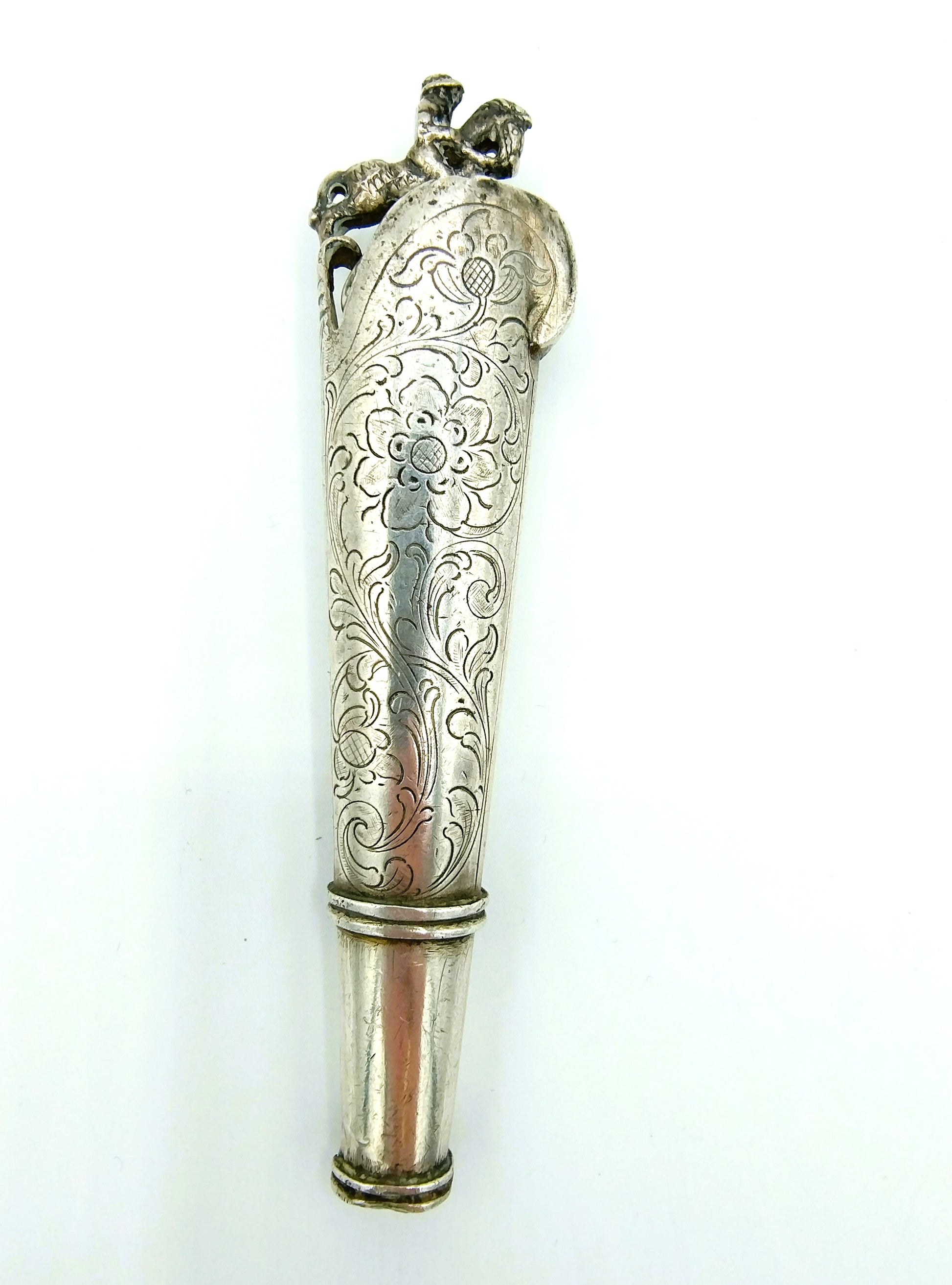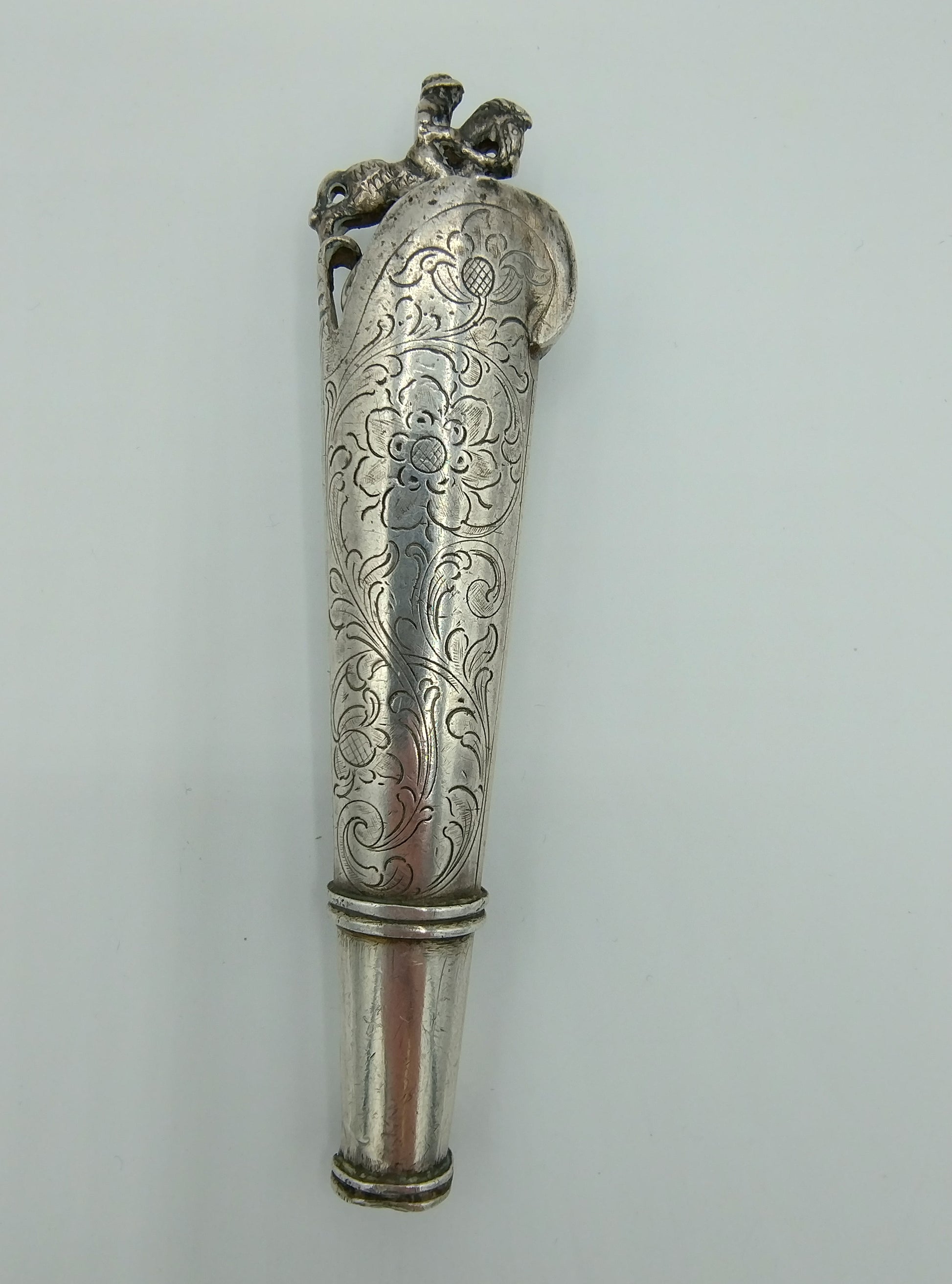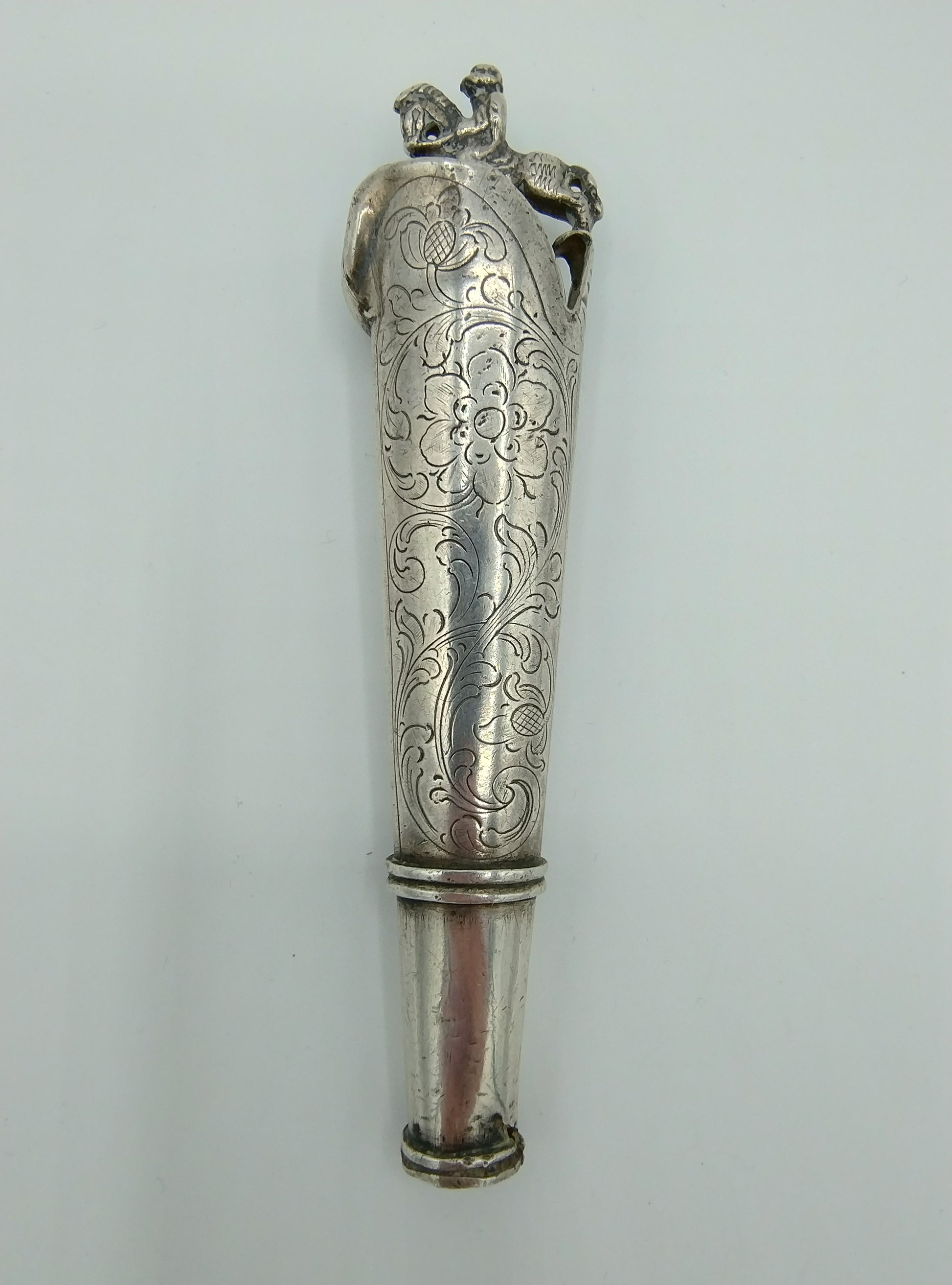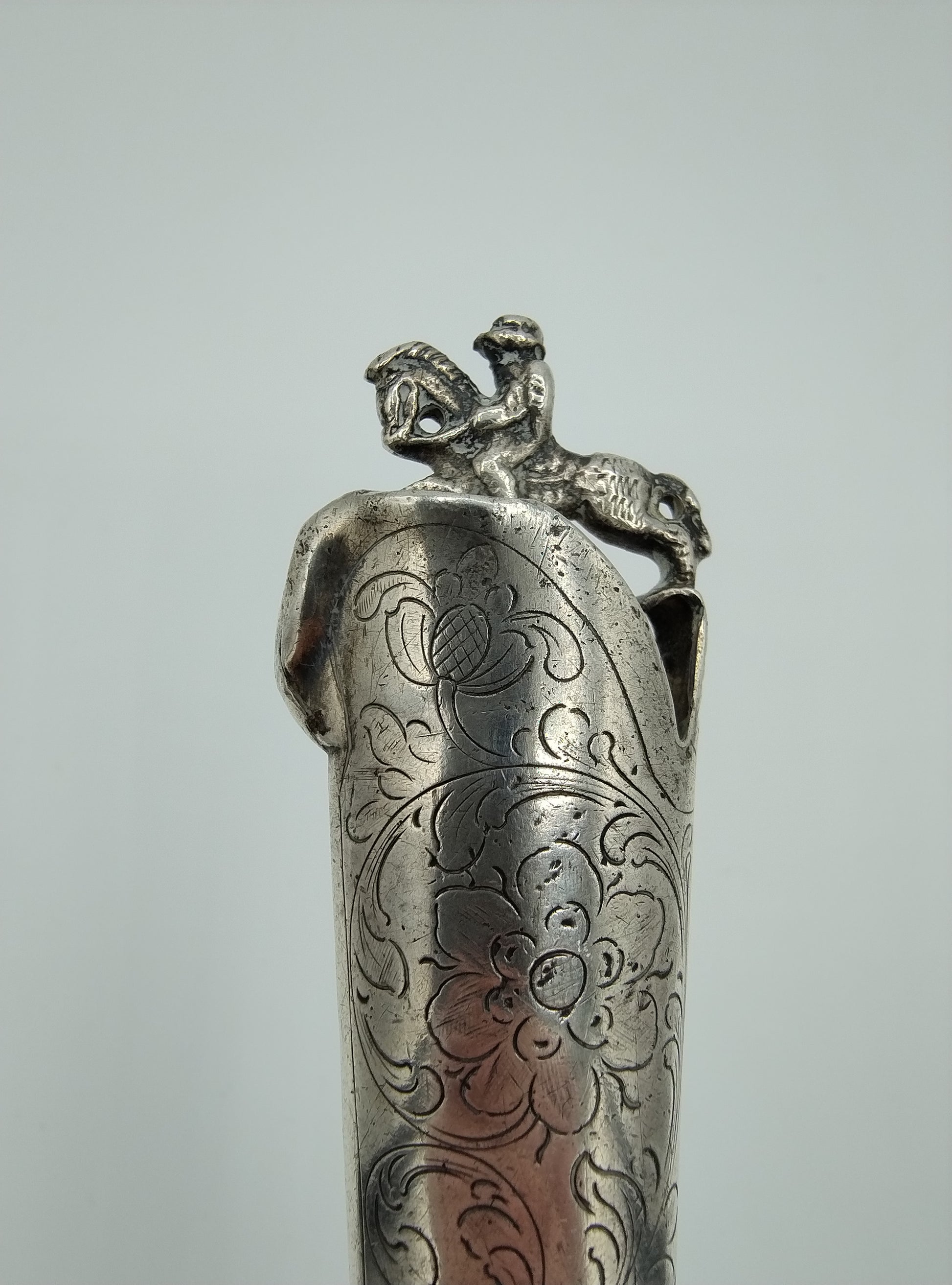 Silberner Messergriff aus dem 18. Jahrhundert mit Blumendekor. Der Messergriff ist mit einem Reiter zu Pferd bekrönt.