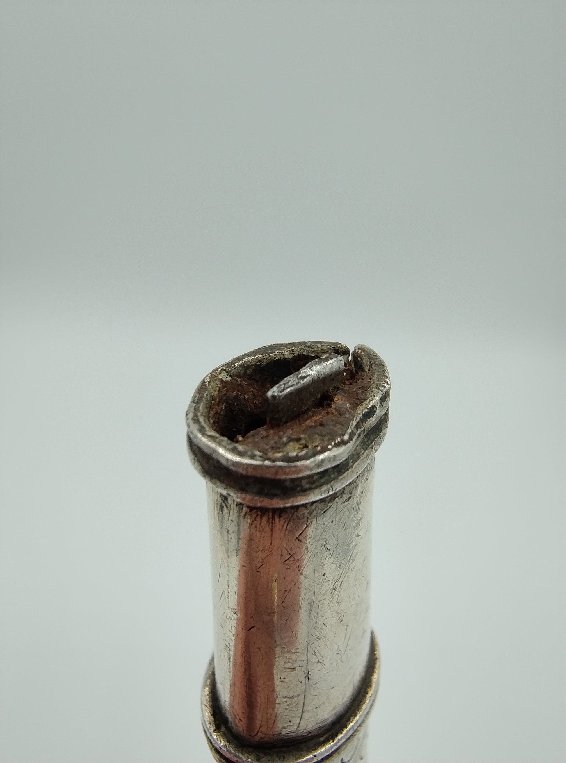An der Unterseite des Griffs befindet sich ein kleiner Riss von 8 mm. Die Klinge fehlt, diese könnte aber von einem Silberschmied wieder eingesetzt werden.
