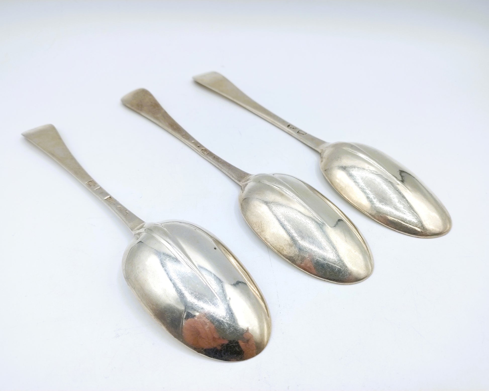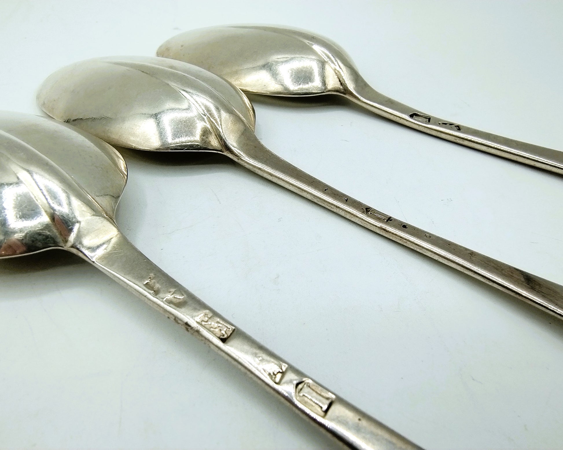 3 Silberlöffel aus dem 18. Jahrhundert . Die Löffel haben am Kopf eine sogenannte Rattail-Verbindung.