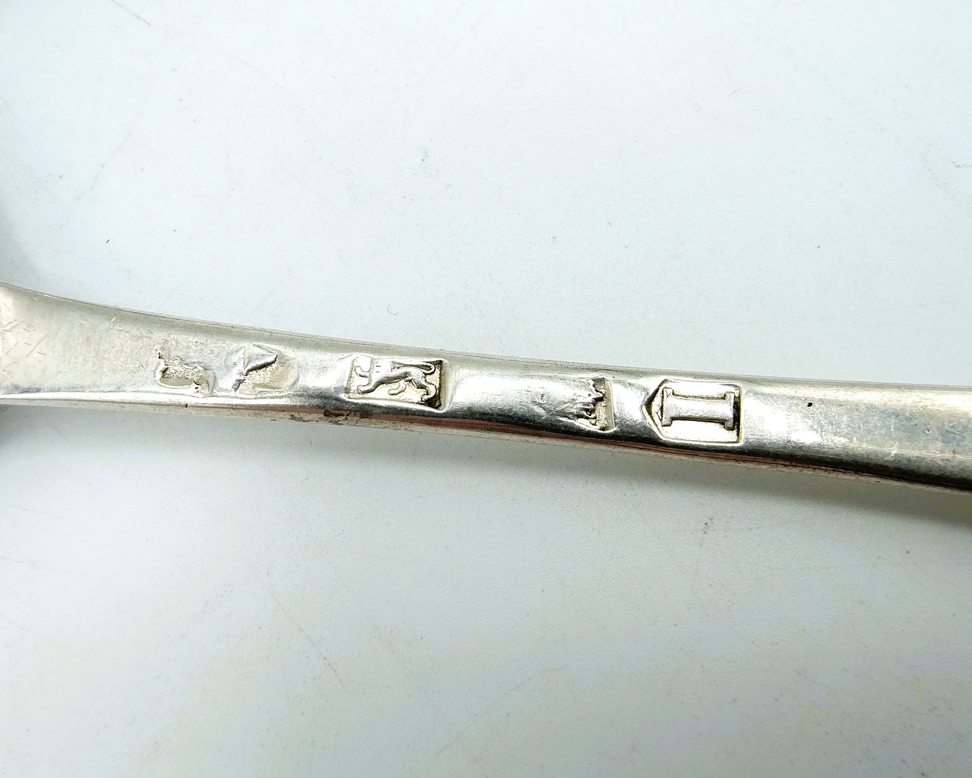 Die Löffel sind mit einem unleserlichen Meisterpunzenzeichen (ermöglicht durch William Scarlett), dem London City Hallmark, einem englischen Löwen und dem Jahresbuchstaben I für 1724 versehen.