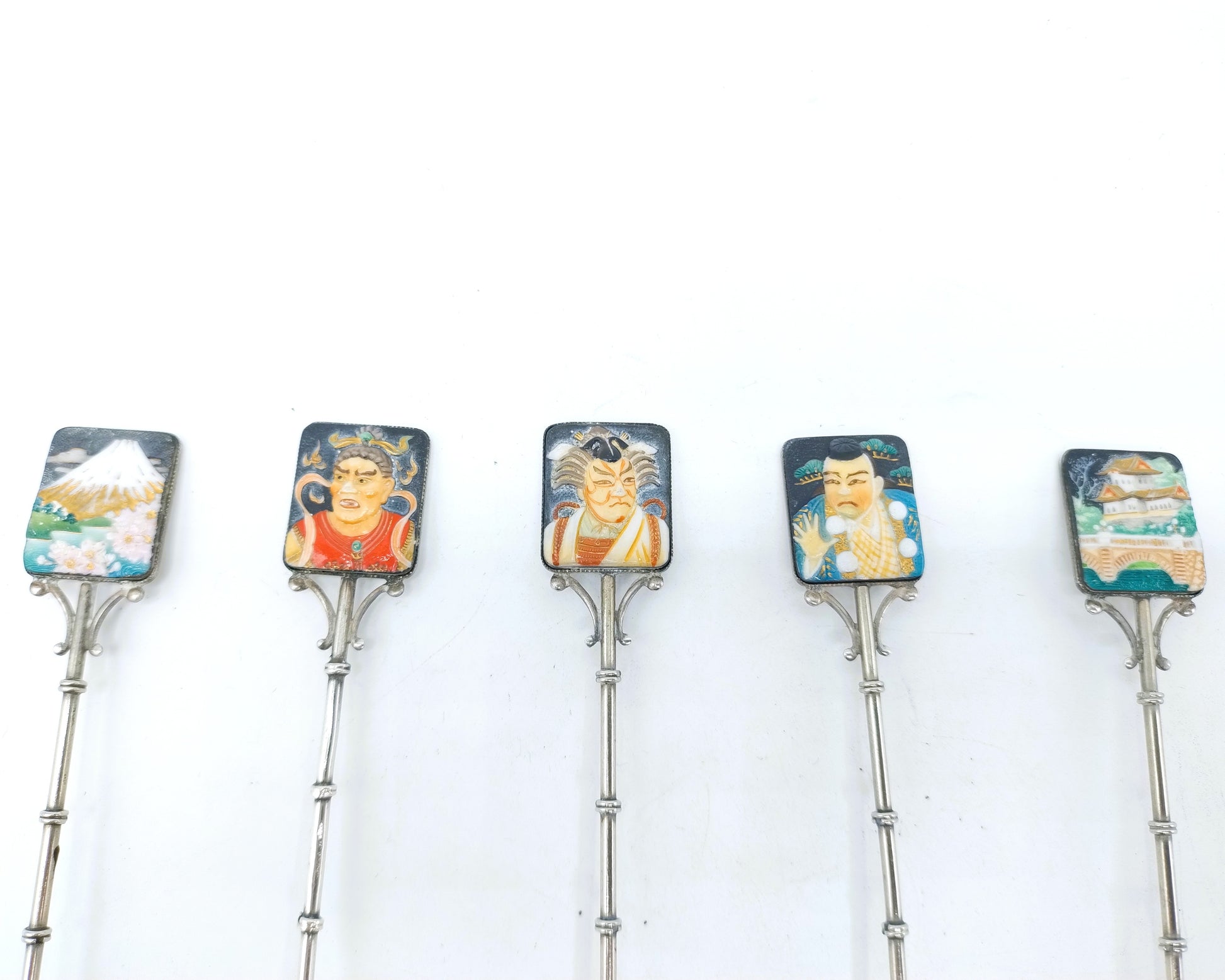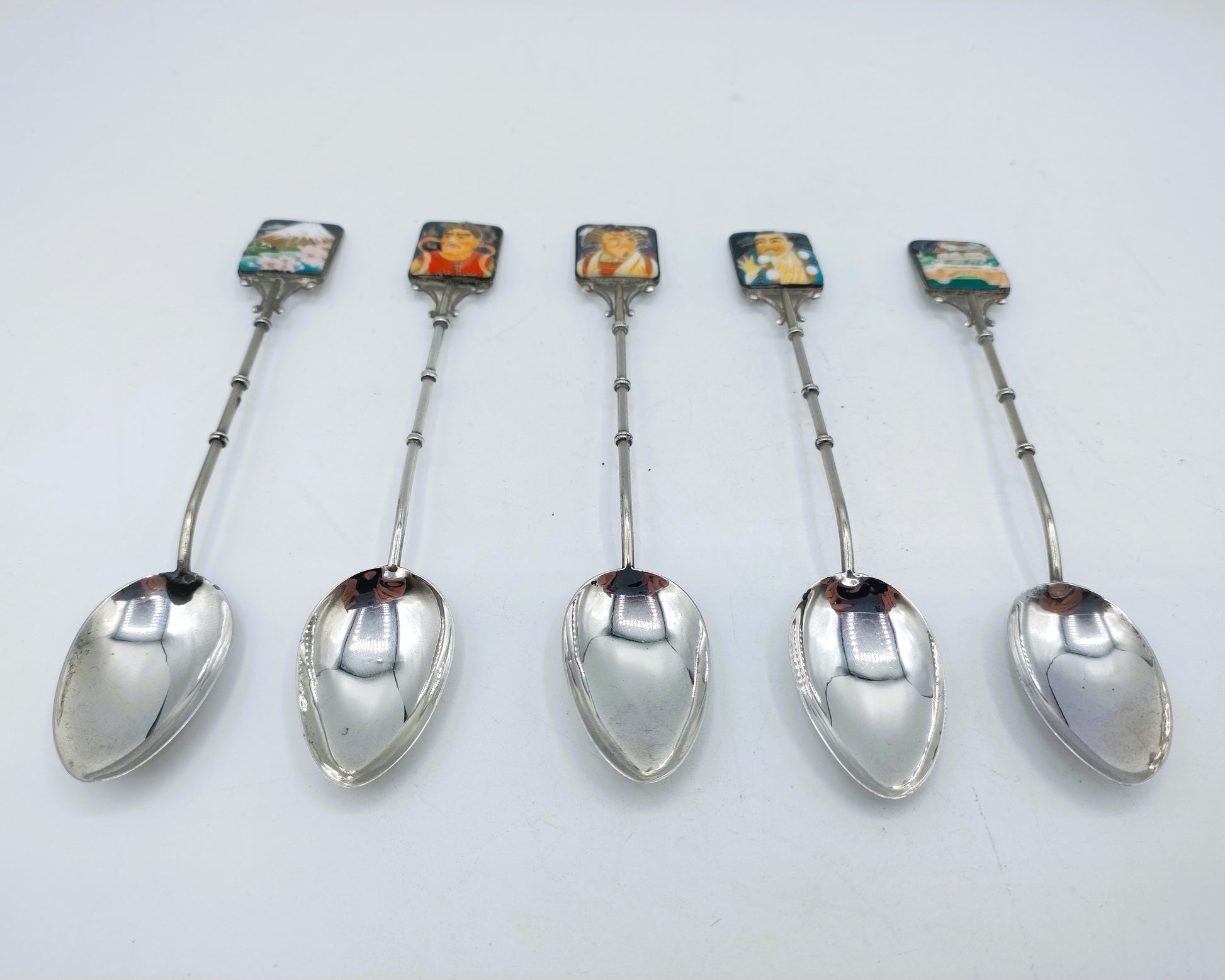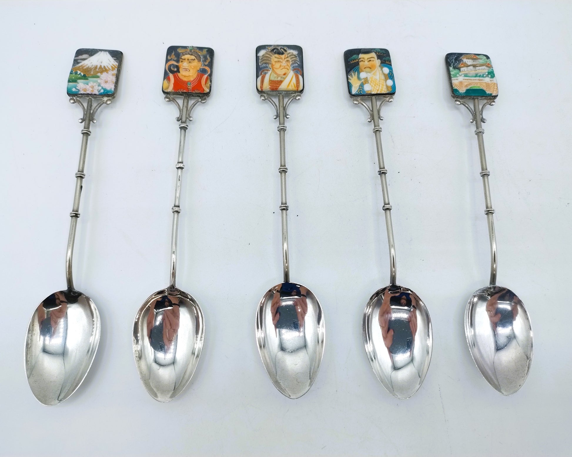5 Vintage-Löffel mit Porzellanfliesen unter anderem vom Berg Fuji.