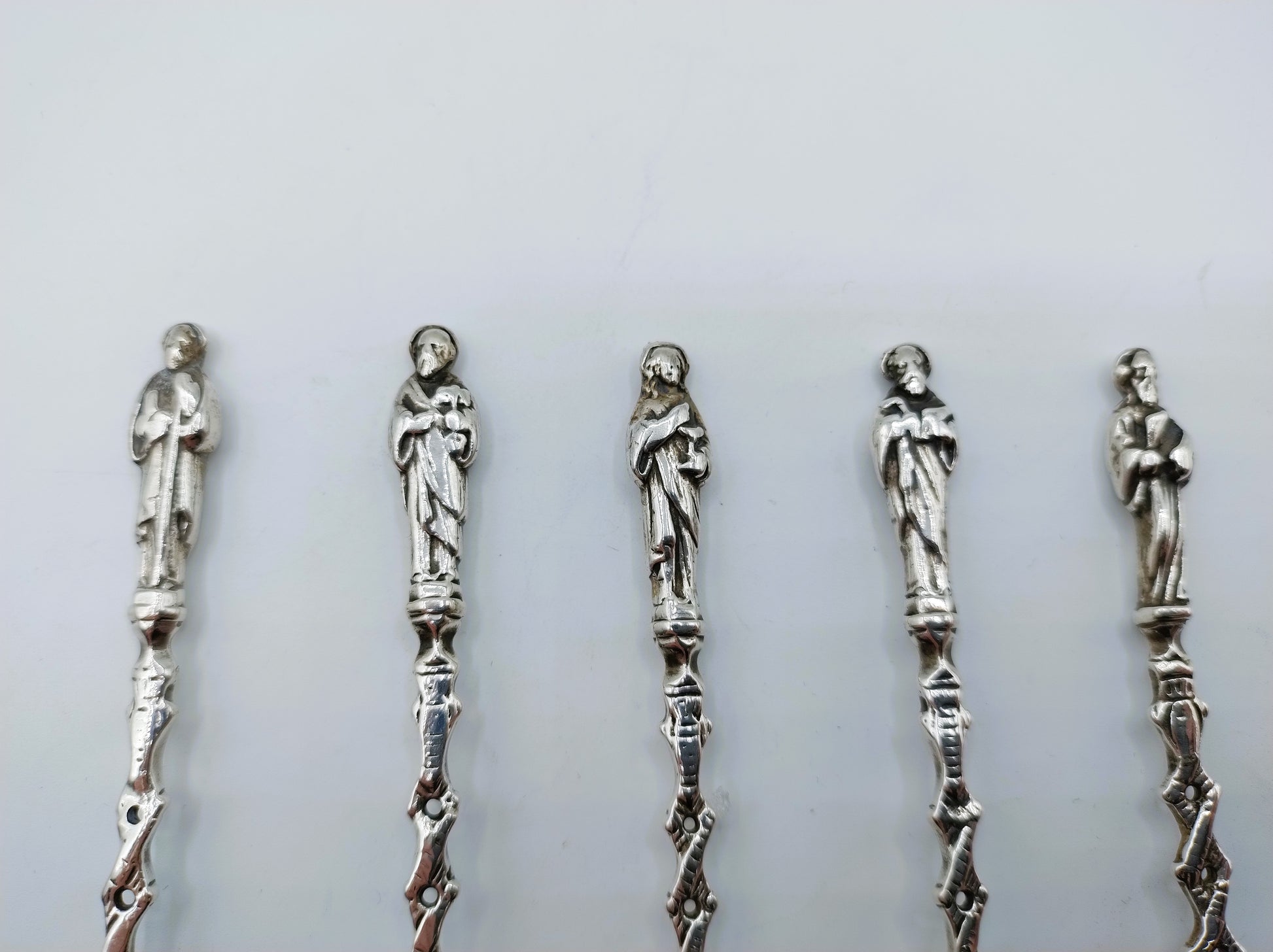 Silberne Apostellöffel mit 5 verschiedenen Aposteln. Die Löffel wurden vom Schmiedemeister D. de Jong Wzn aus Groningen hergestellt. Er arbeitete von 1899 bis 1942.