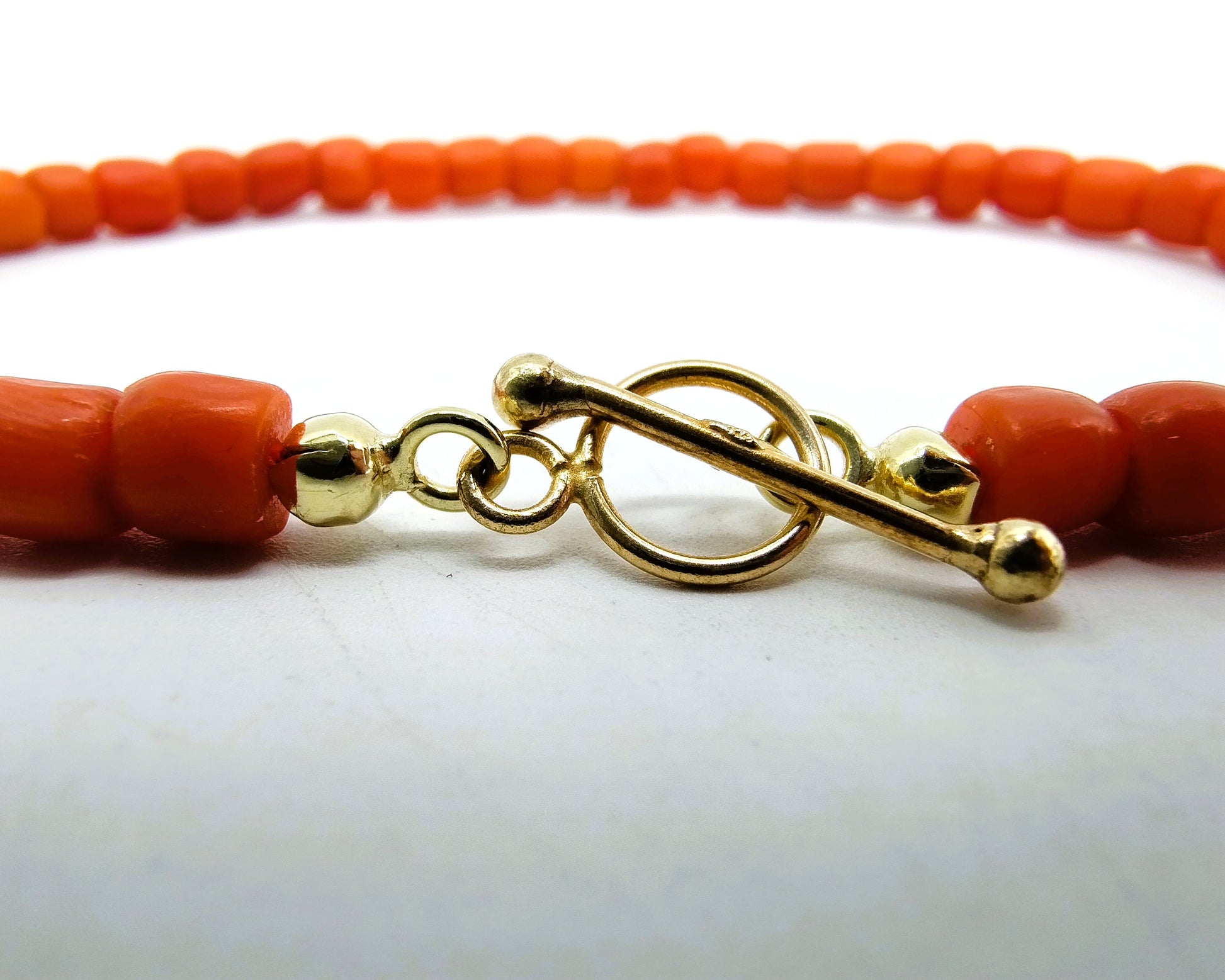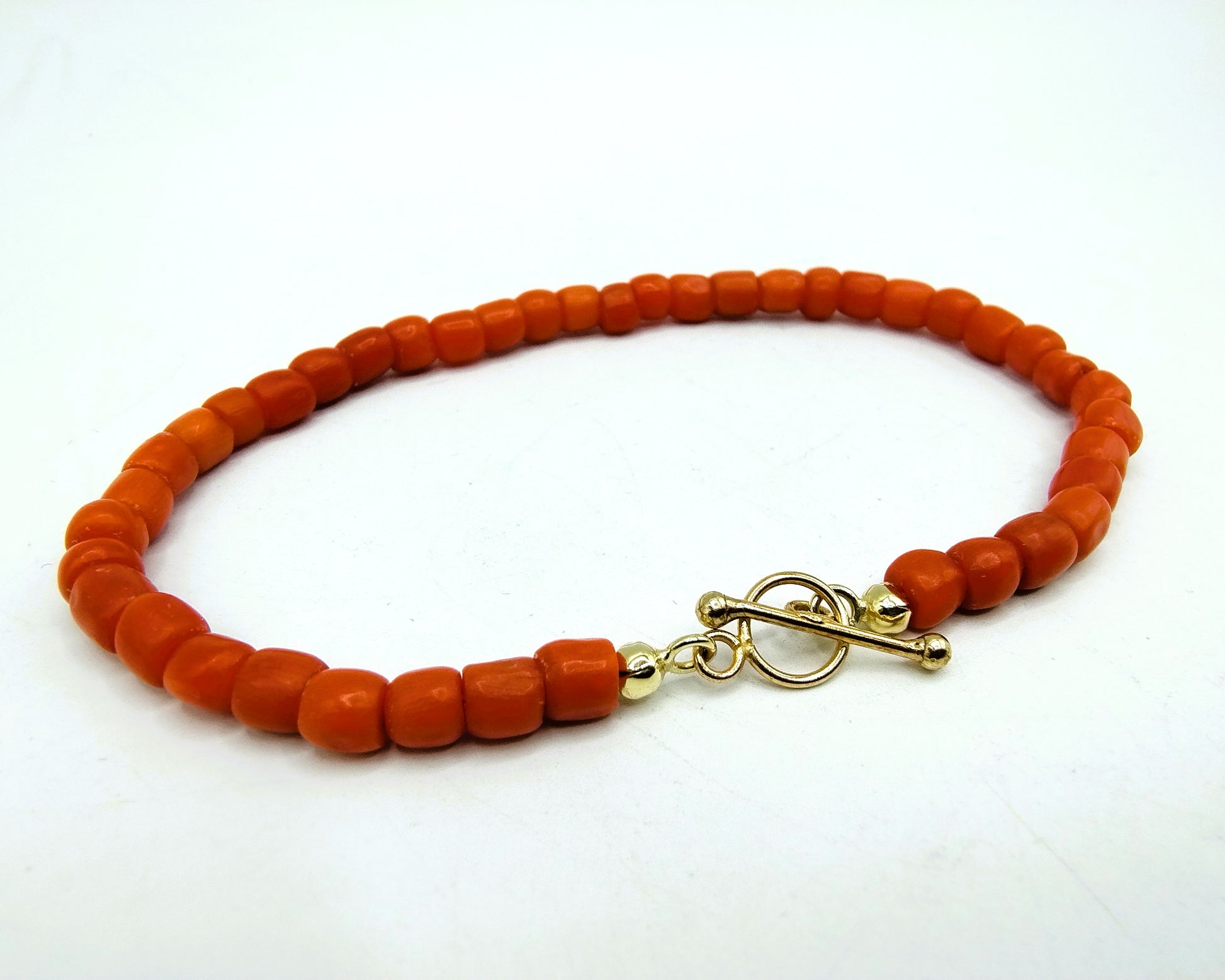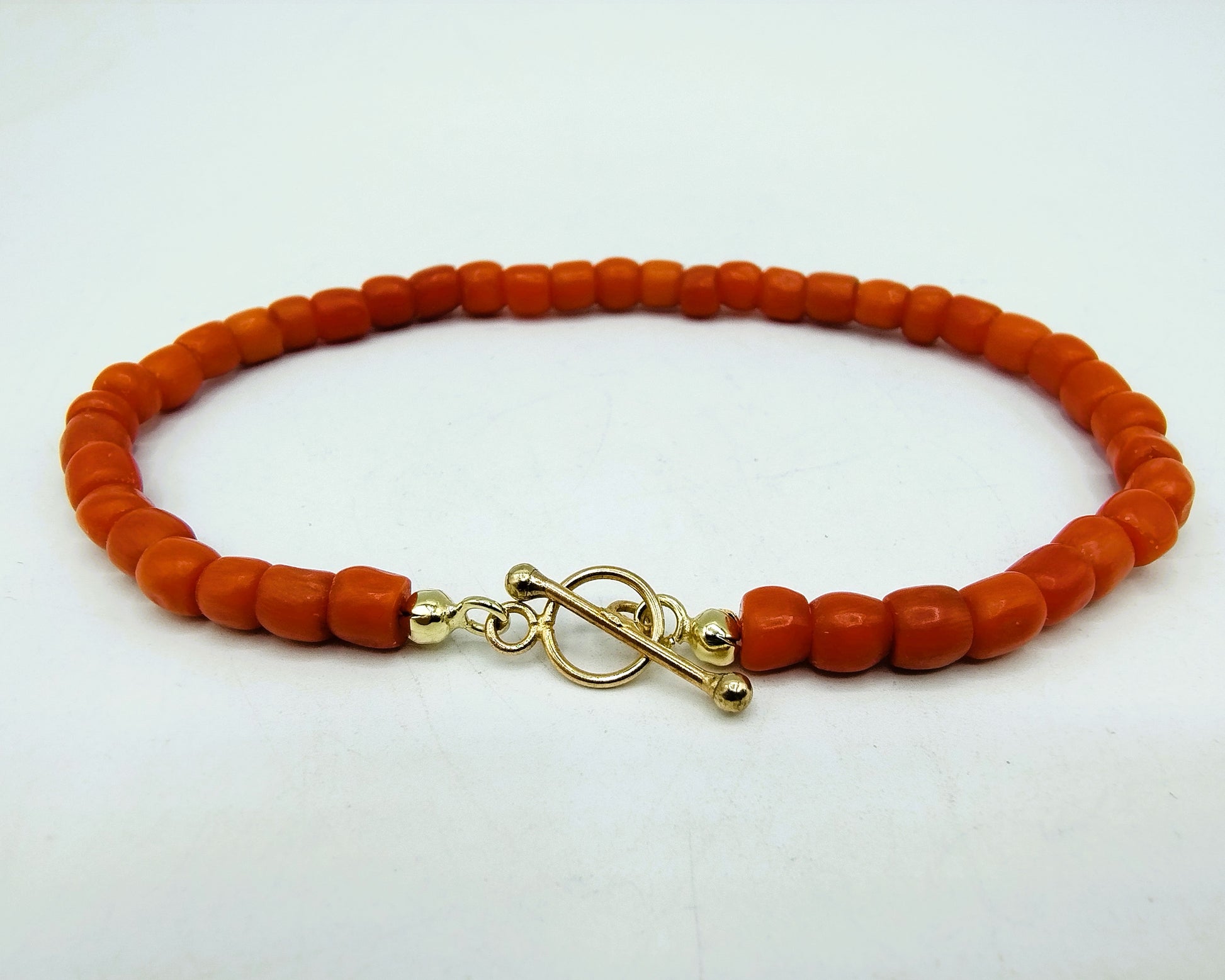 Rotes Korallenarmband mit goldenem Knebelverschluss. Die Perlen haben einen Durchmesser von 4 mm.