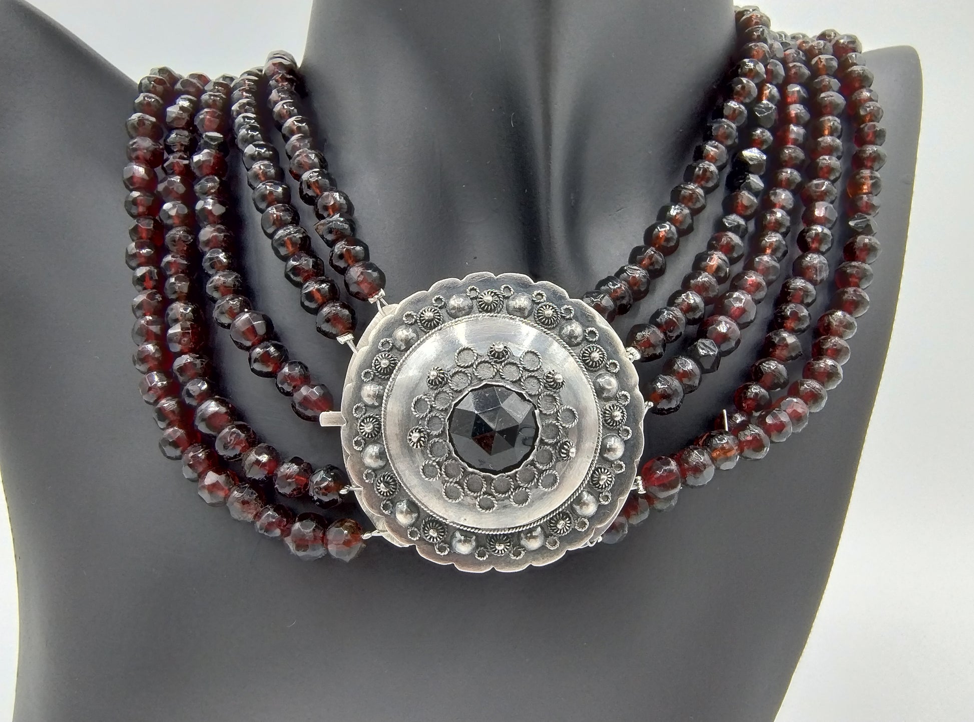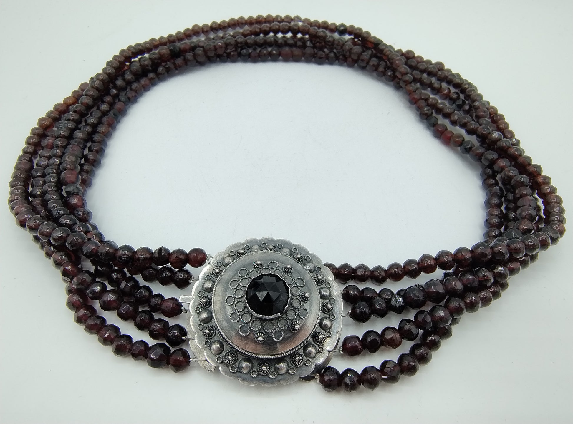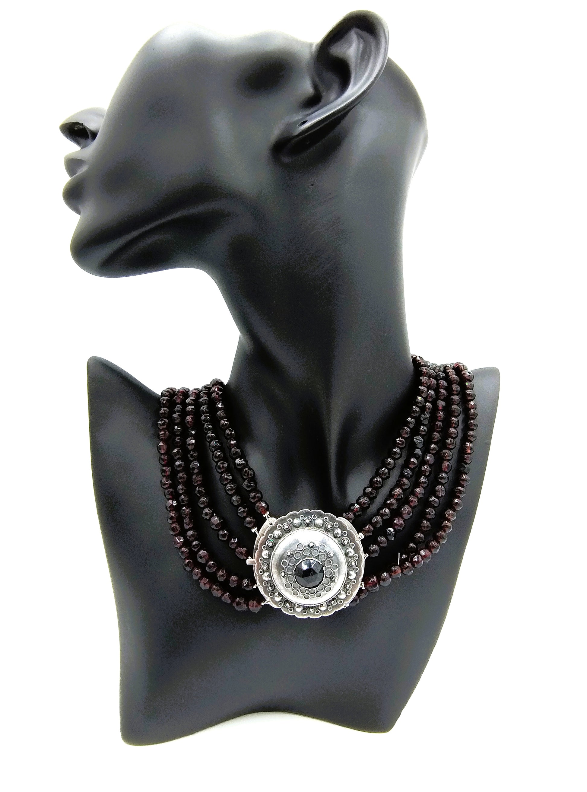 Glasgranaten-Halskette mit 5 Strängen, verbunden mit einem robusten Silberverschluss.