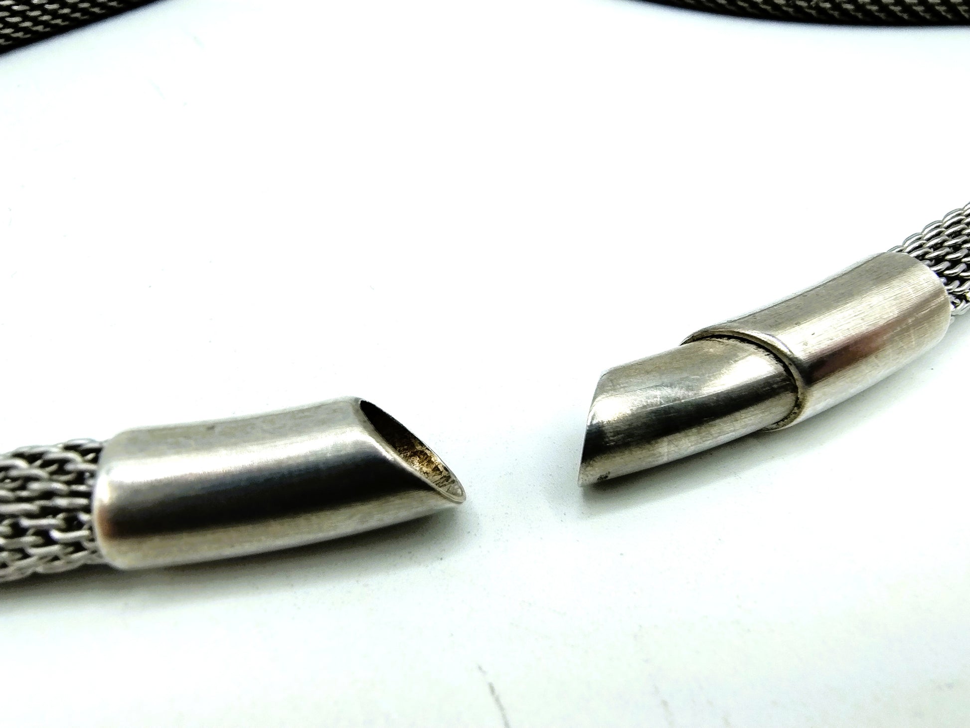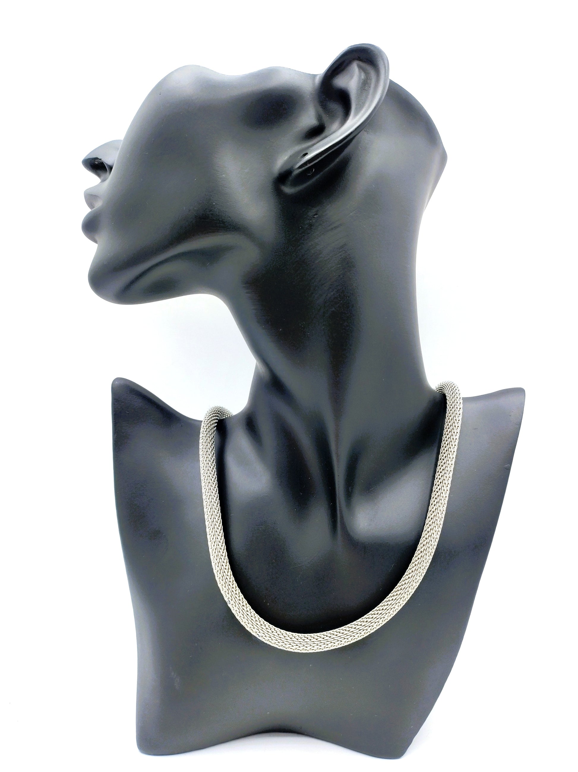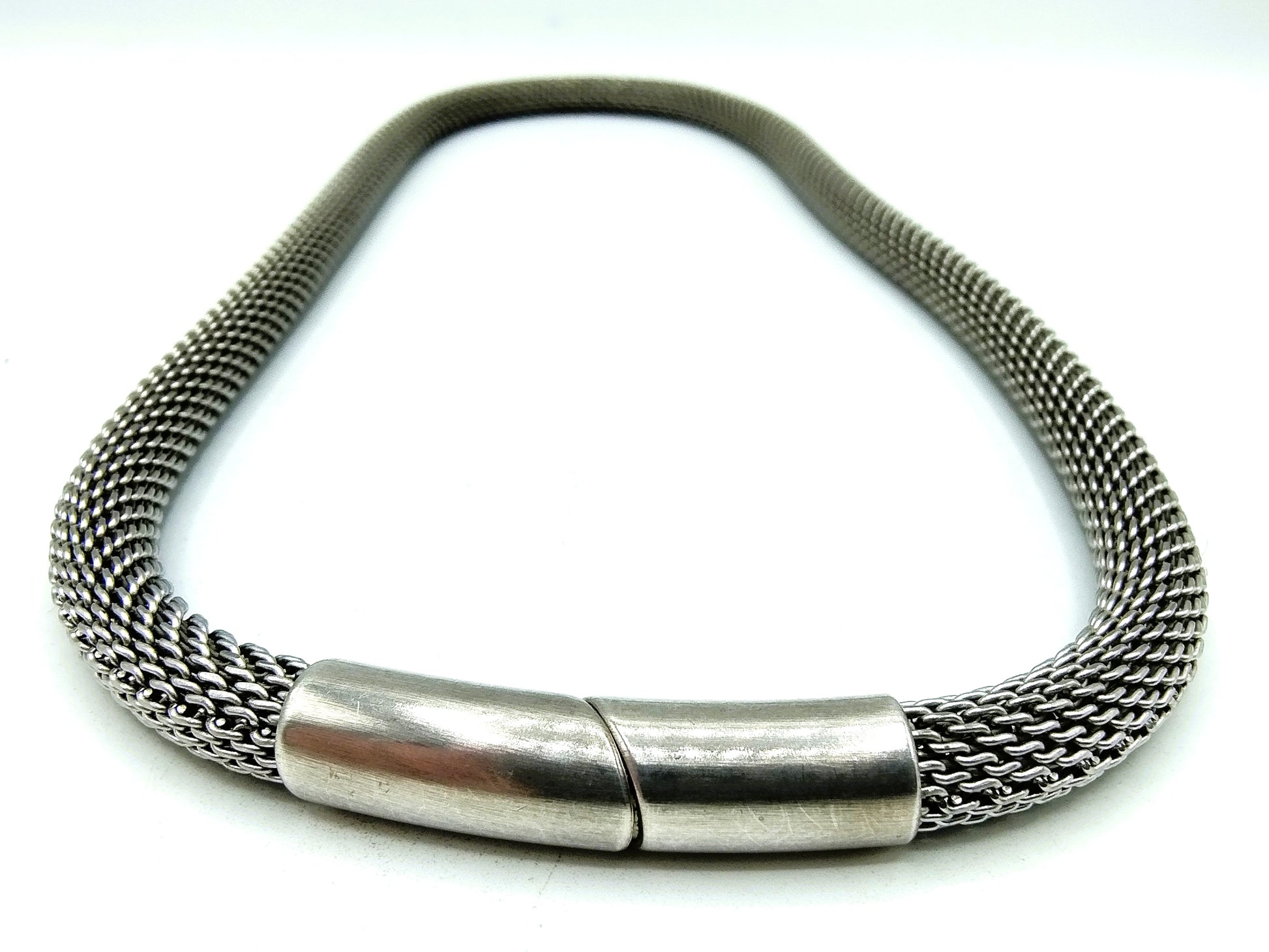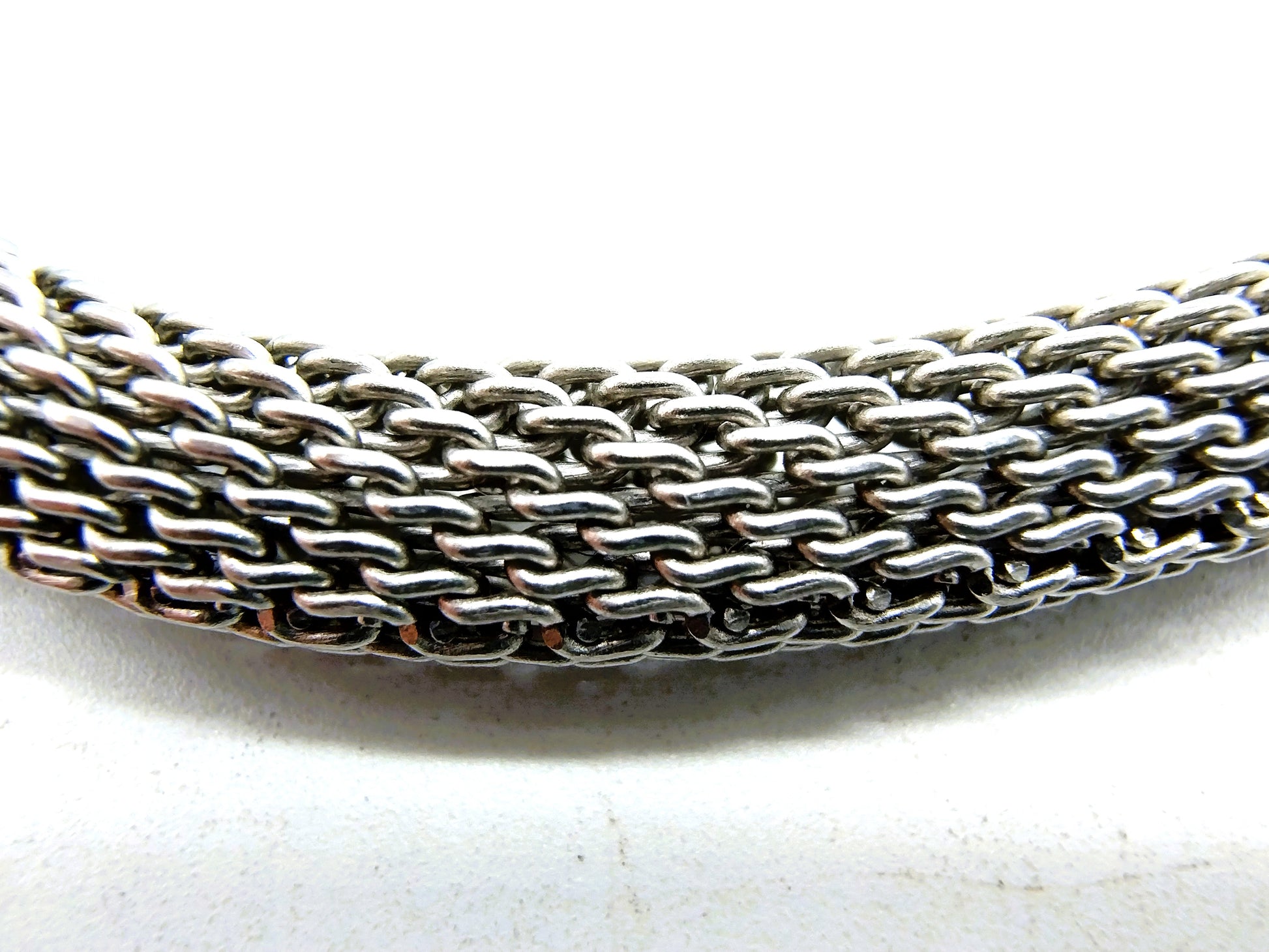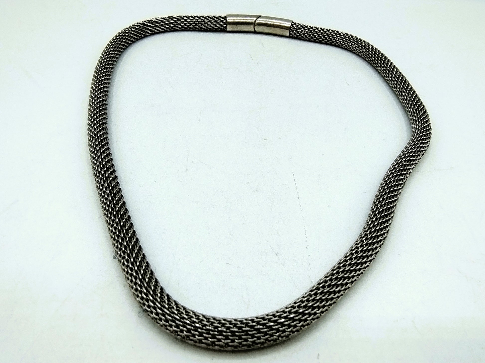 Geflochtene Edelstahlkette mit silbernem Verschluss.