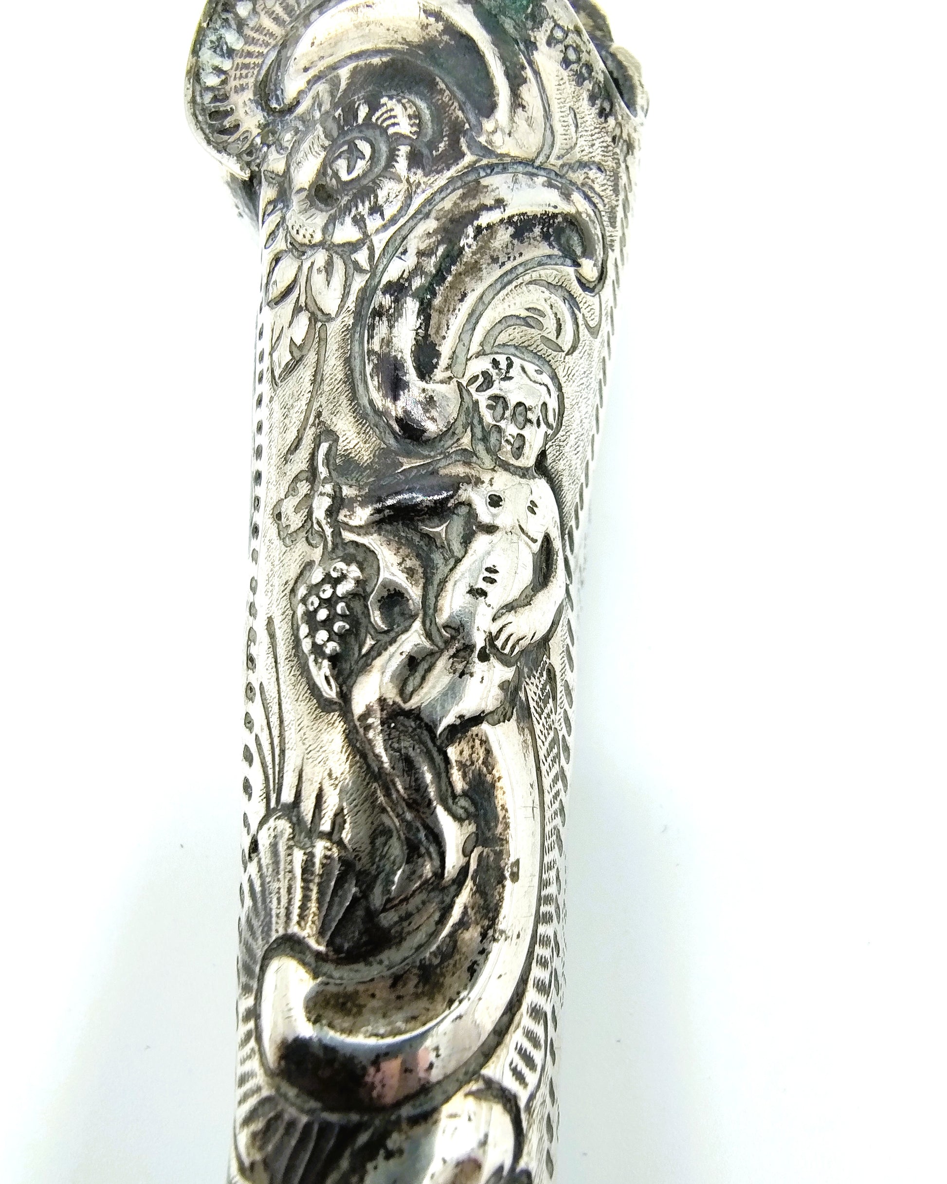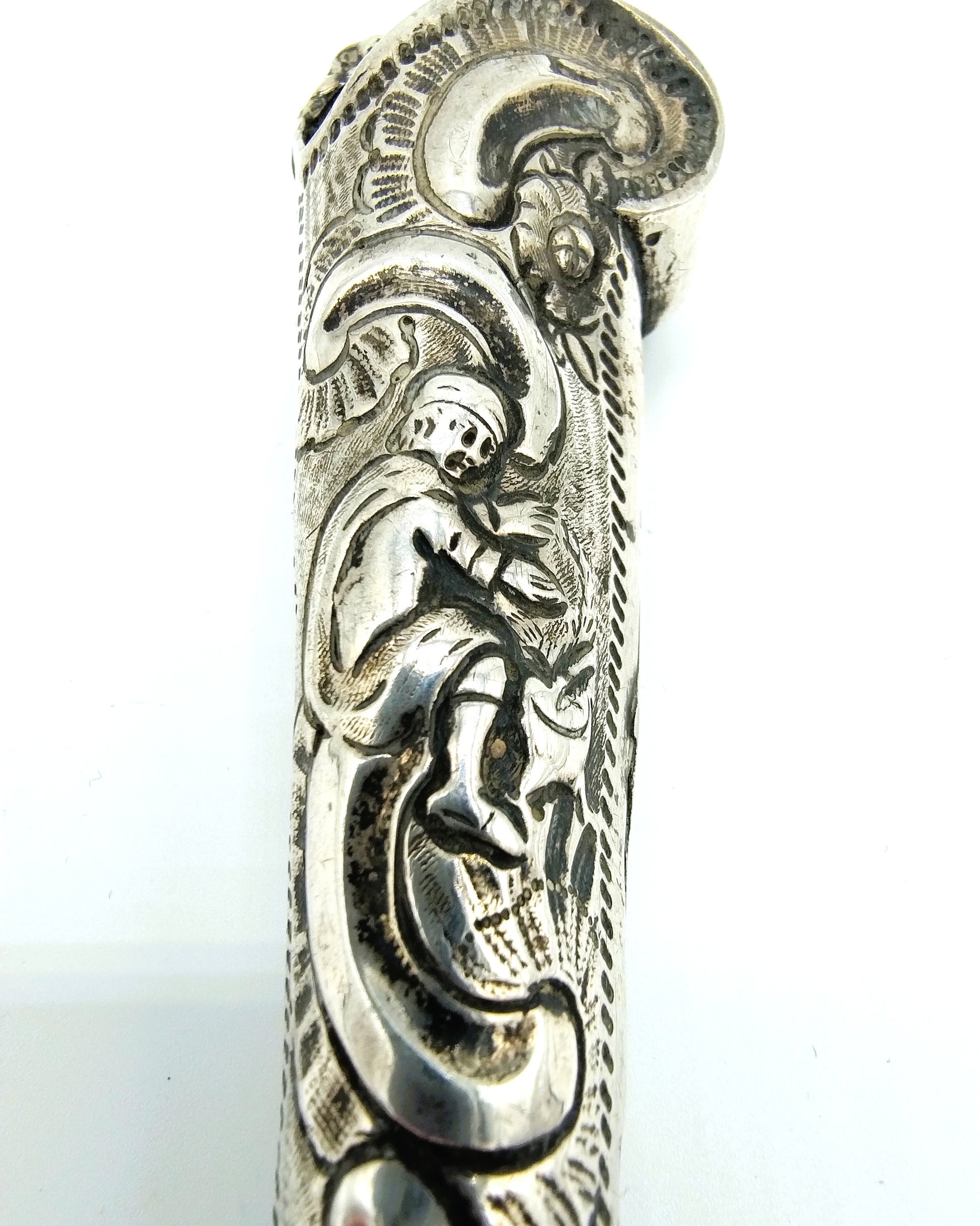 Das Messer wird von einem Reiter zu Pferd gekrönt. Die Klinge ist original und genauso alt wie der Griff.