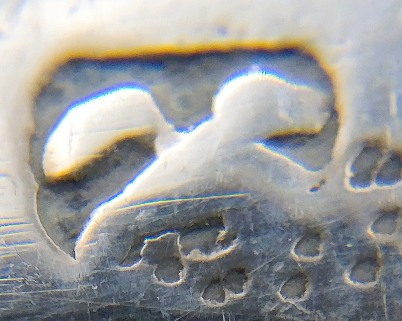 Der Name des Erstbesitzers , LK Surveyor, ist außen am Griff eingraviert. Außerdem trägt er die Jahreszahl 1813. Das Messer ist mit der Meistermarke eines Vogels (Voet C28) punziert, die von Ate Offringa verwendet wurde.