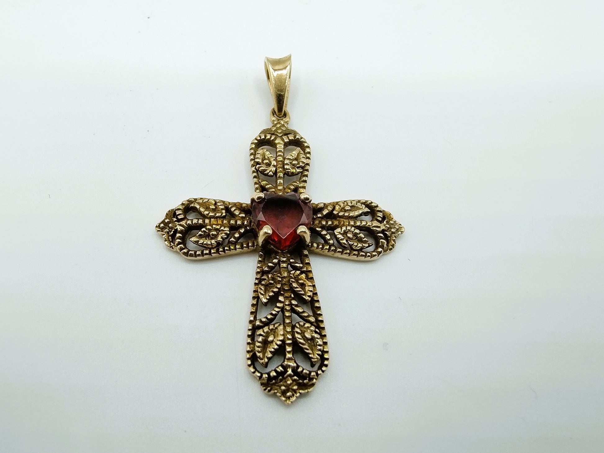 Goldener Kreuzanhänger mit einem herzförmigen Granatschliff.