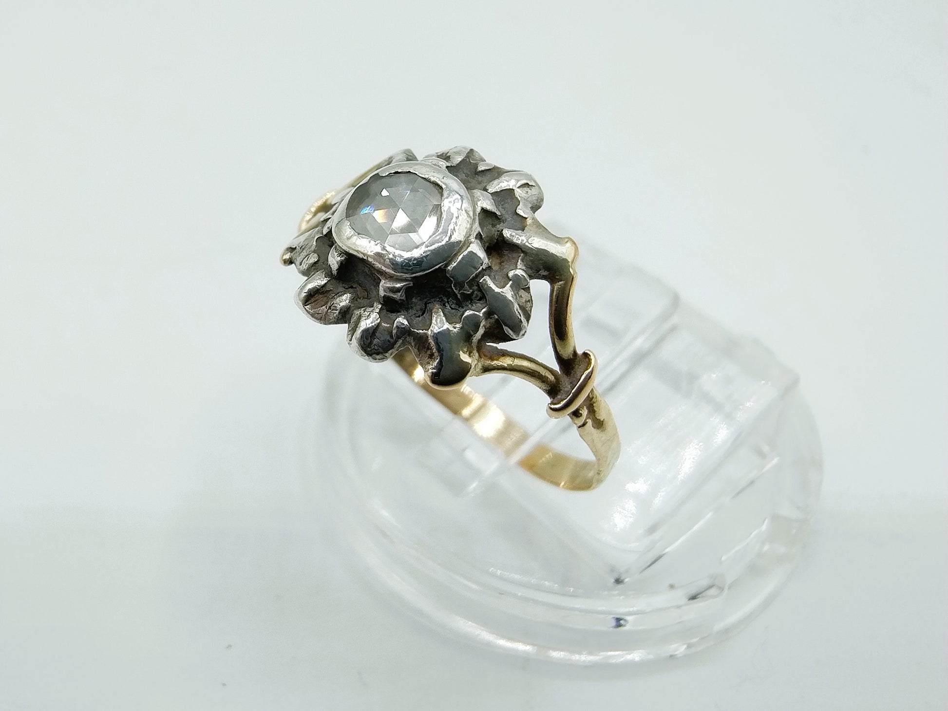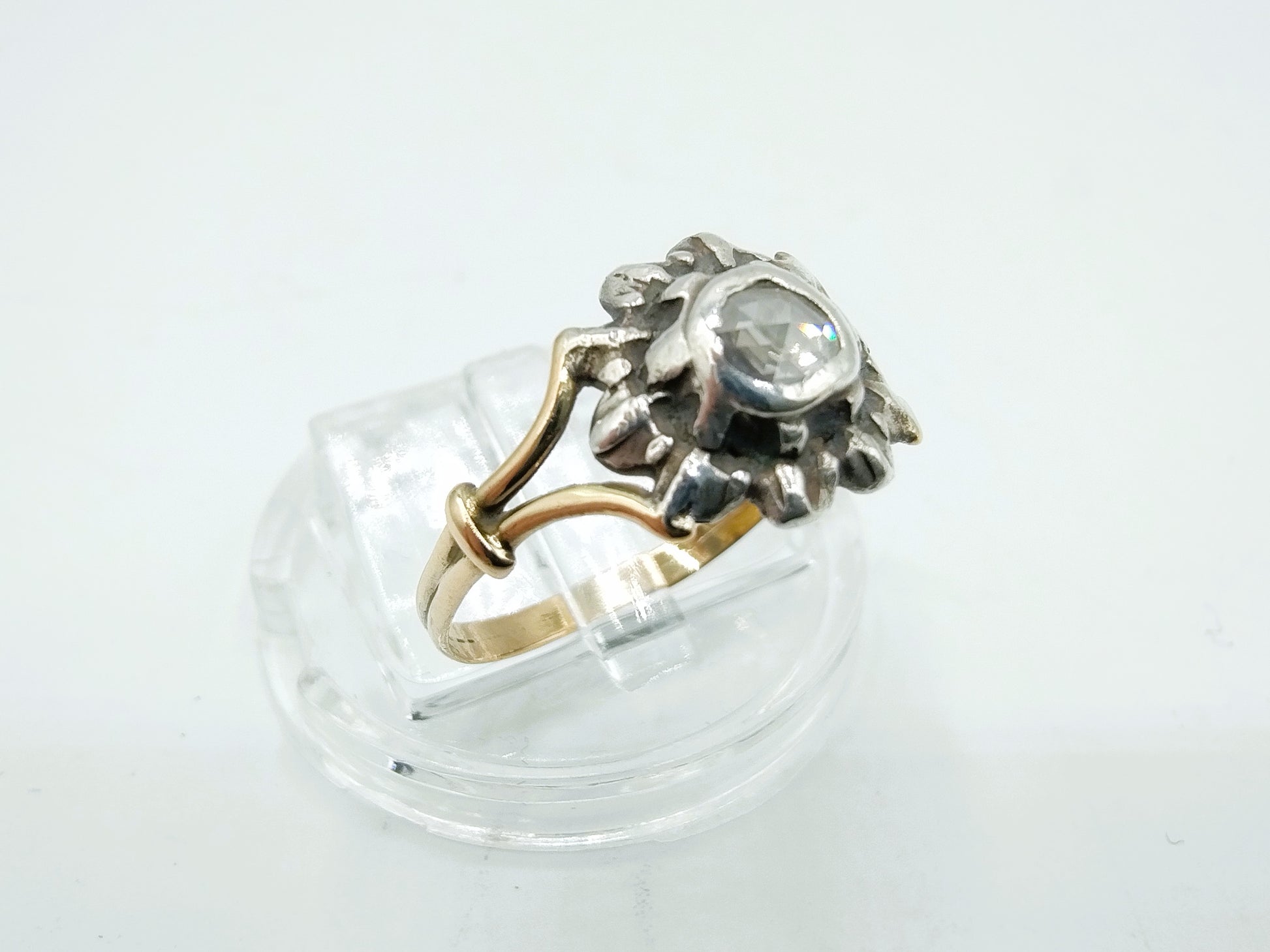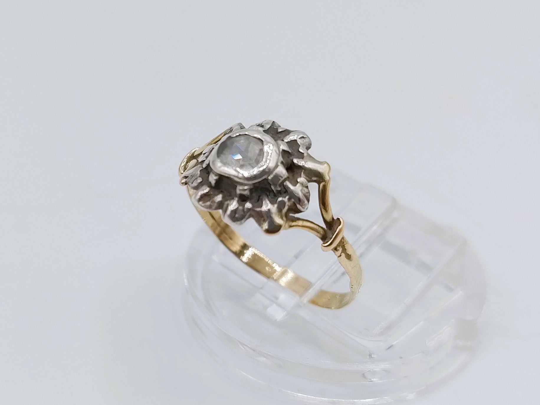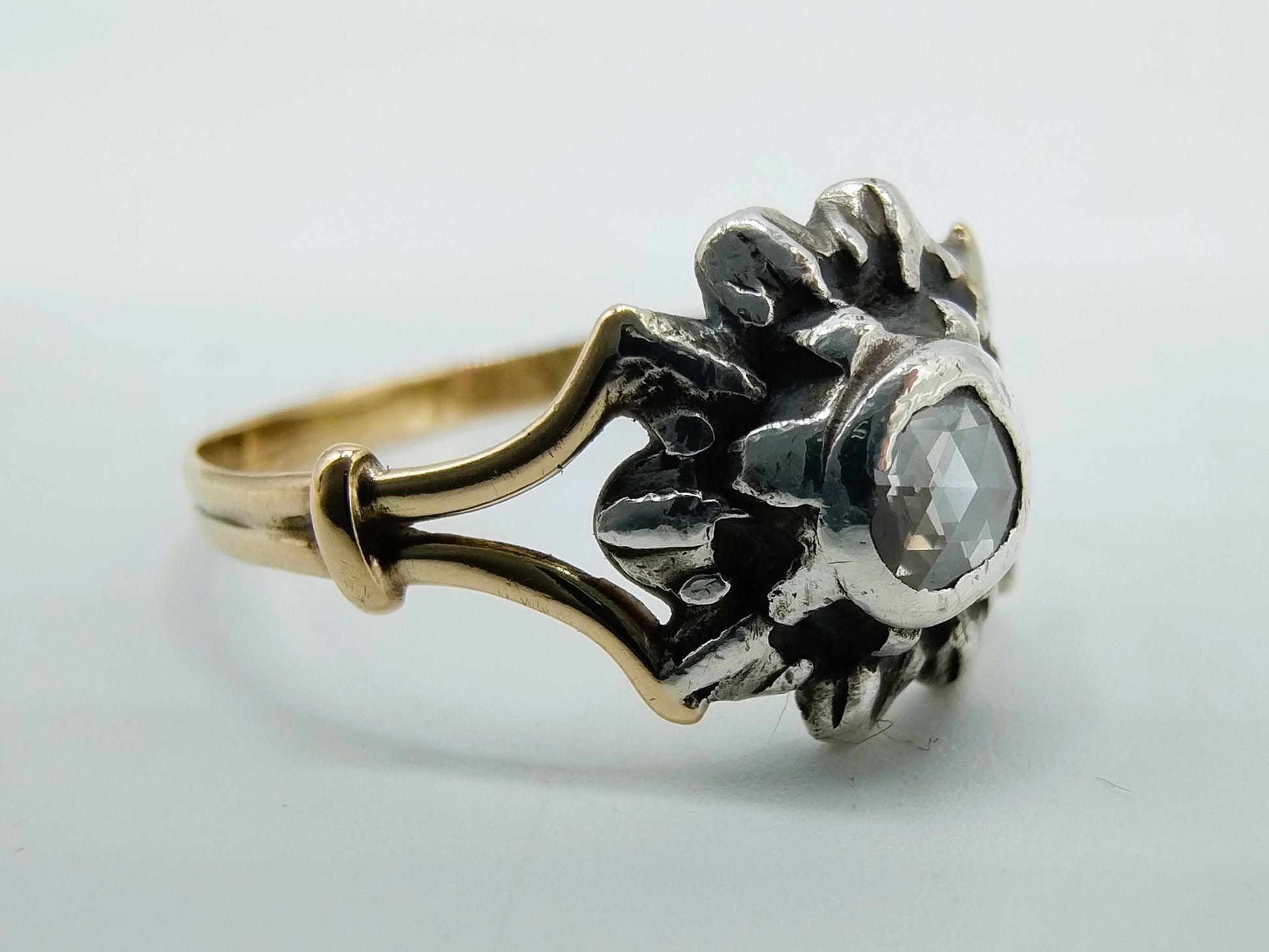 Goldring mit einem Diamanten im Rosenschliff in einer Silberfassung. Der Stein hat einen Durchmesser von ca. 4 mm.