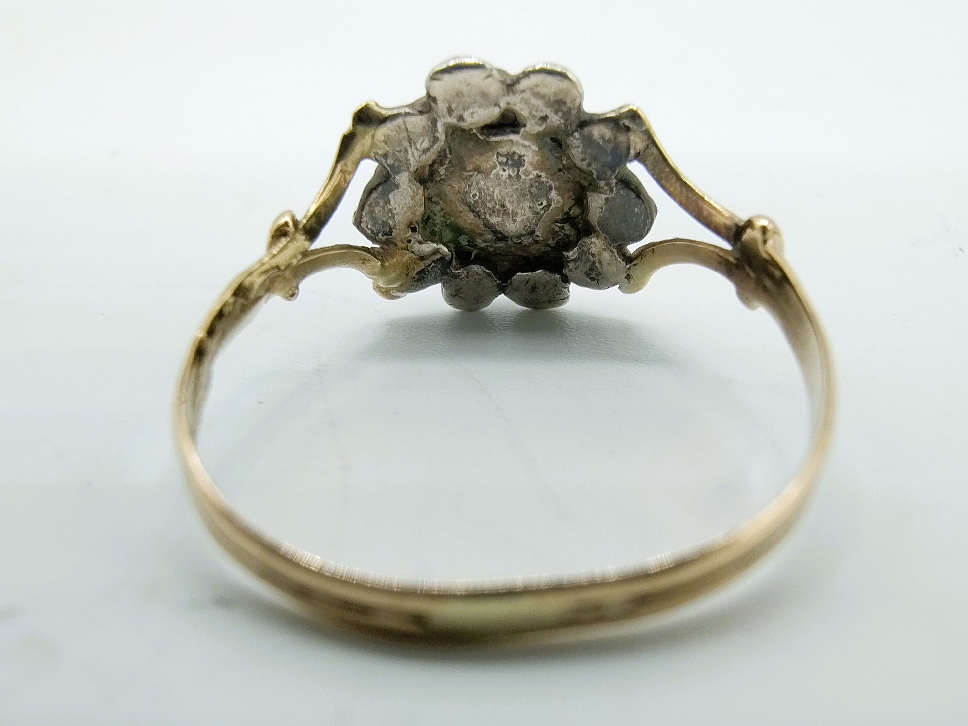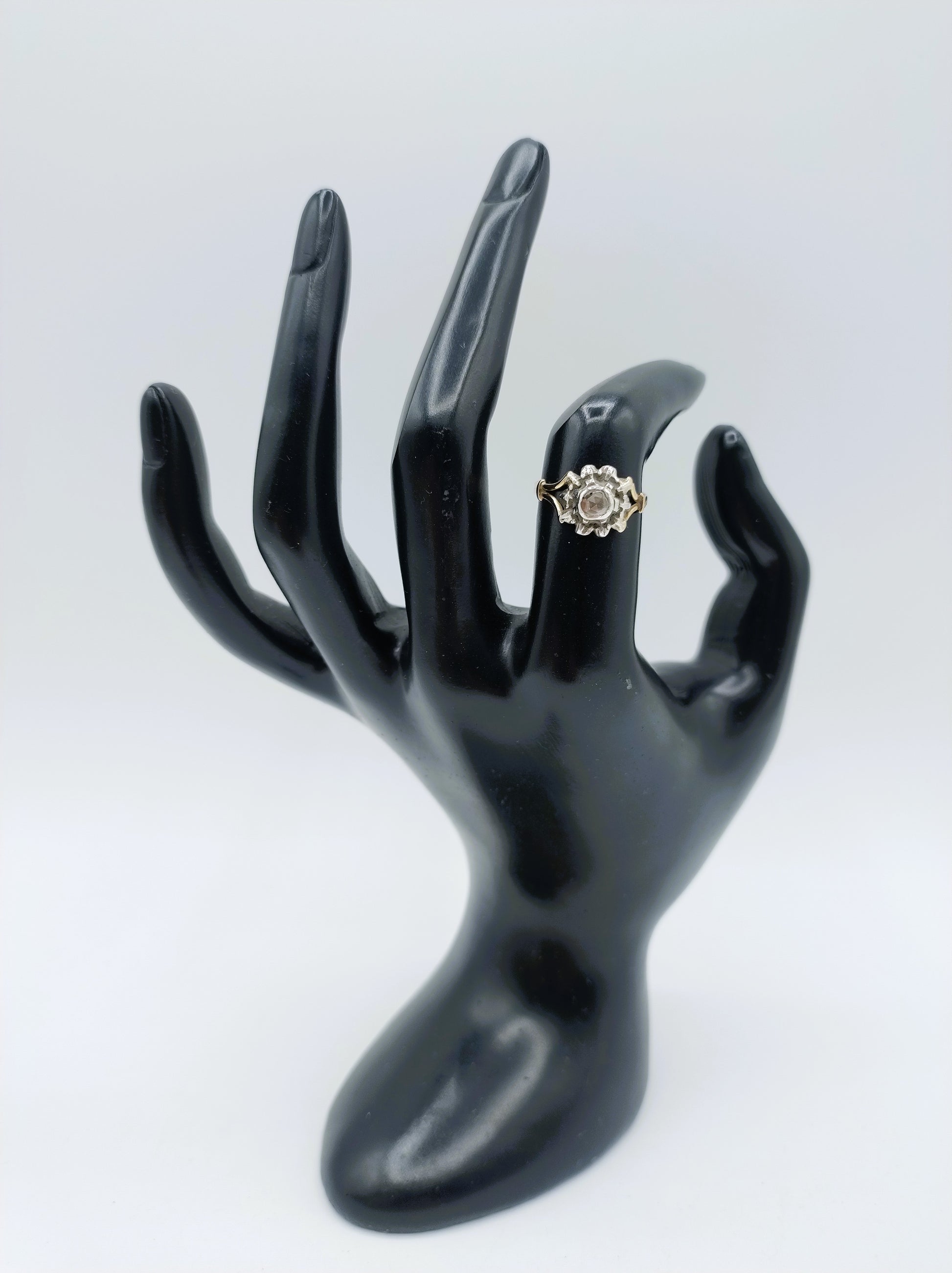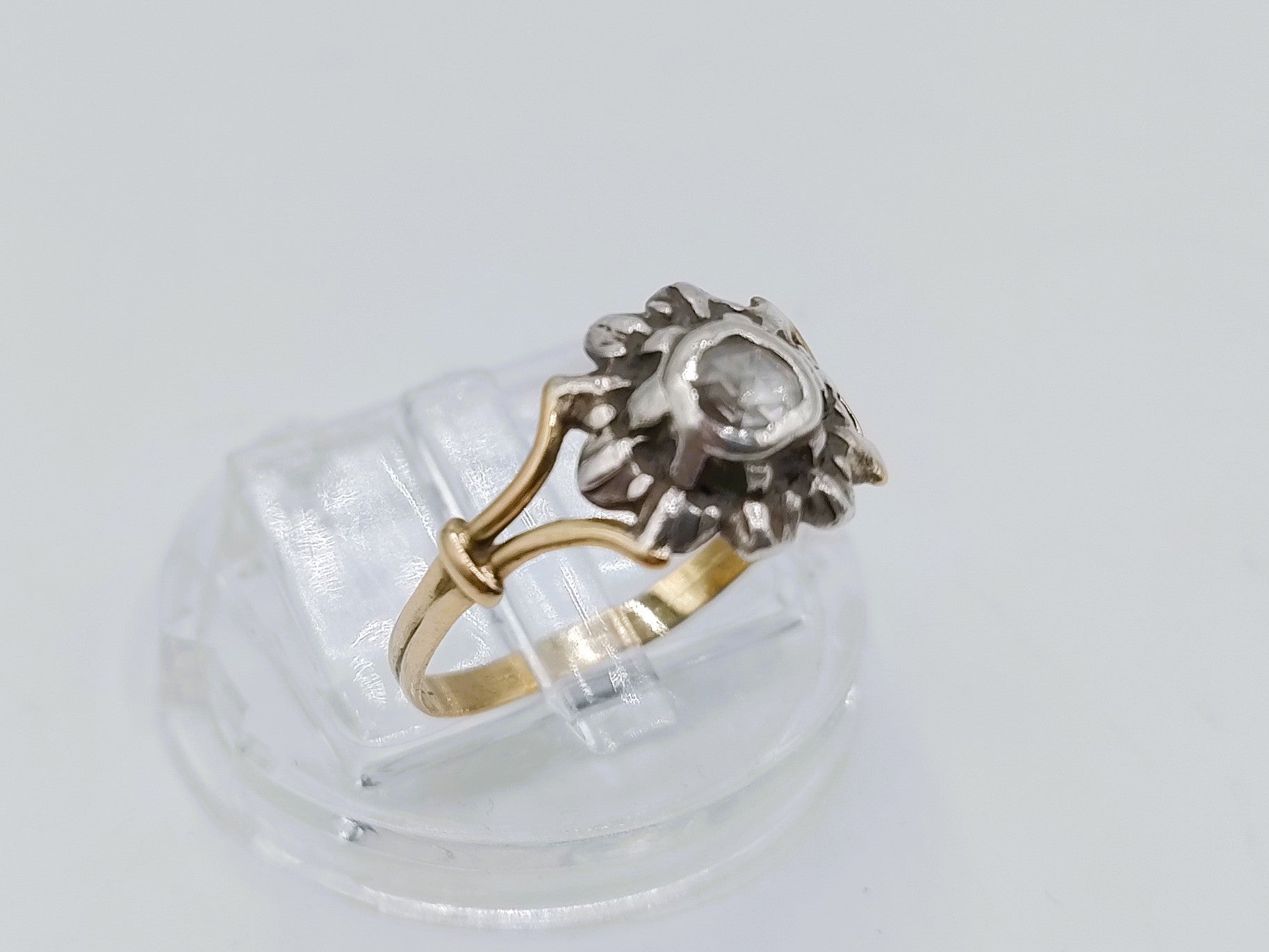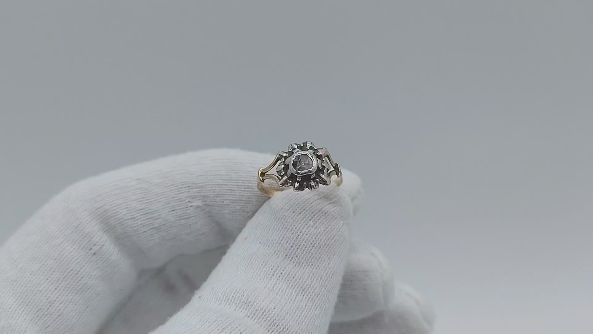 Goldring mit einem Diamanten im Rosenschliff in einer Silberfassung. Der Stein hat einen Durchmesser von ca. 4 mm.