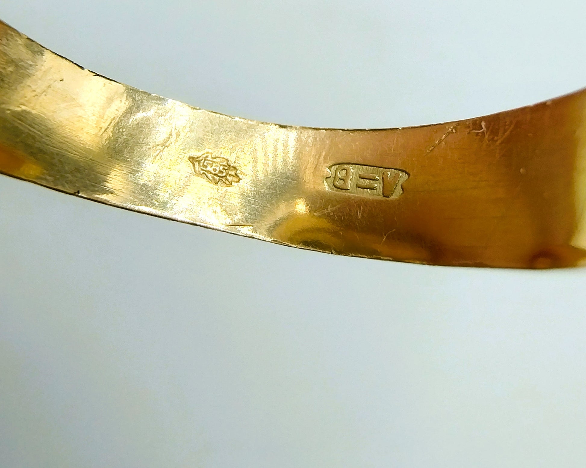Der Goldring ist mit der Meistermarke A=B und dem holländischen Eichenblatt 585 für 14 Karat punziert.