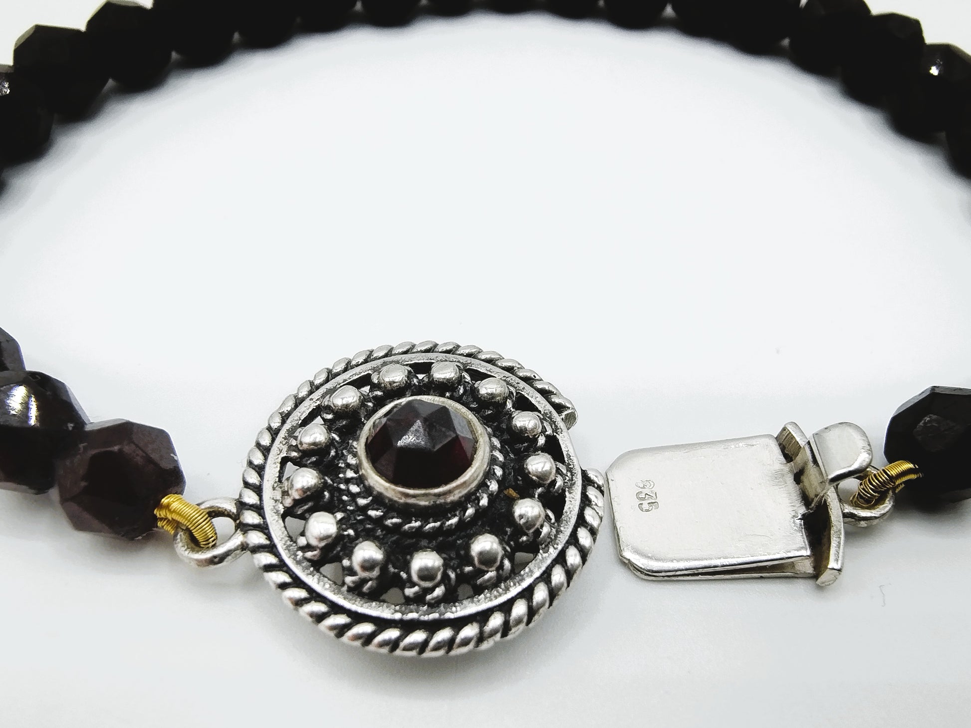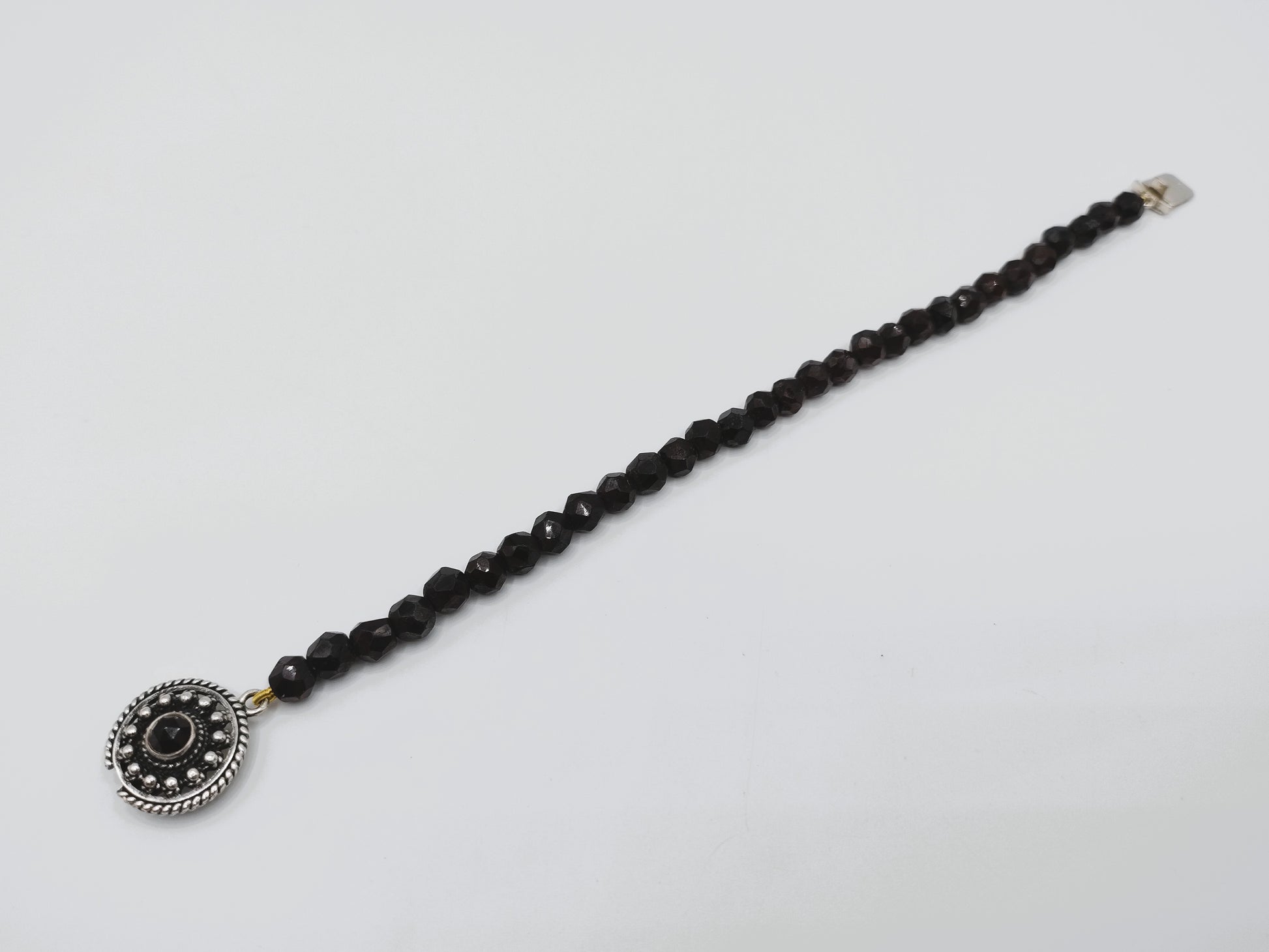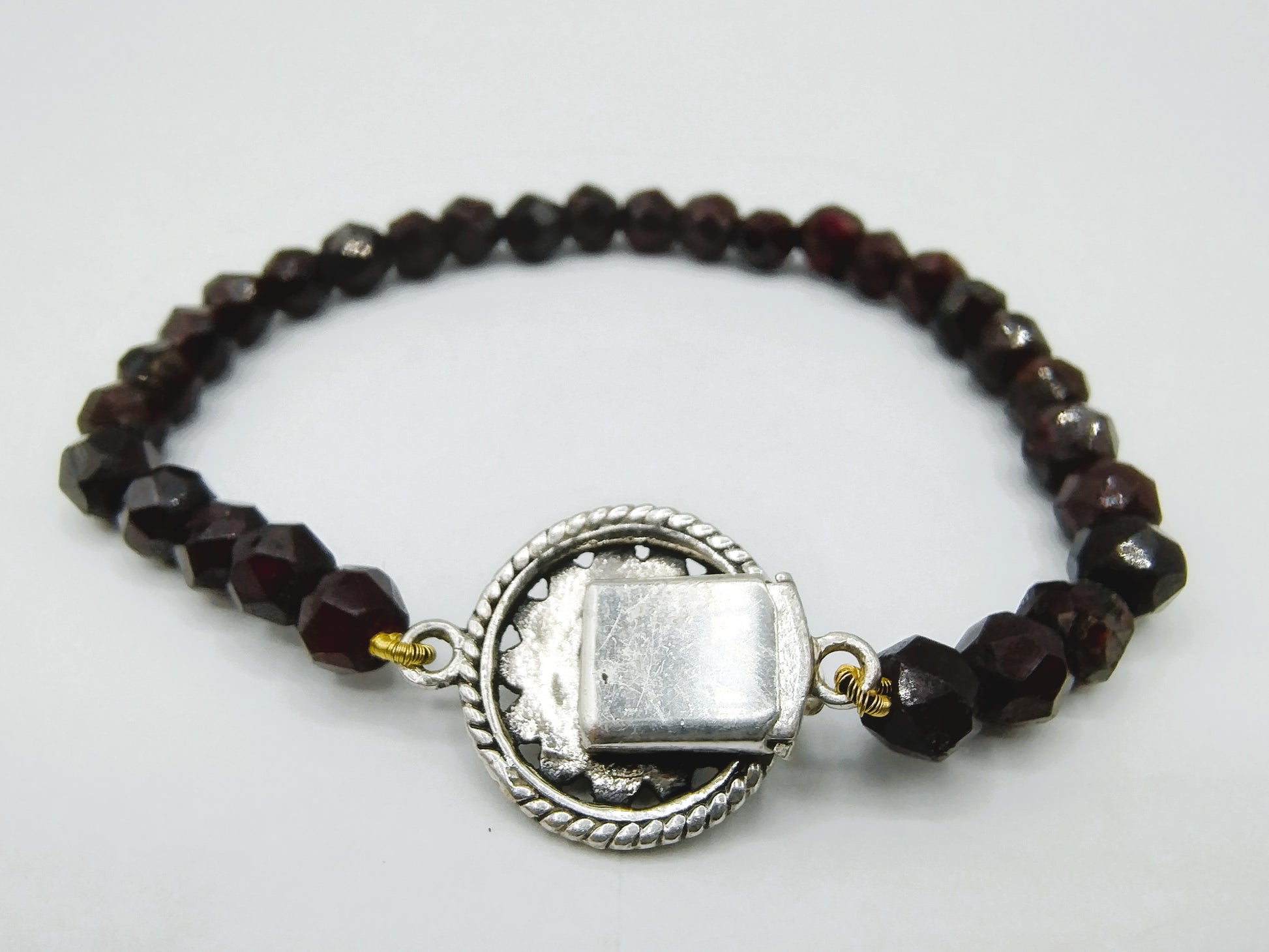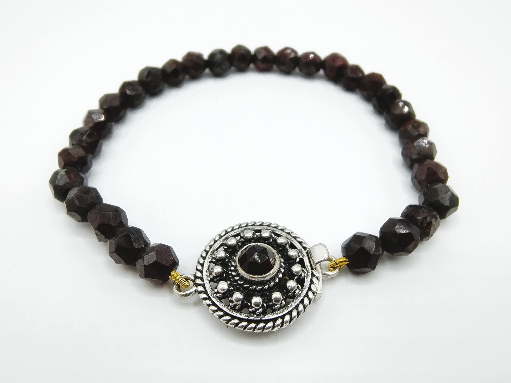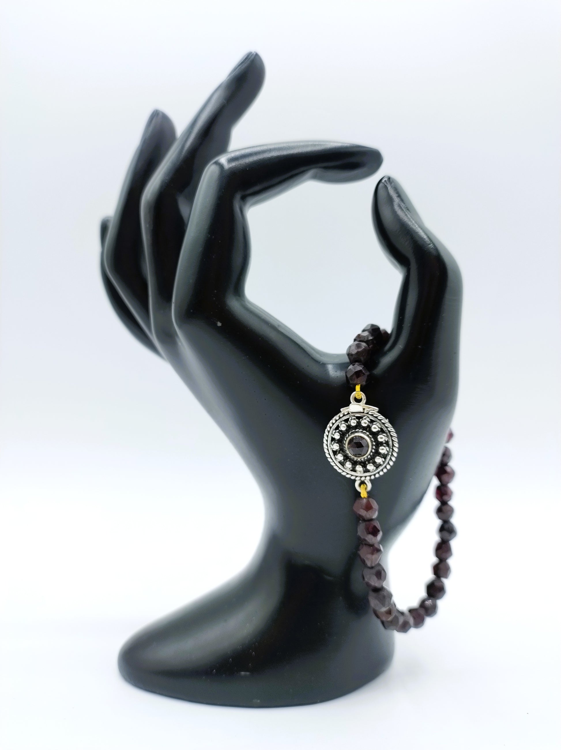 Granatarmband mit Vintage-Silberverschluss. Der Silberverschluss ist mit einer Granate mit 4 mm Durchmesser ausgestattet.
