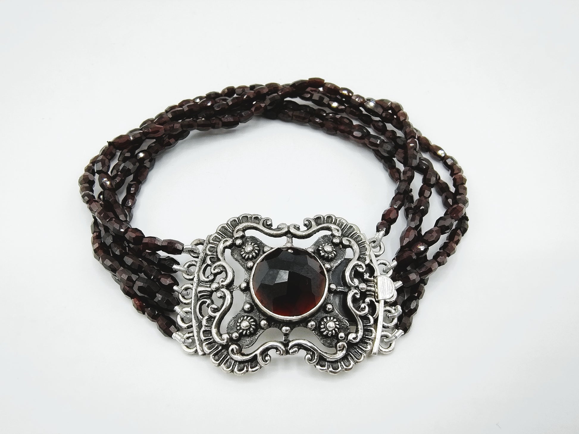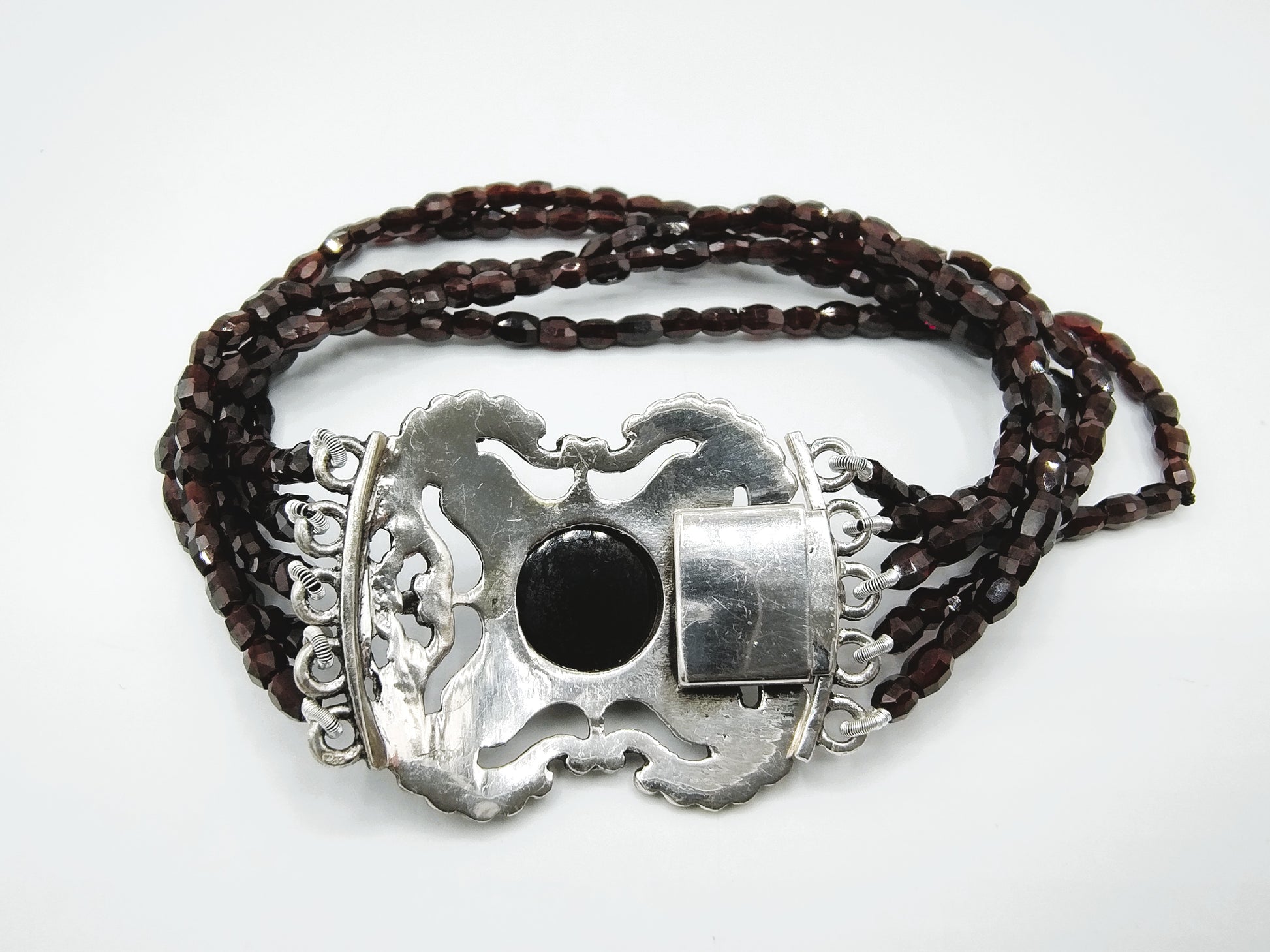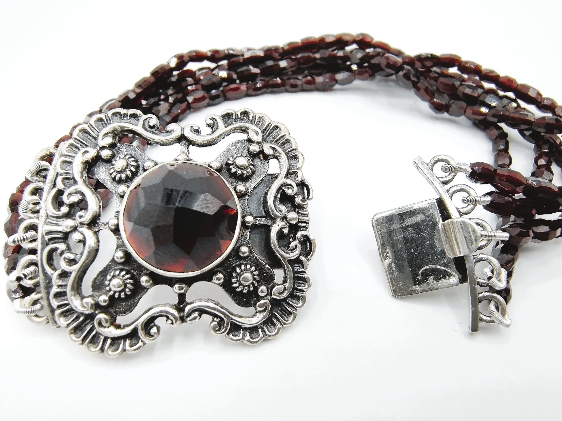 5 Reihen Granate, verbunden mit einem Vintage-Silberverschluss. Der Silberverschluss ist mit einem großen Granat mit 1,3 cm Durchmesser bestückt.