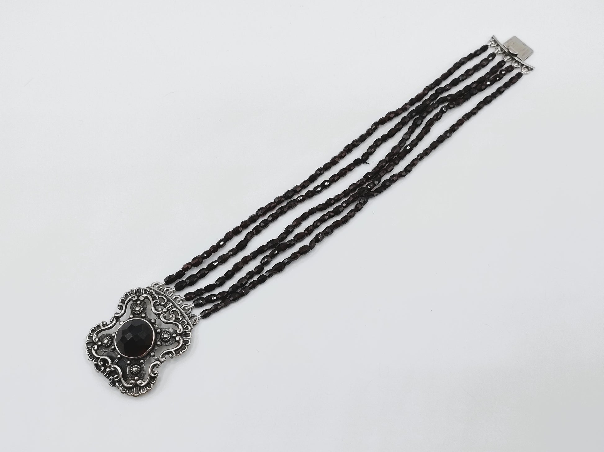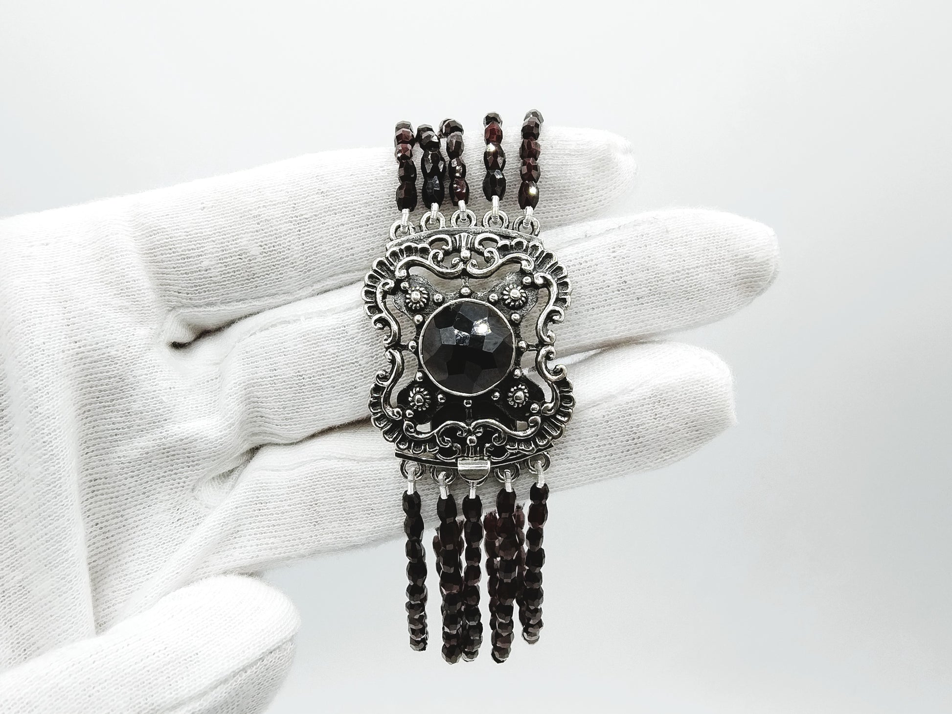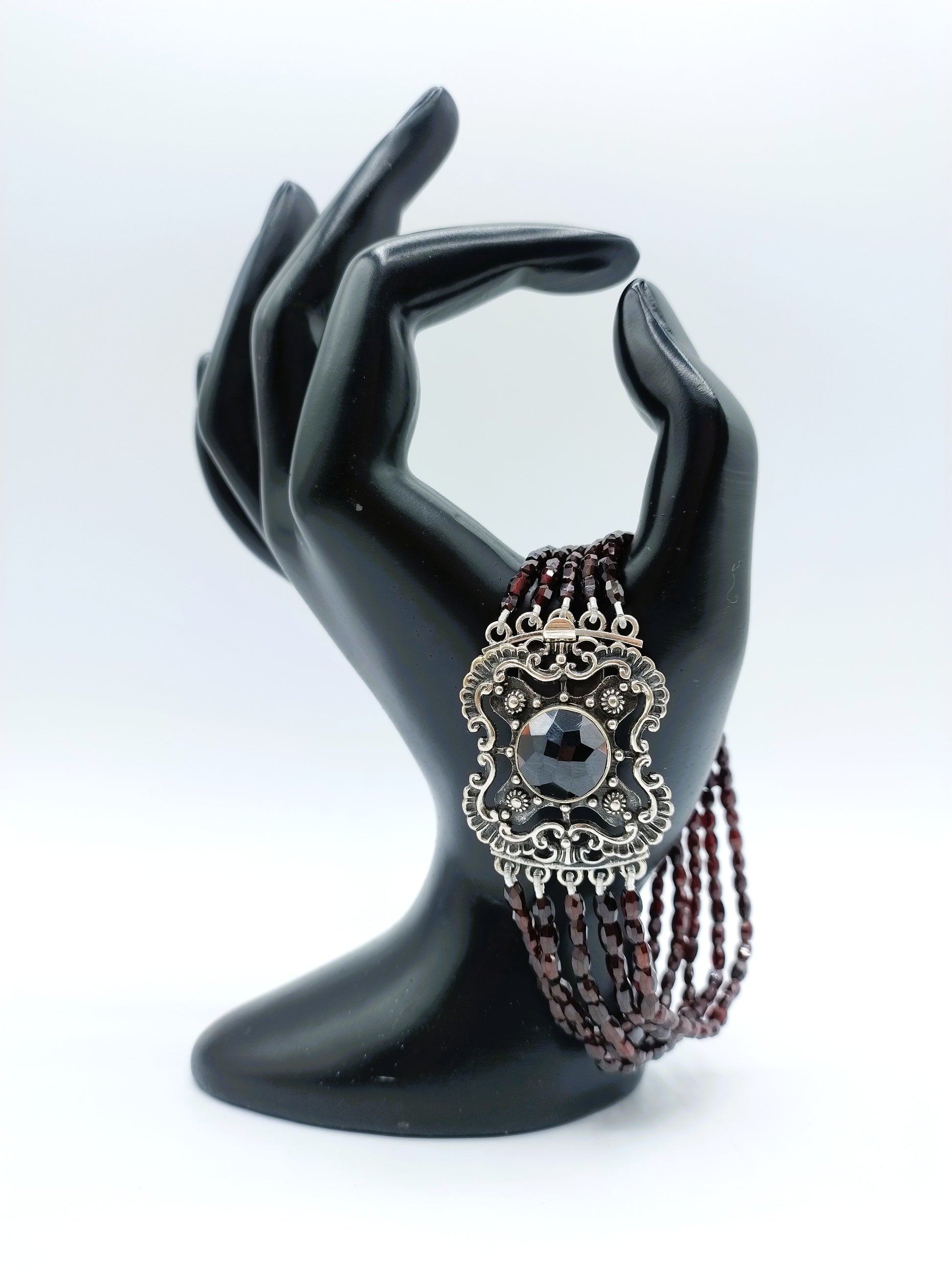 5 Reihen Granate, verbunden mit einem Vintage-Silberverschluss. Der Silberverschluss ist mit einem großen Granat mit 1,3 cm Durchmesser bestückt.