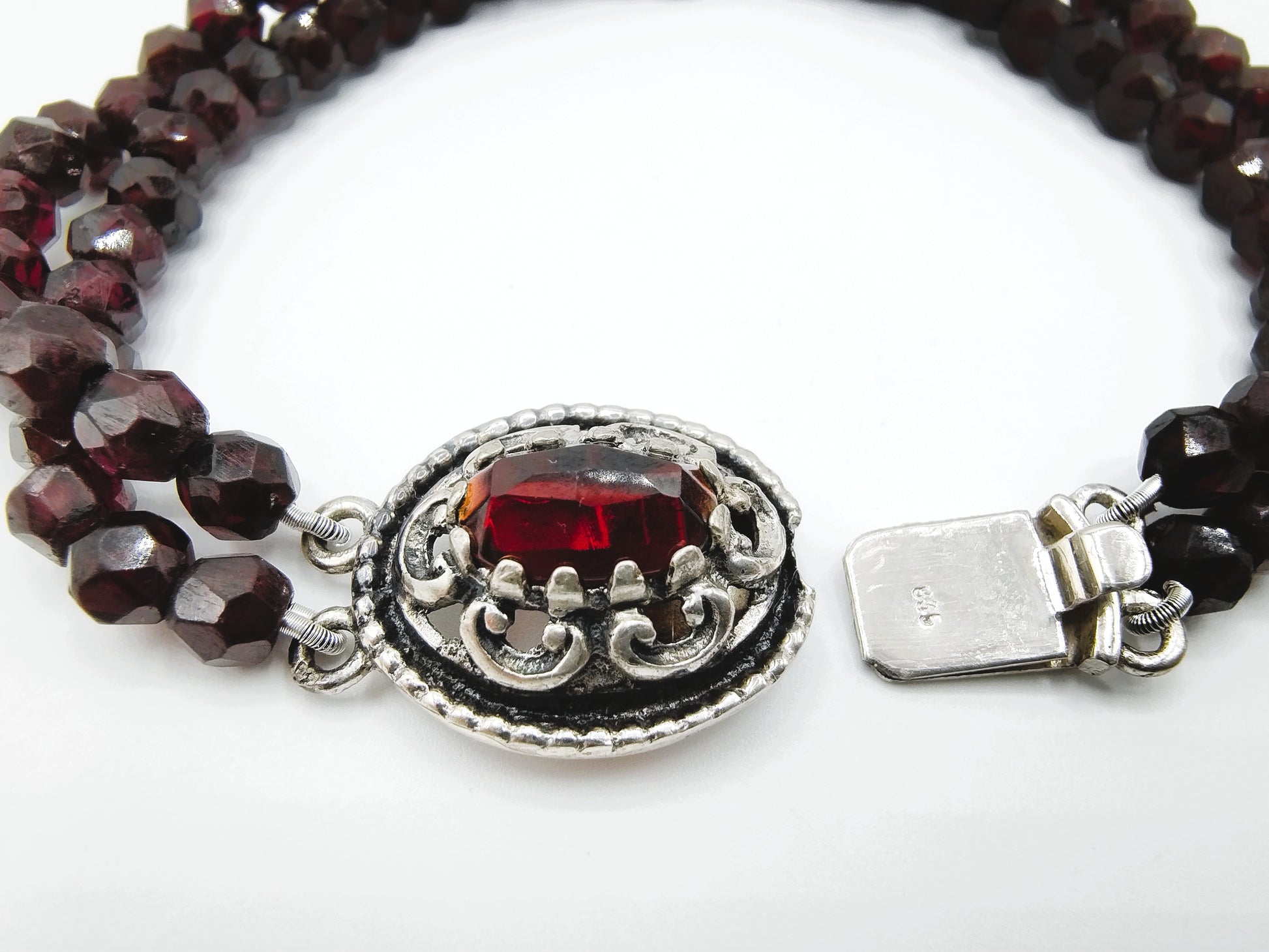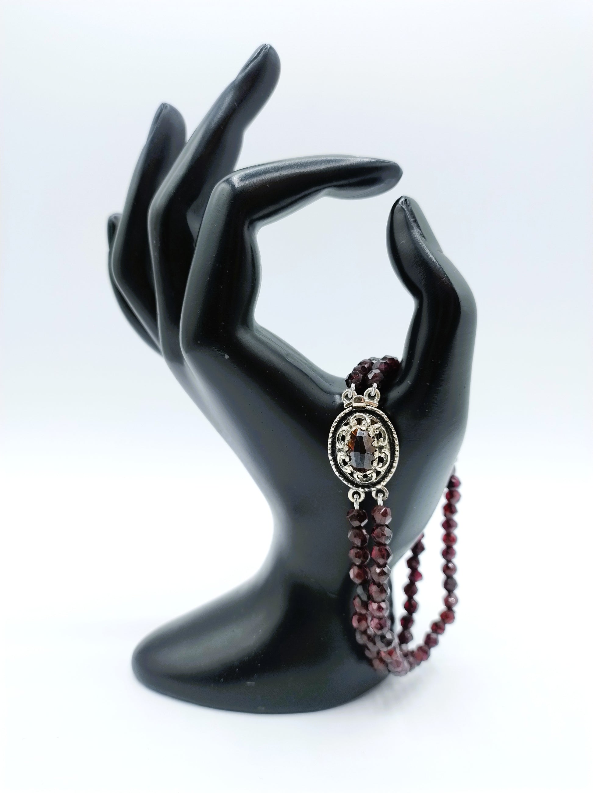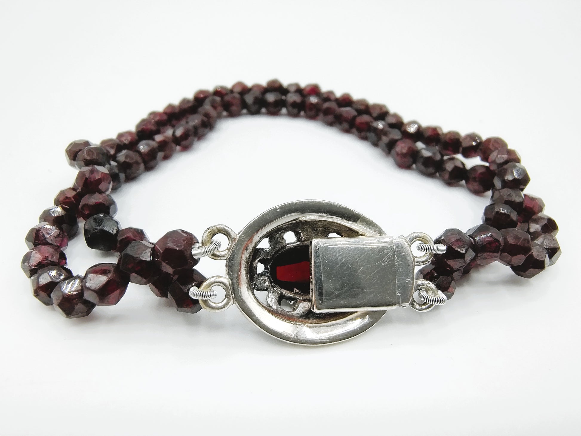 2 Reihen Granate, verbunden mit einem Vintage-Silberverschluss. Der Silberverschluss ist mit einem großen Granat mit 1 cm Durchmesser bestückt.