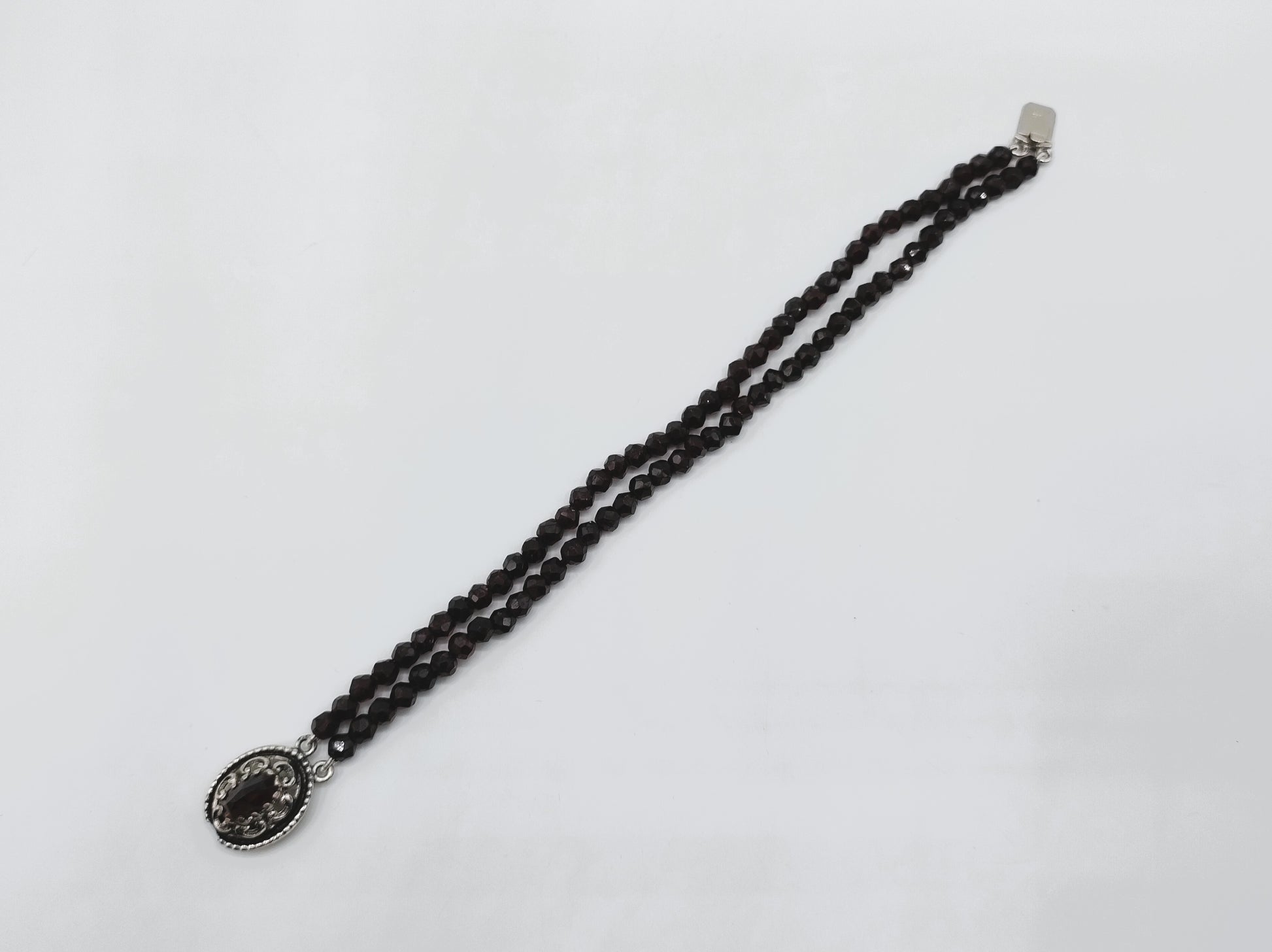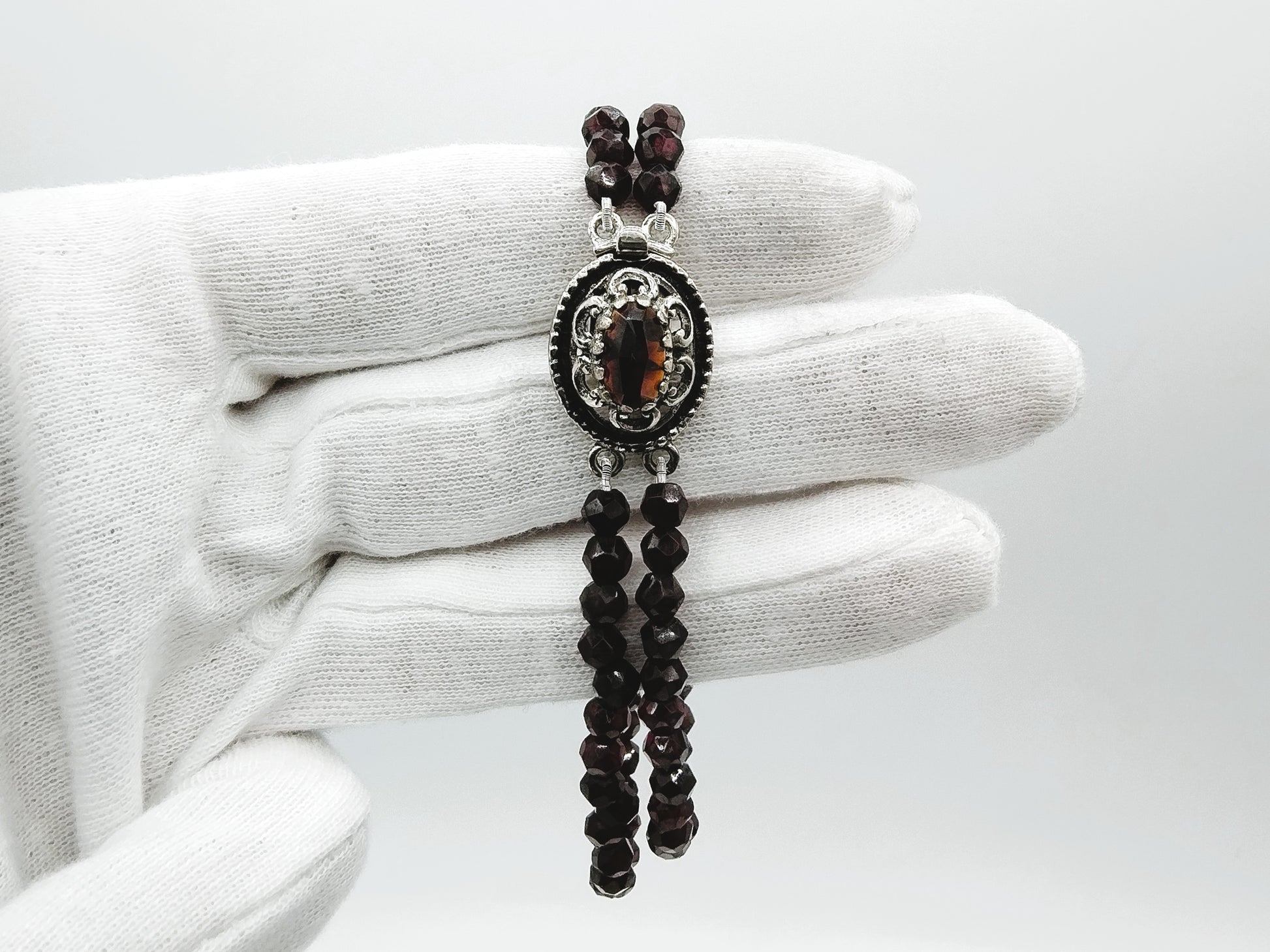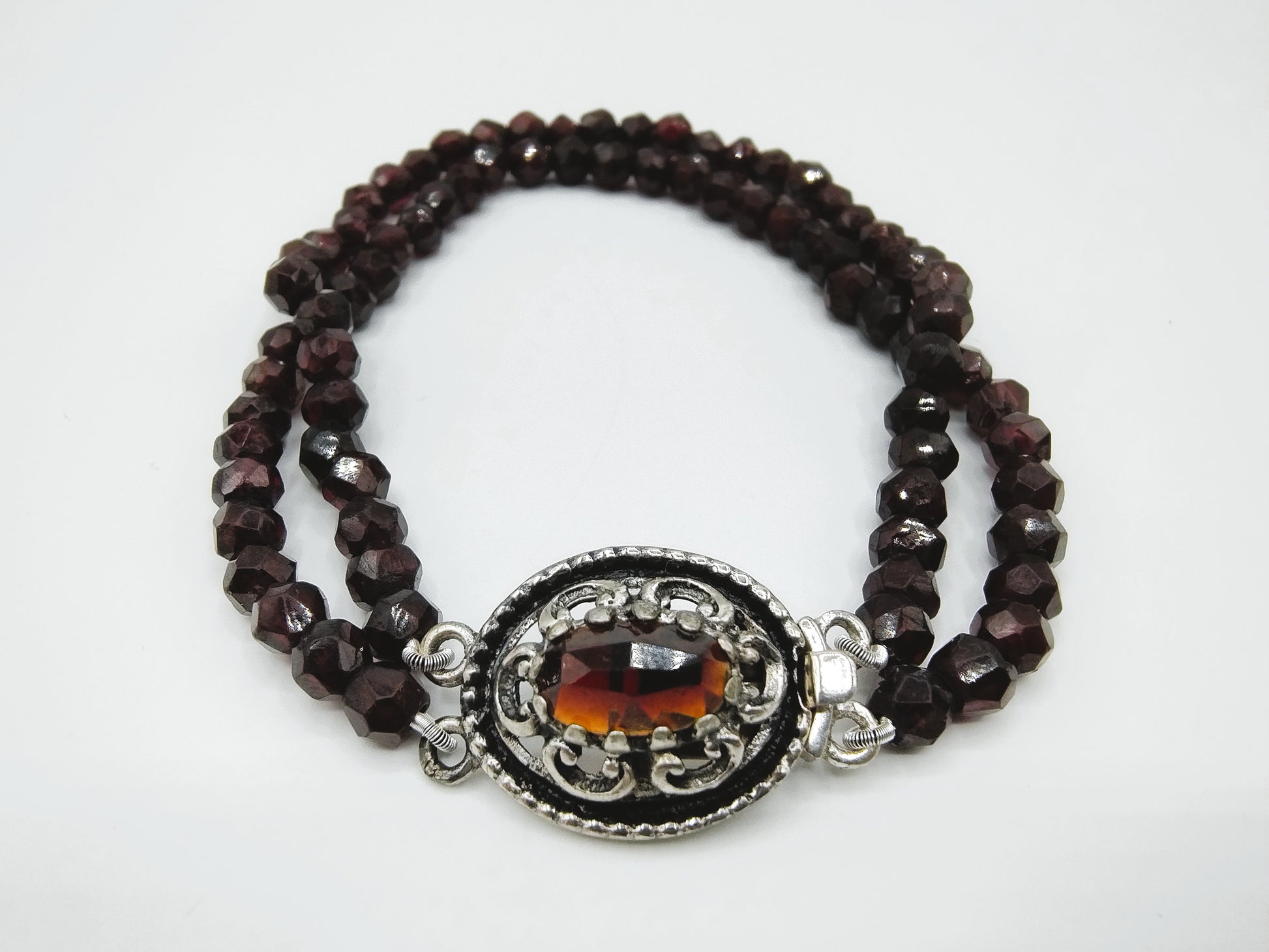 2 Reihen Granate, verbunden mit einem Vintage-Silberverschluss. Der Silberverschluss ist mit einem großen Granat mit 1 cm Durchmesser bestückt.