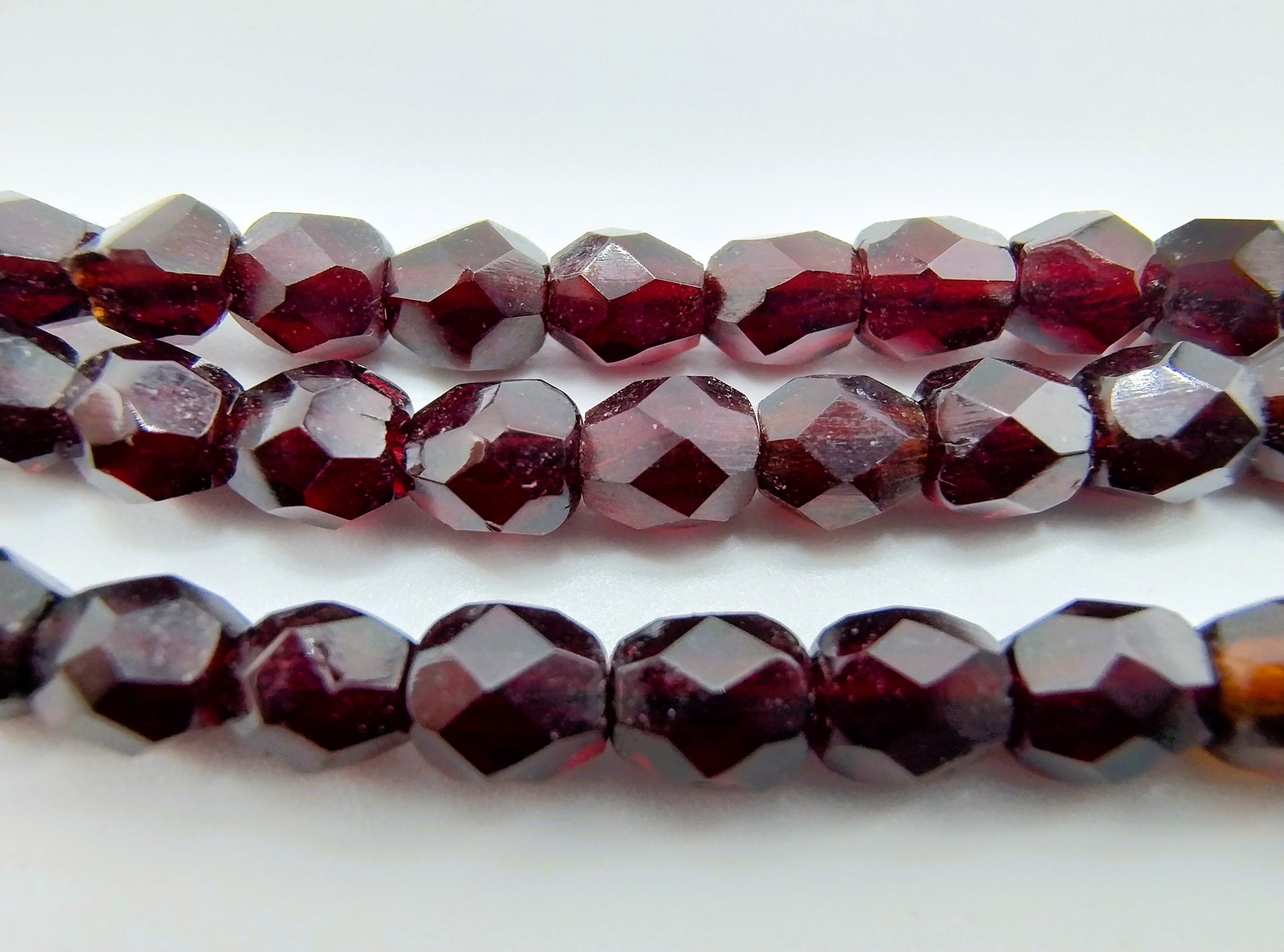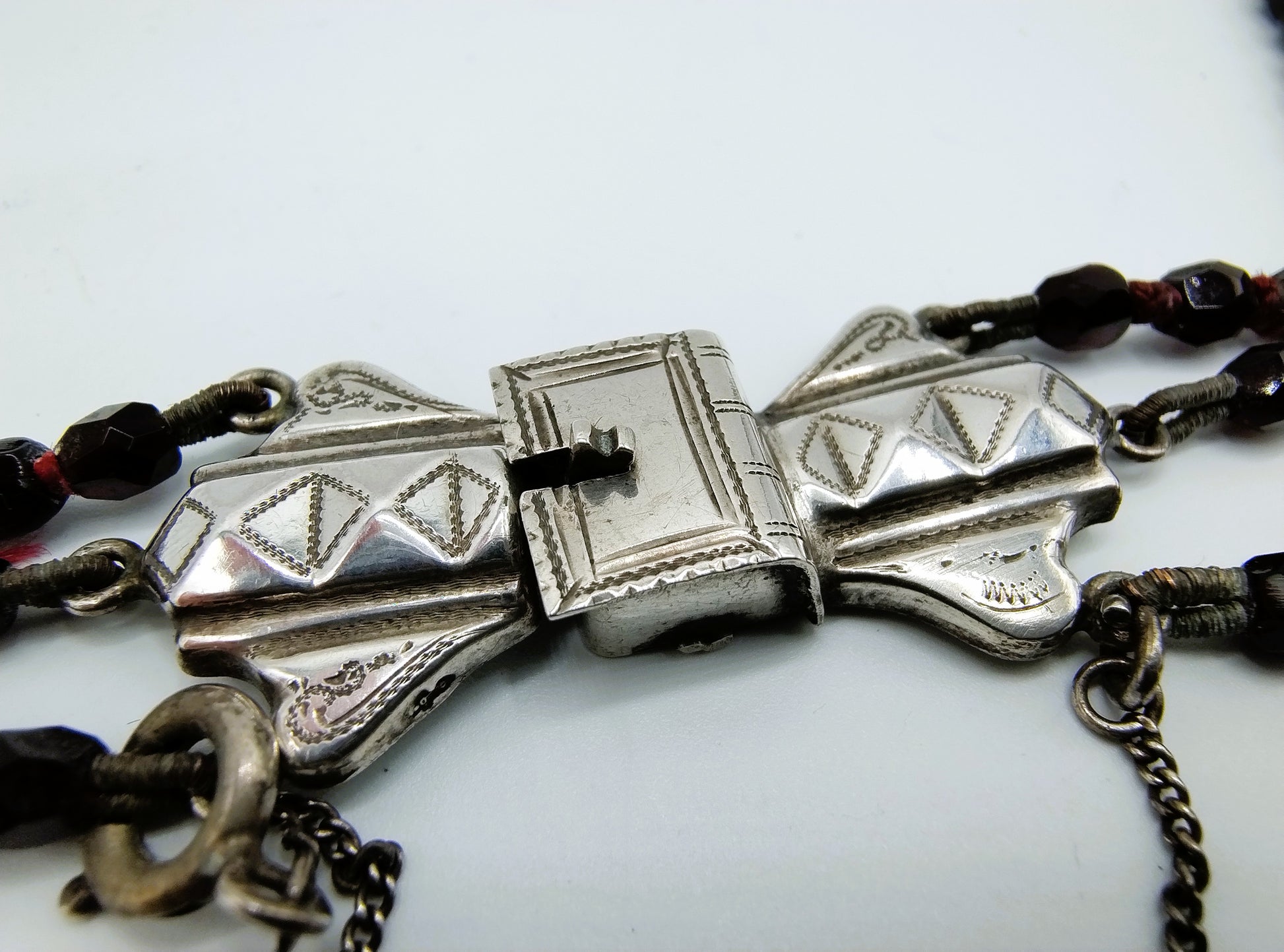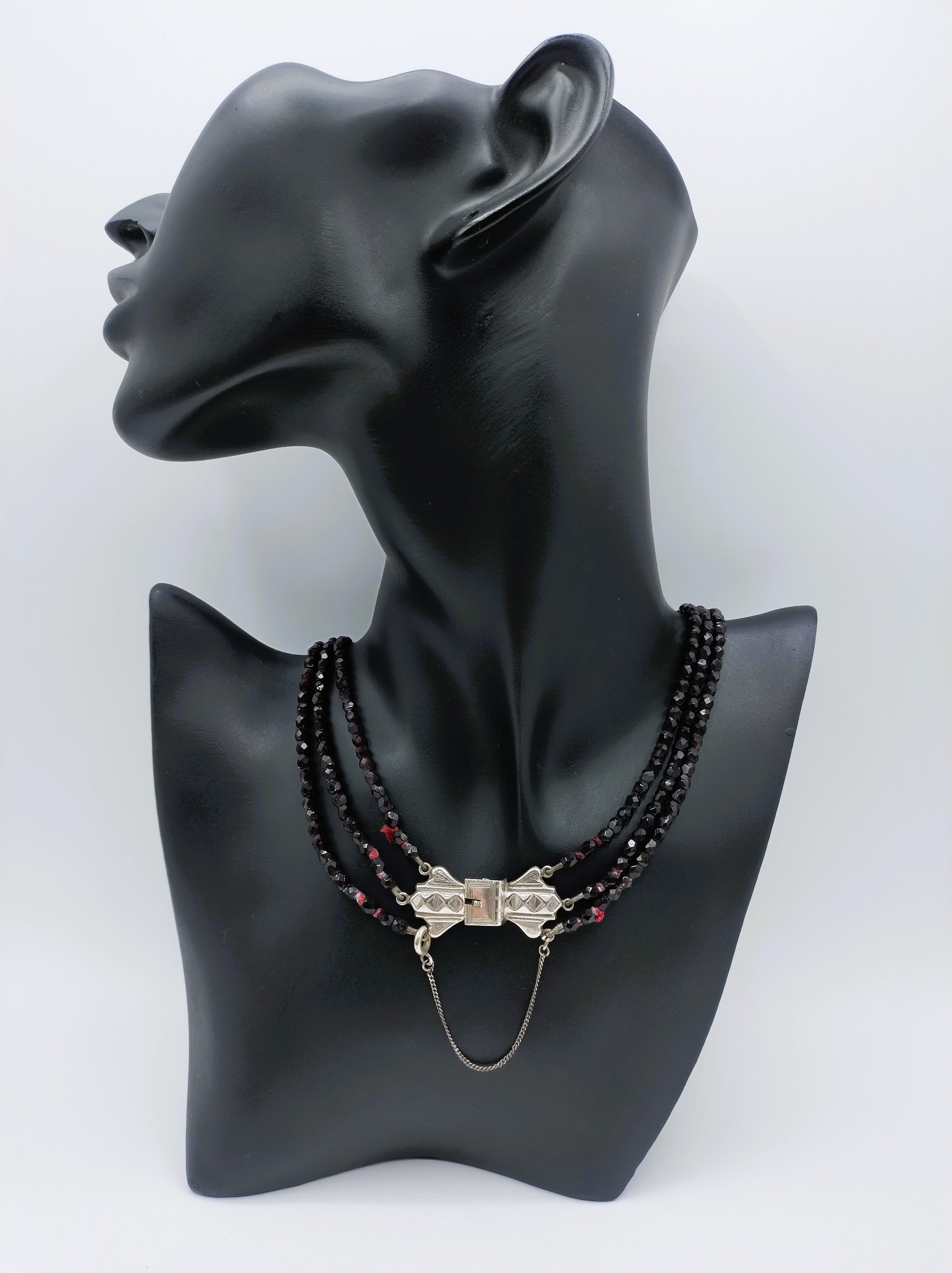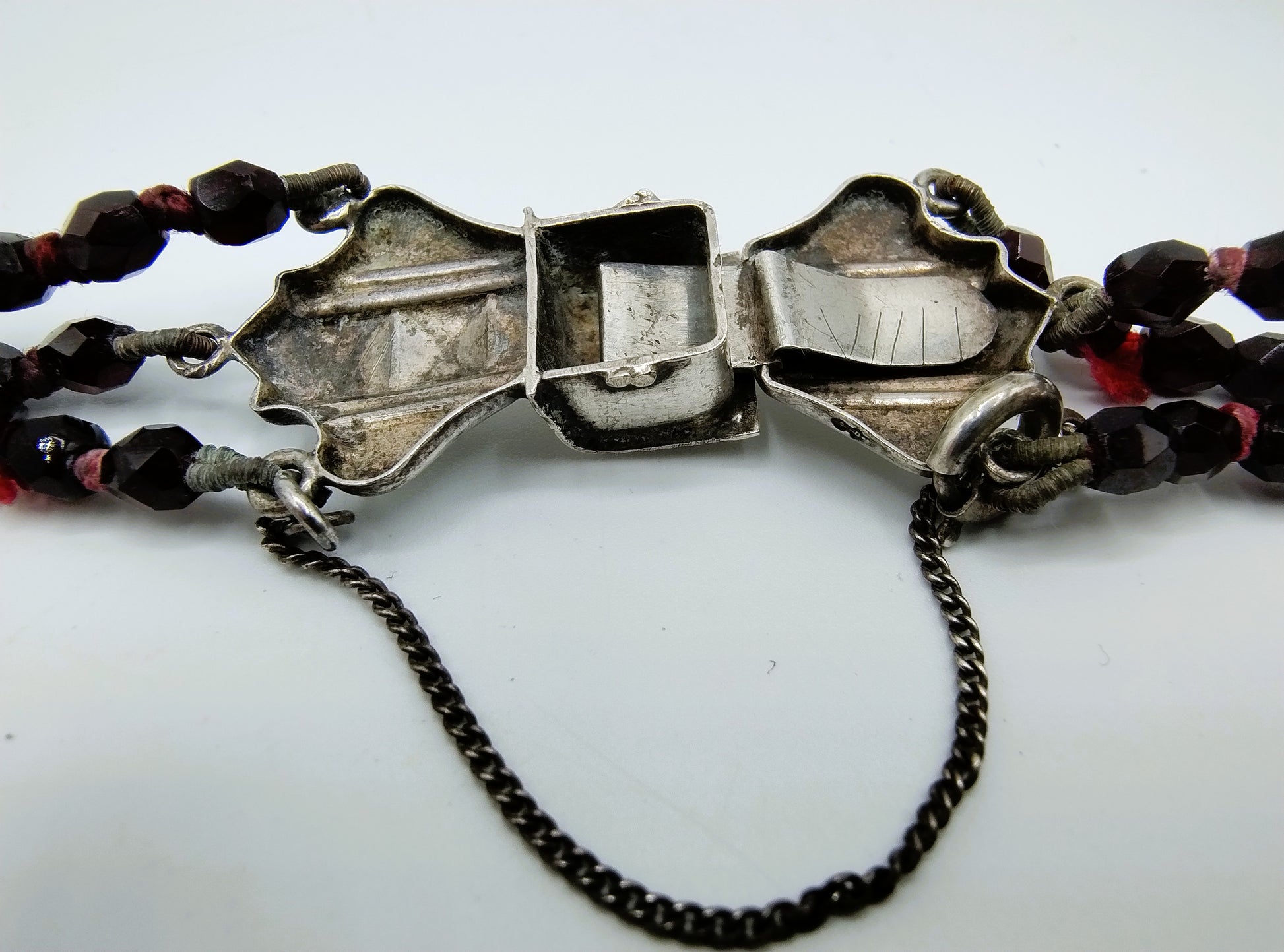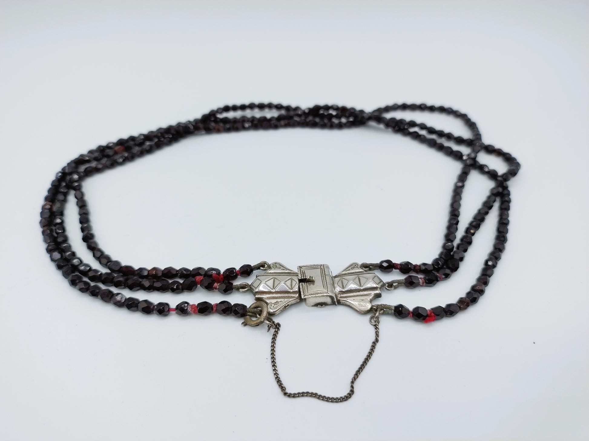 Eine Kette mit drei Granatsträngen, befestigt an einem silbernen Vintage-Bibelverschluss. Solche Verschlüsse werden auch Schnappverschlüsse genannt.