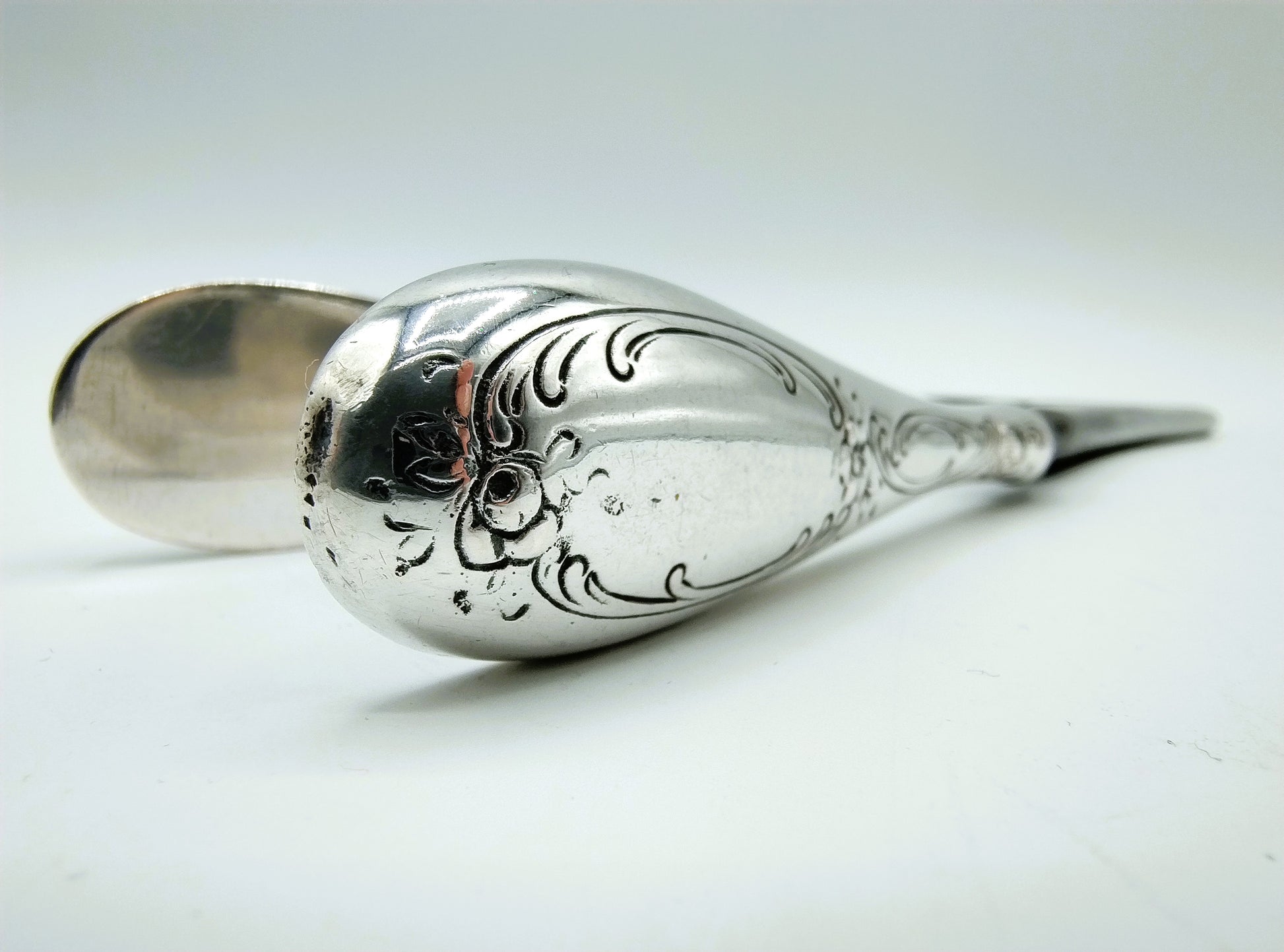 Die Griffe sind mit Schnörkelmotiven versehen.