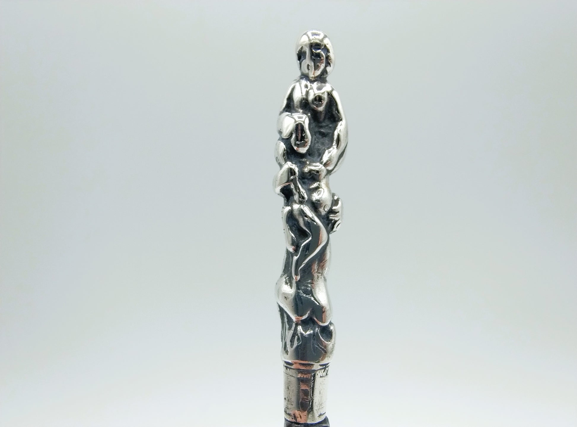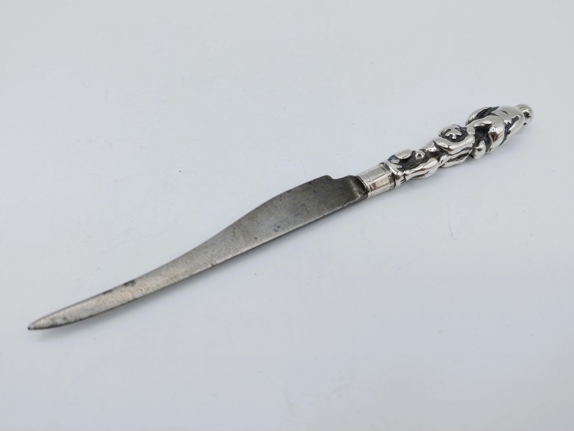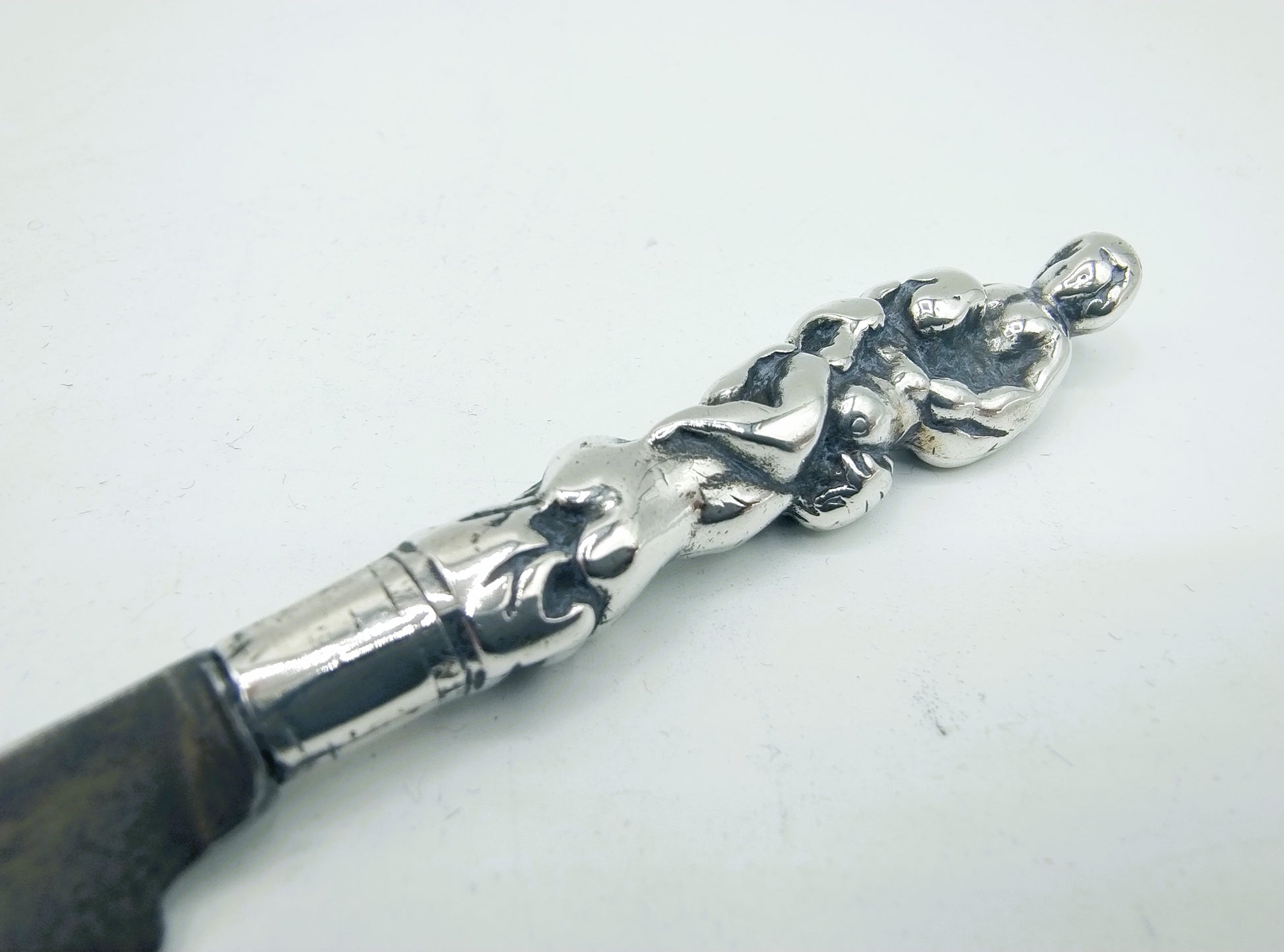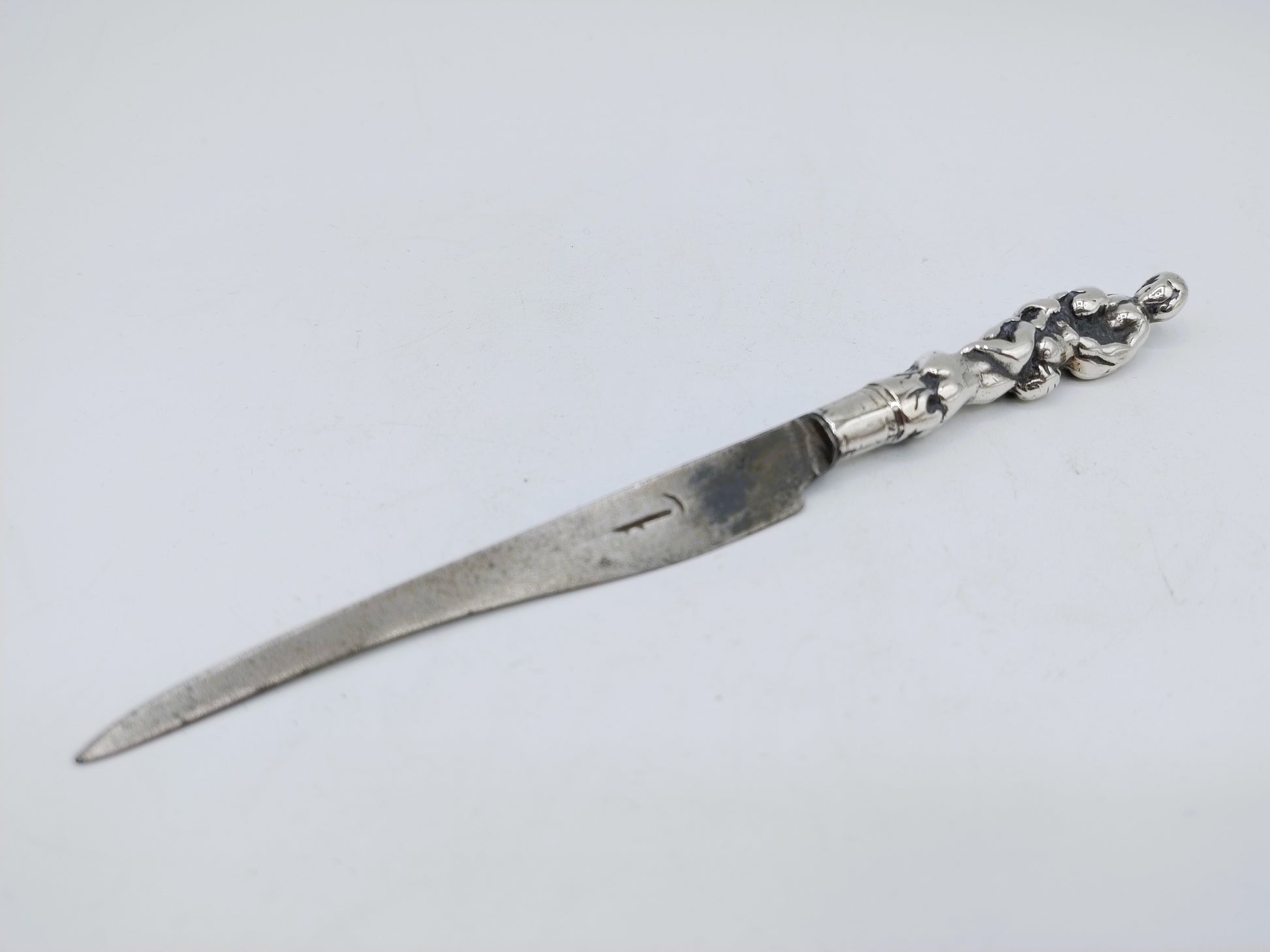 Wunderschönes Messer aus der zweiten Hälfte des 17. Jahrhunderts Jahrhundert. Eine originale Eisenklinge aus Schagen (Messermacher seit dem 16. Jahrhundert). Jahrhundert), eingefasst in einen silbernen Gussgriff, der mütterliche Liebe darstellt.
