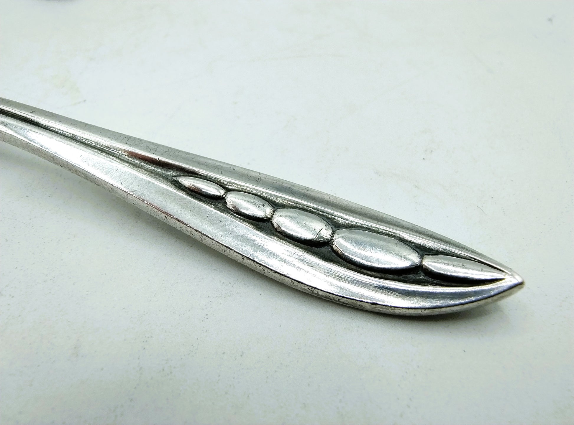 Set mit 6 silbernen Teelöffeln und einem silbernen Zuckerlöffel. Alle Löffel sind wunderschön im Art-Deco-Stil dekoriert (Modell 219 aus der Serie).