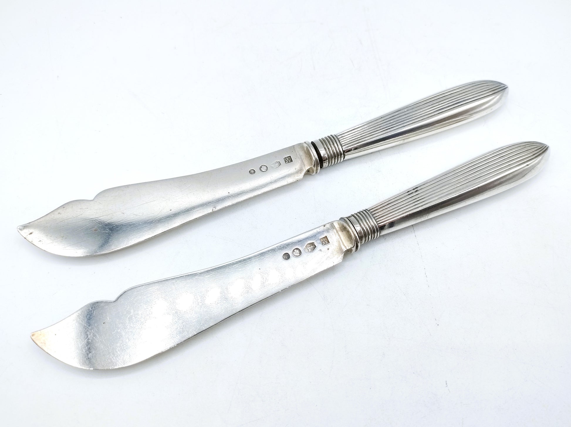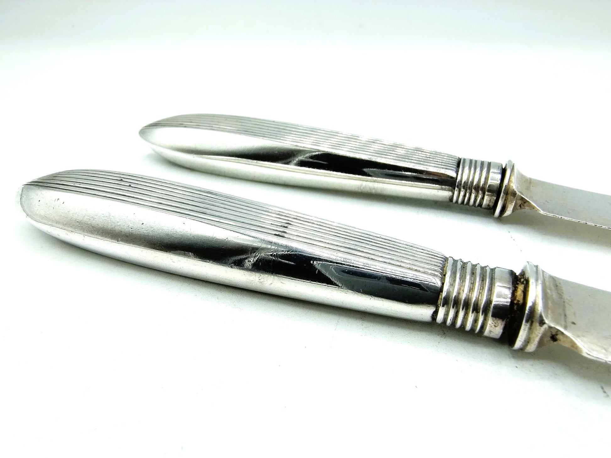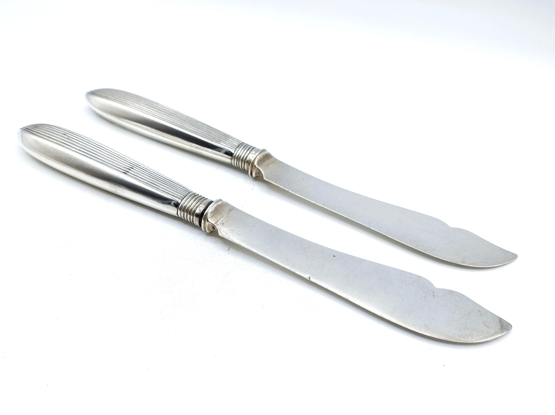 Die robusten Angelmesser sind komplett aus Silber gefertigt und haben ein schönes Rippenmotiv am Griff.