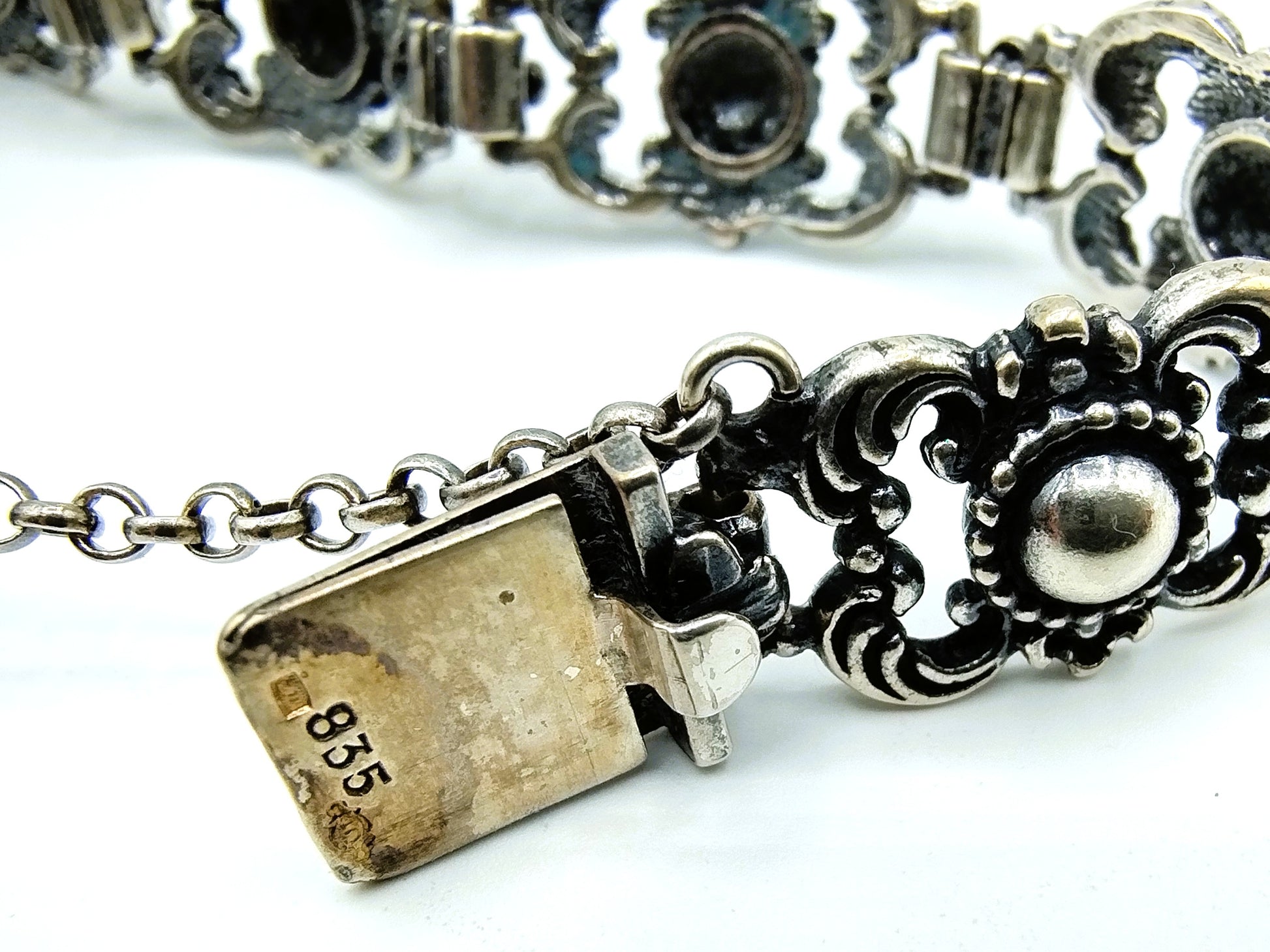 Das Armband ist mit 835 für Silber 2. Grades, Anhangsmarke und Neumarke Z11 gekennzeichnet.