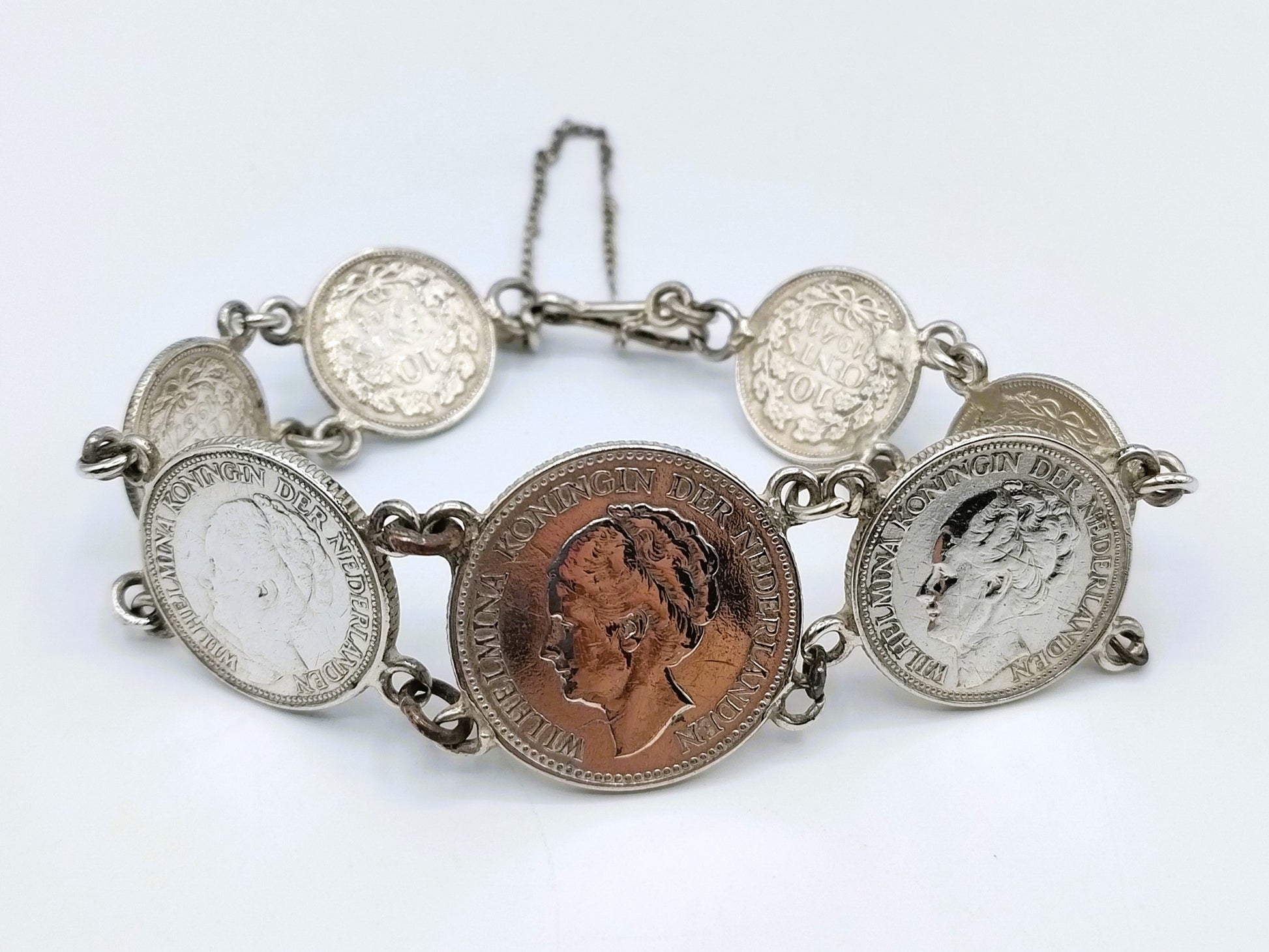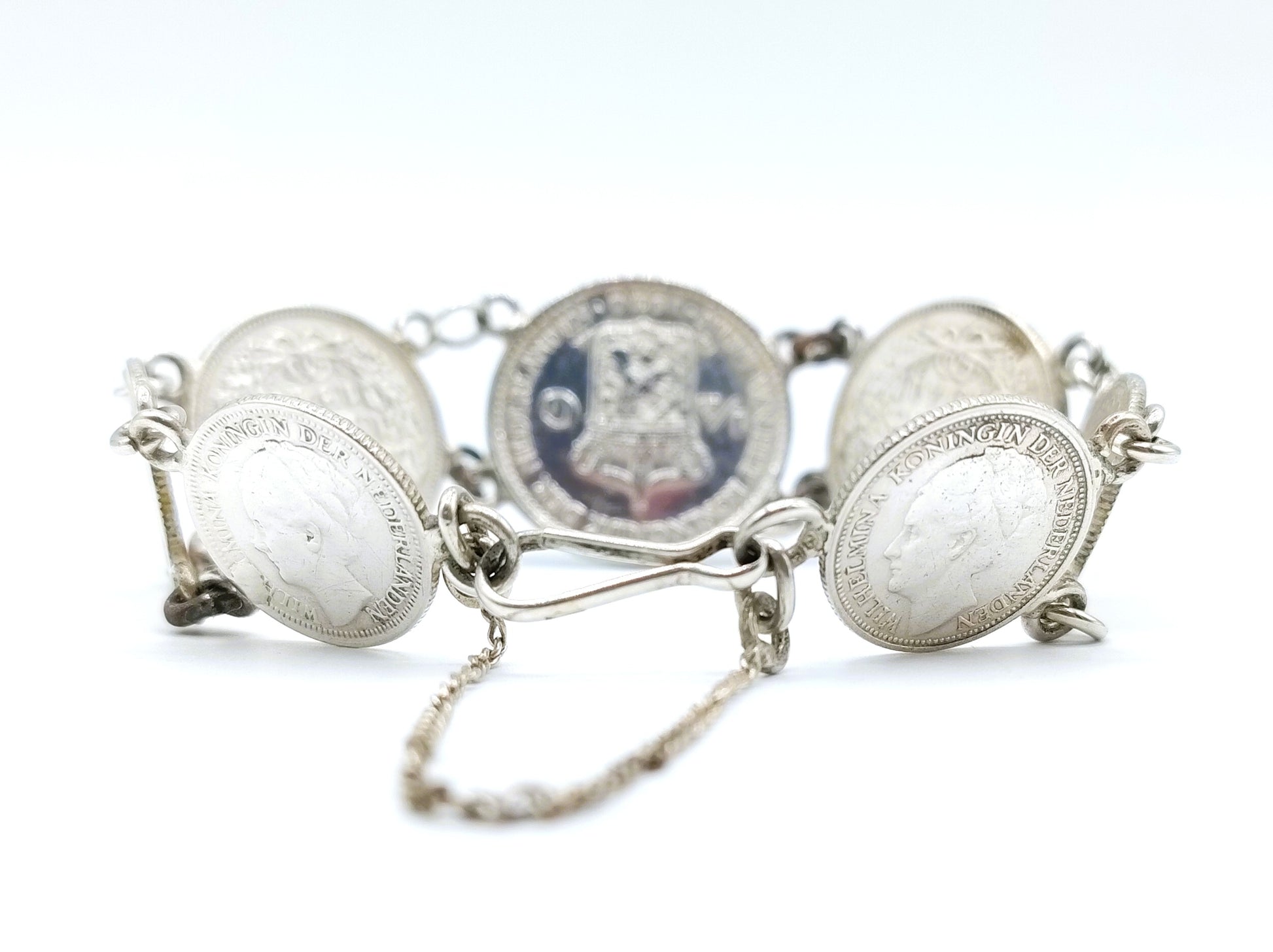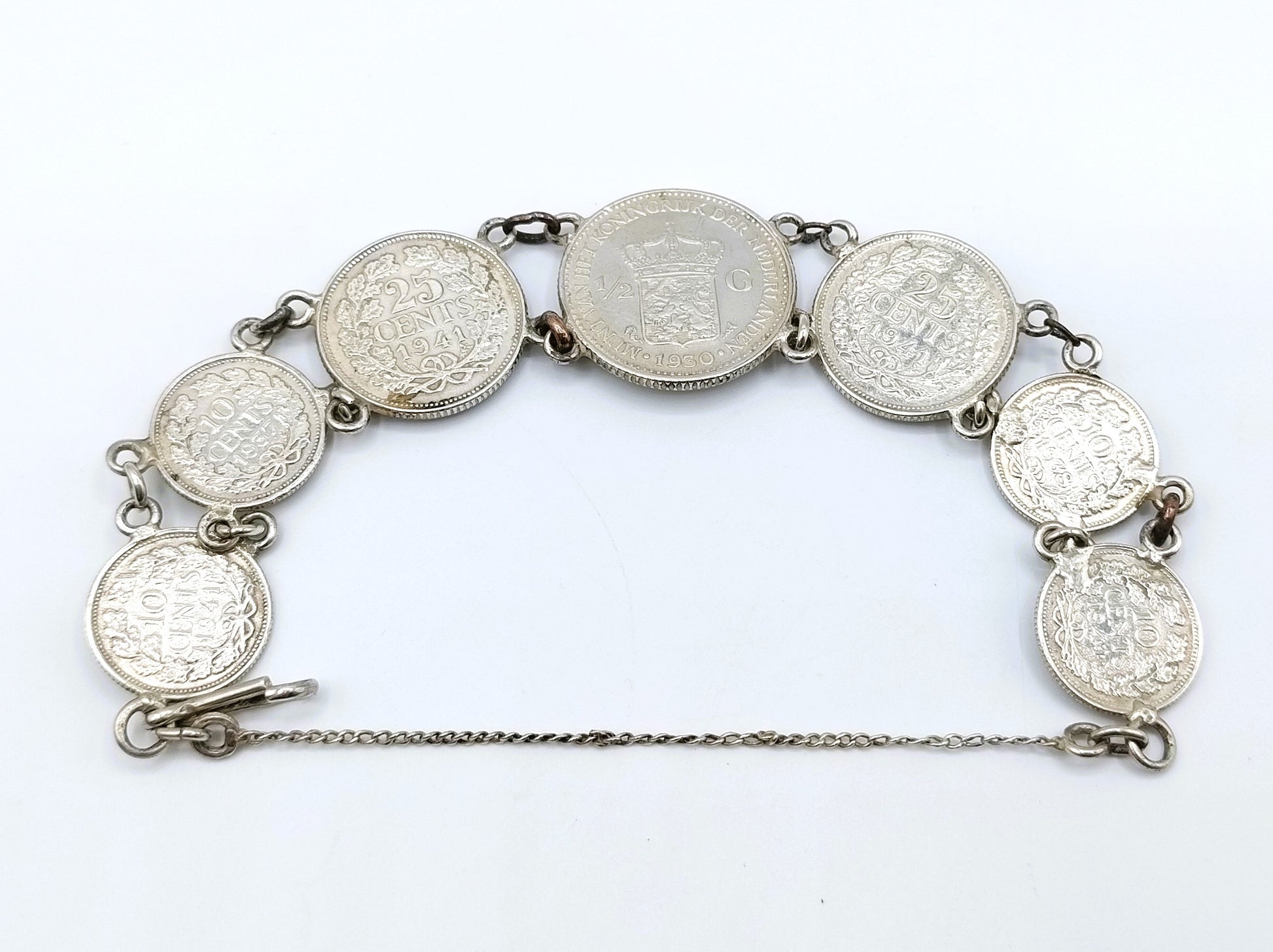 Silberarmband aus 4 Wilhelmina-Dimes, 2 Viertel- und 1 halben Gulden. Die Jahreszahlen reichen von 1930 bis 1941. Vermutlich während des Zweiten Weltkriegs als Akt des Widerstands hergestellt.