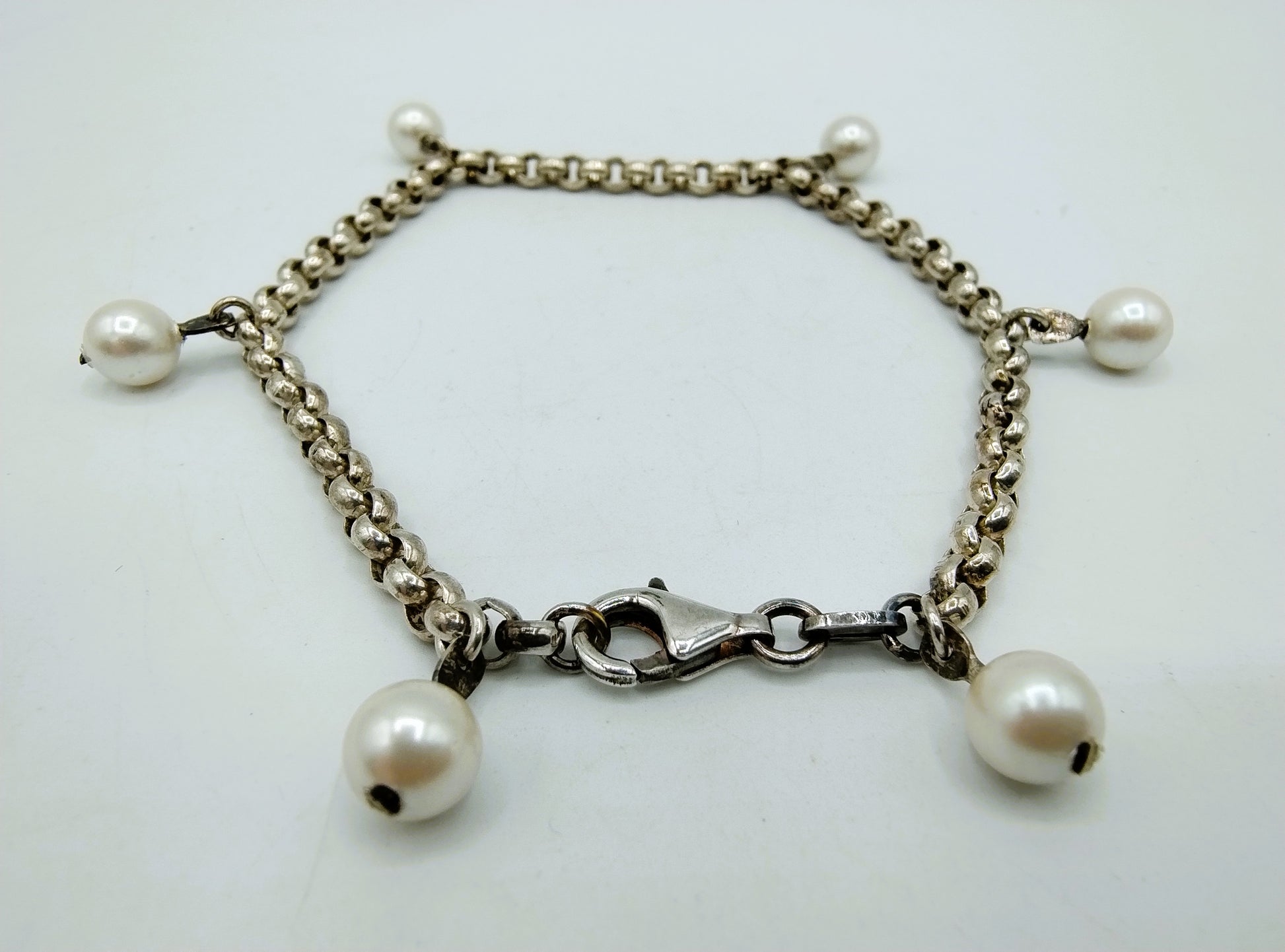 Silberarmband mit Karabinerverschluss und 6 Perlenanhängern.