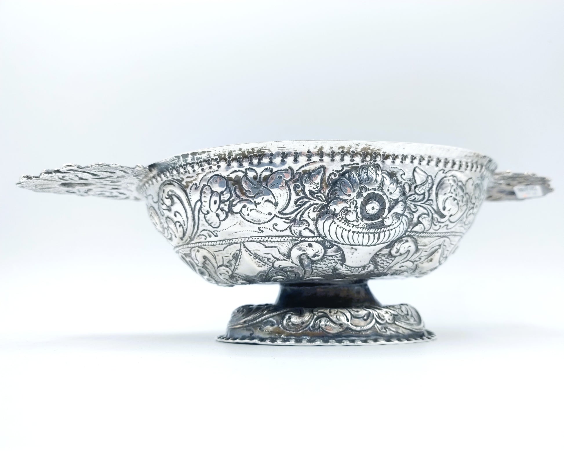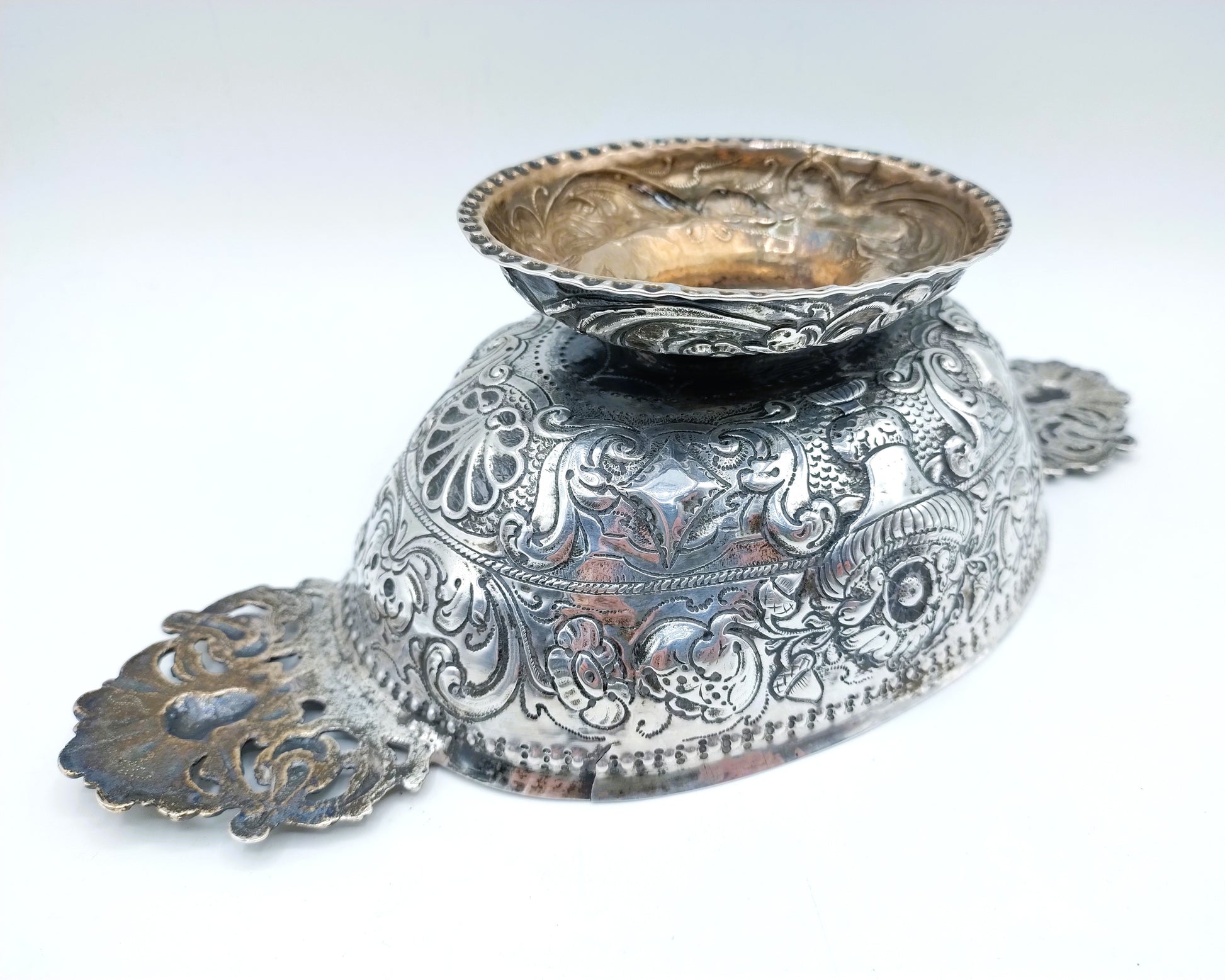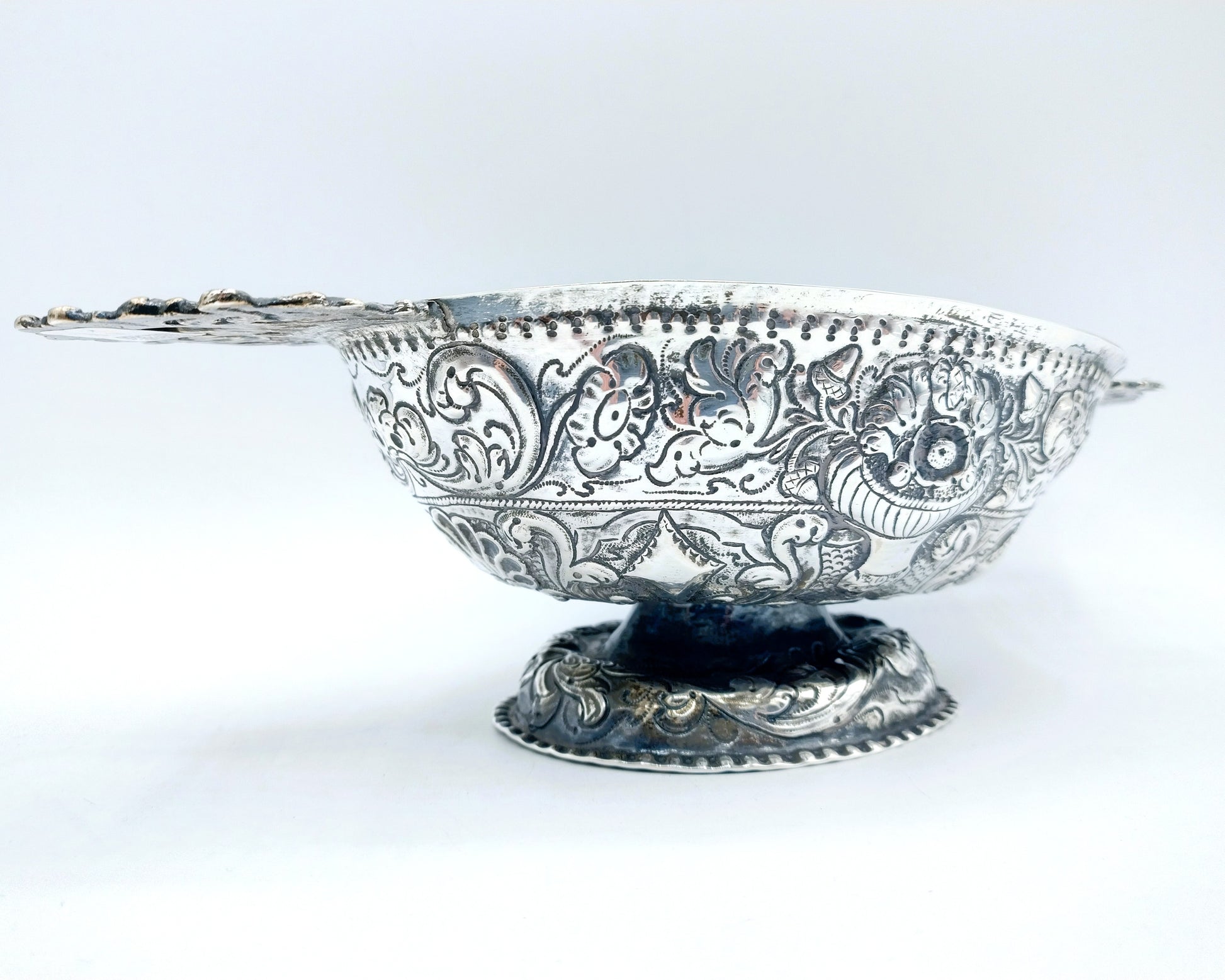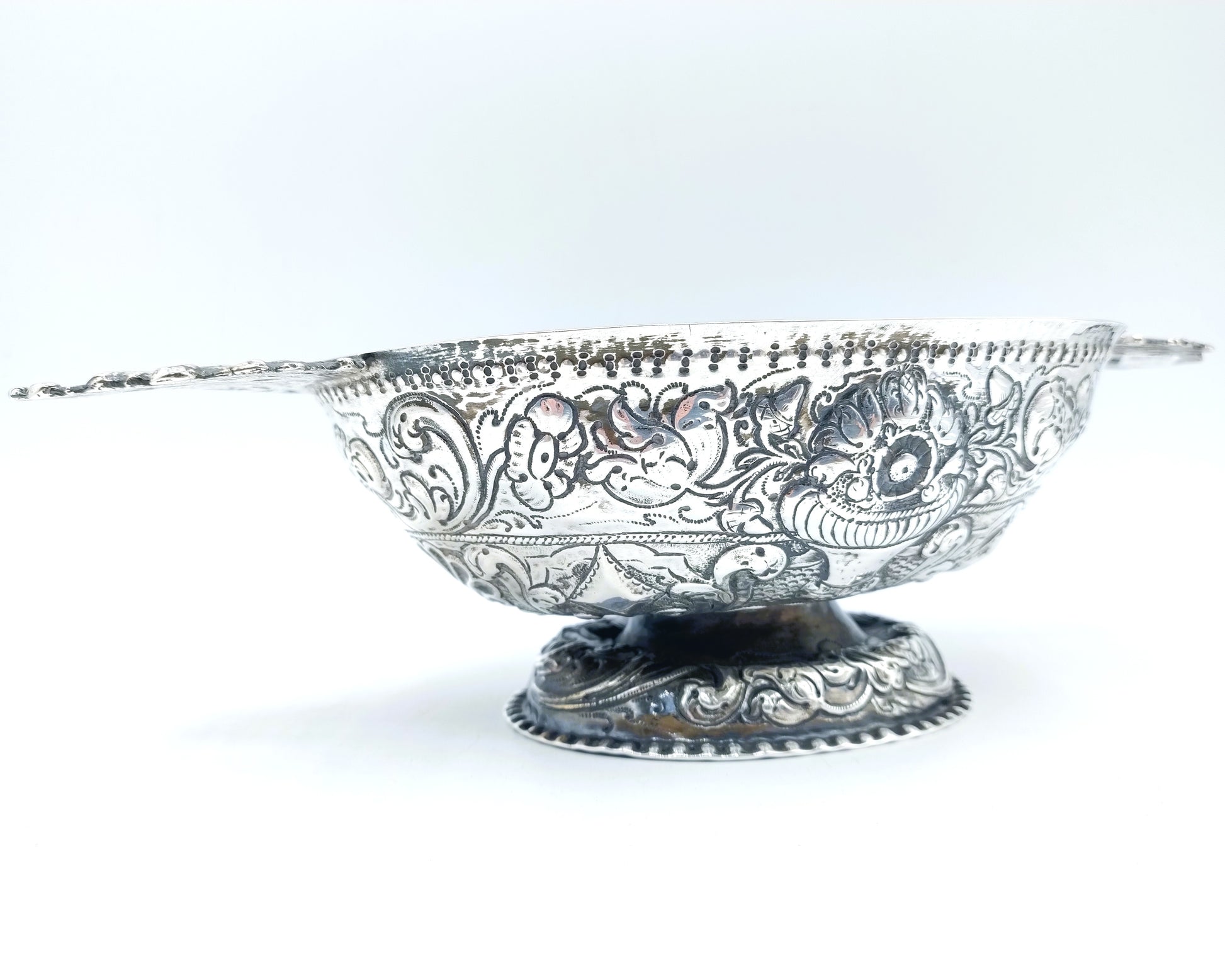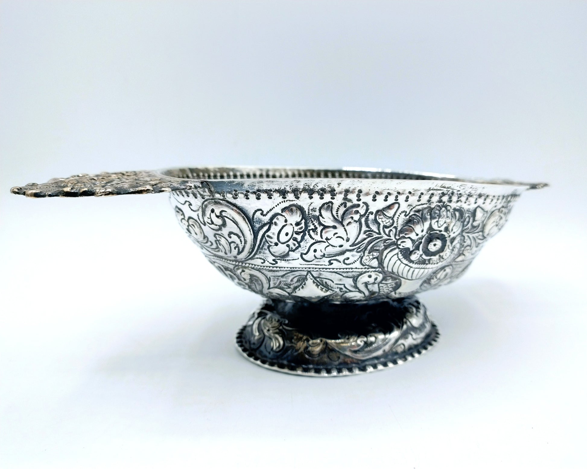 Friesische silberne Schnapsschale mit geprägtem Dekor aus Blumen- und Schnörkelmotiven.