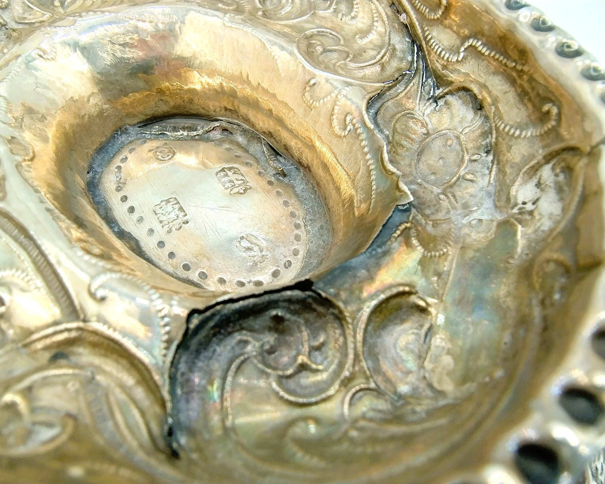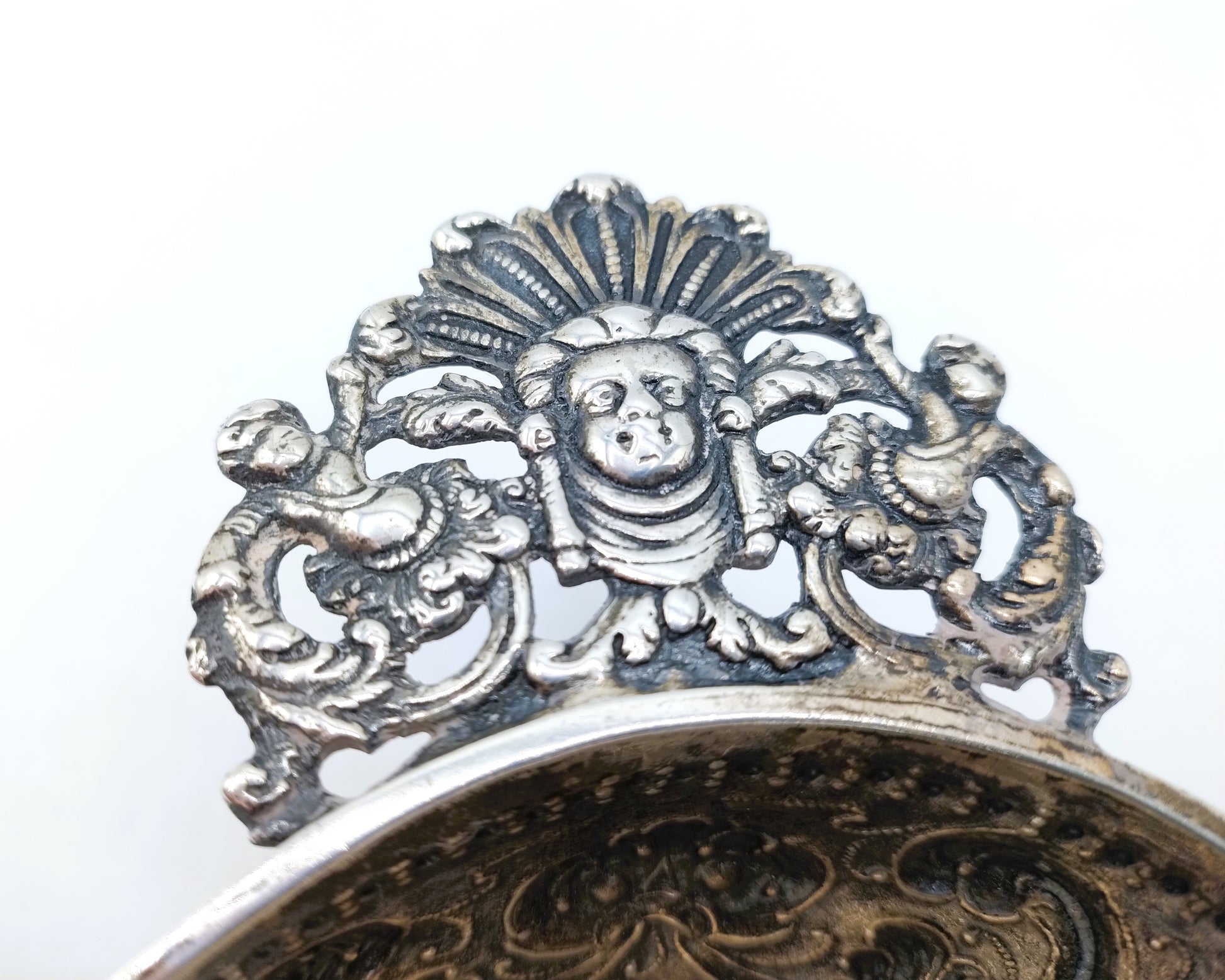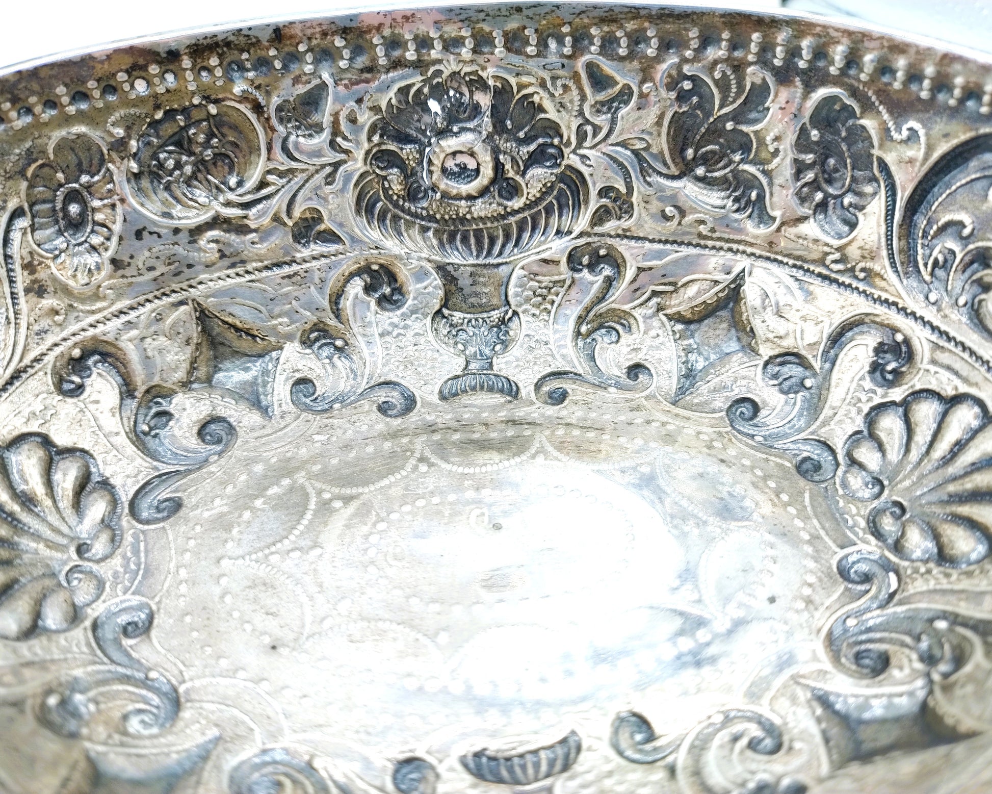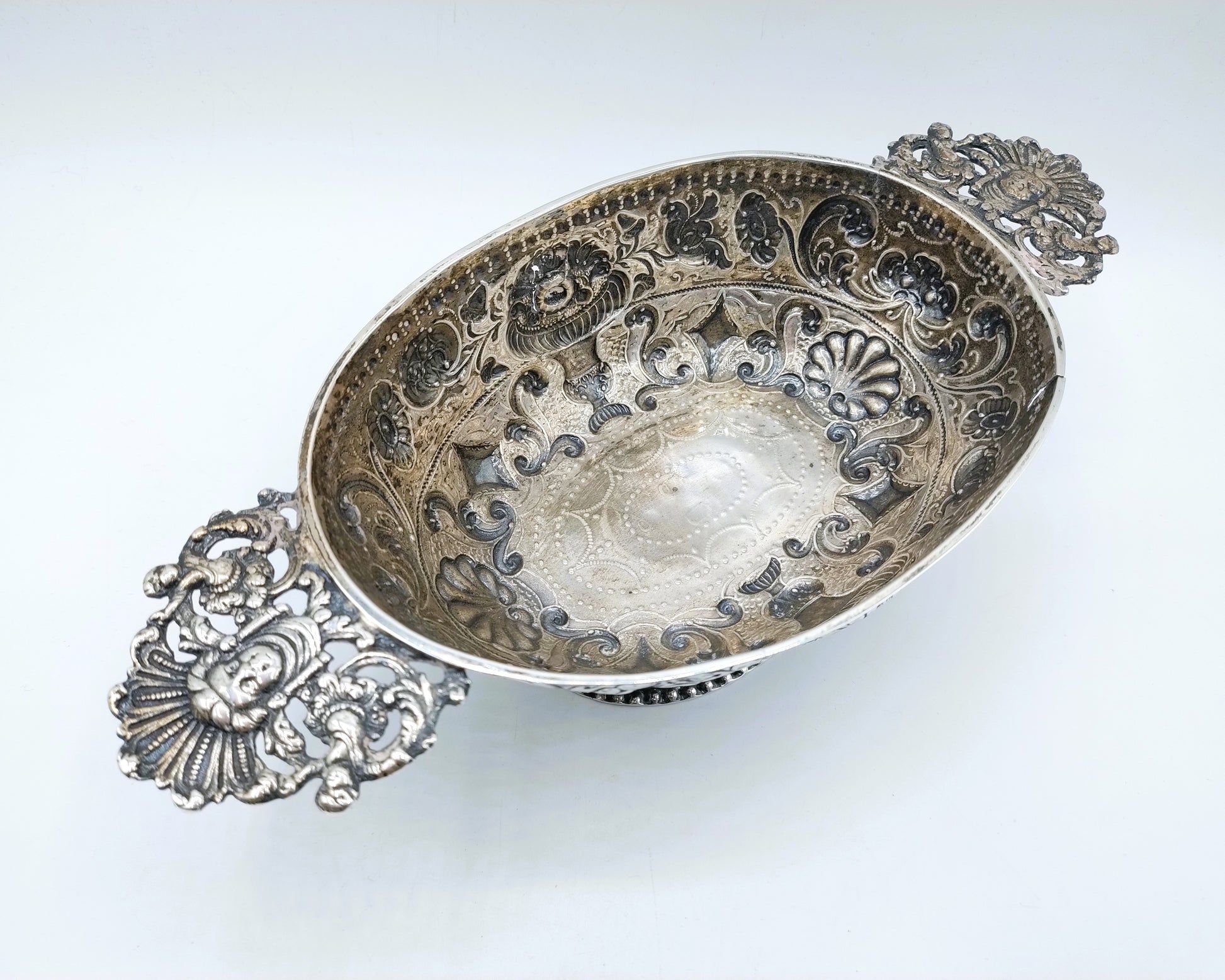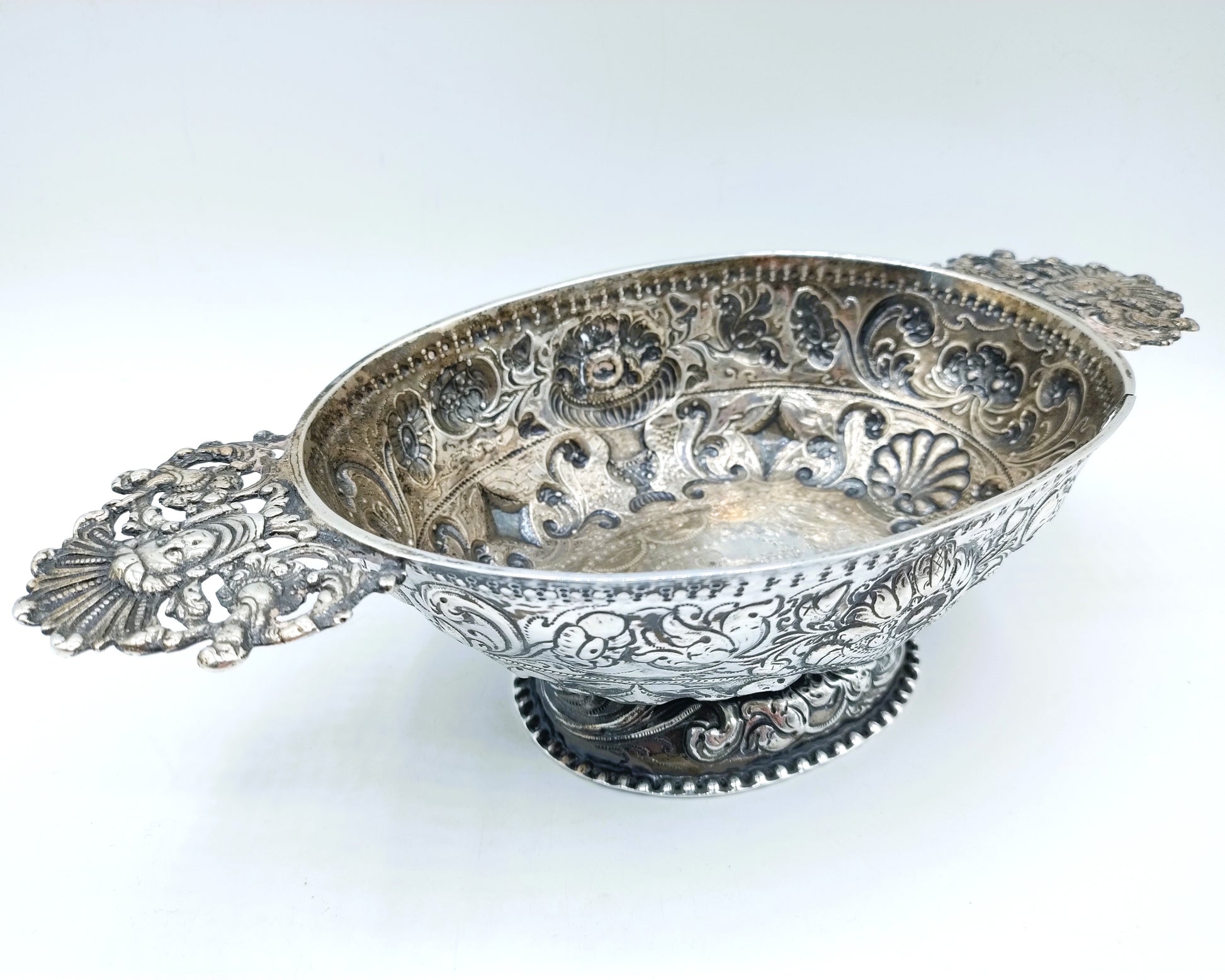 Friesische silberne Schnapsschale mit geprägtem Dekor aus Blumen- und Schnörkelmotiven.