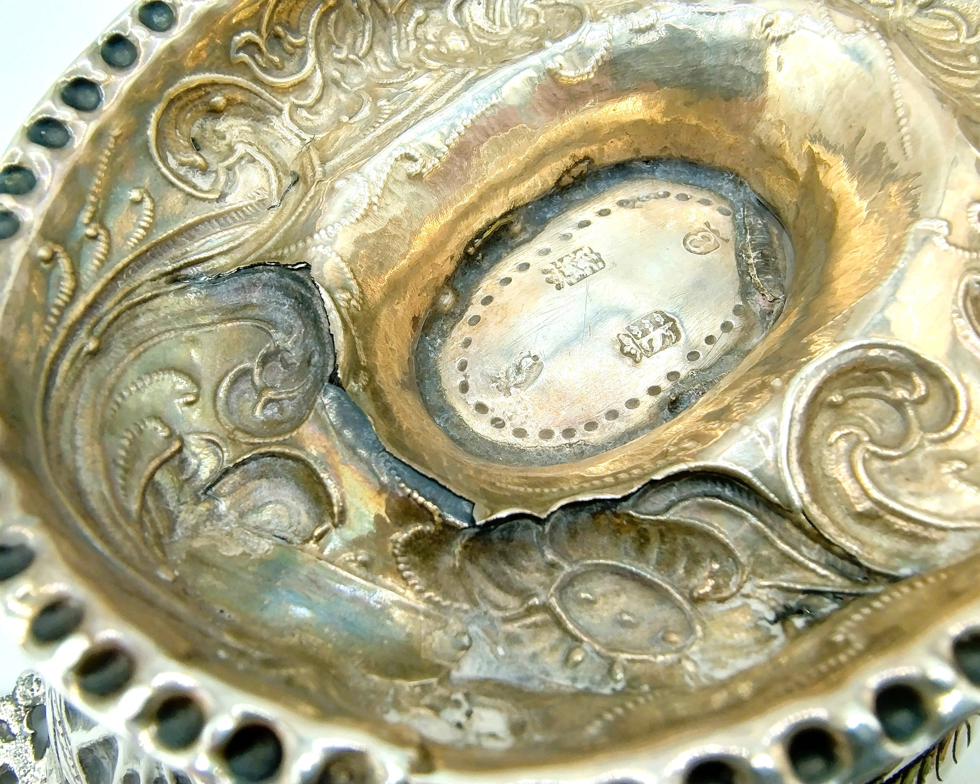 Es gibt einen kleinen Riss oben am Rand und einen weiteren Riss unten am Boden der Schale. Dieser ist nicht sichtbar, wenn die Schale steht. (Siehe auch die Fotos.)