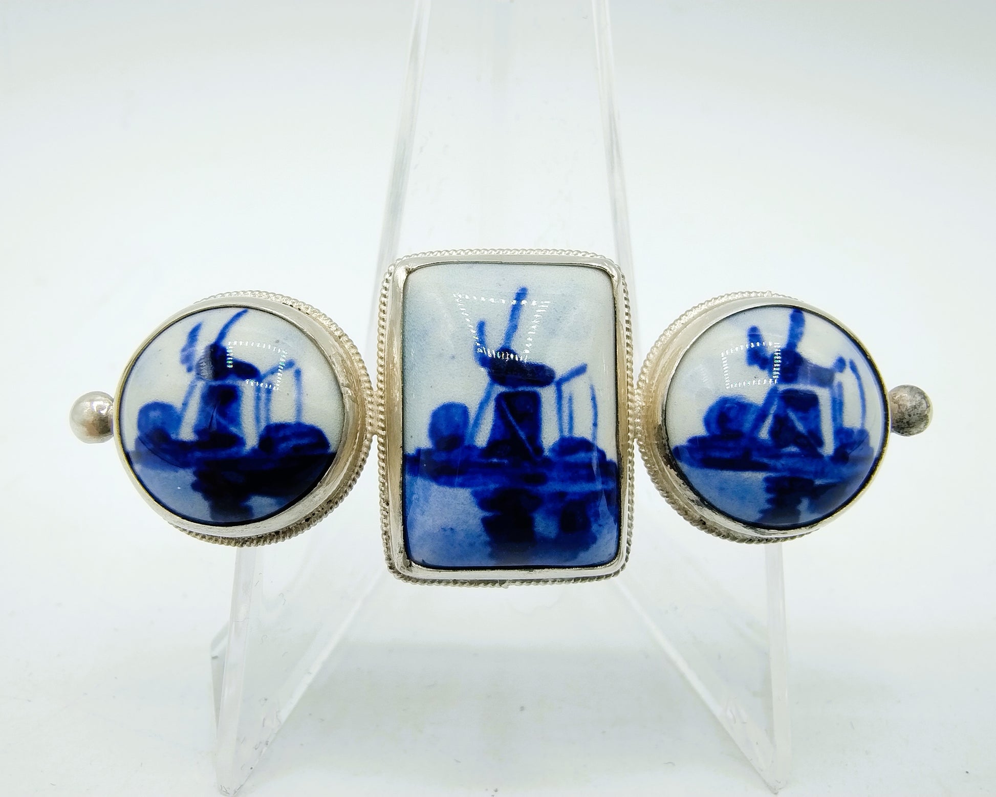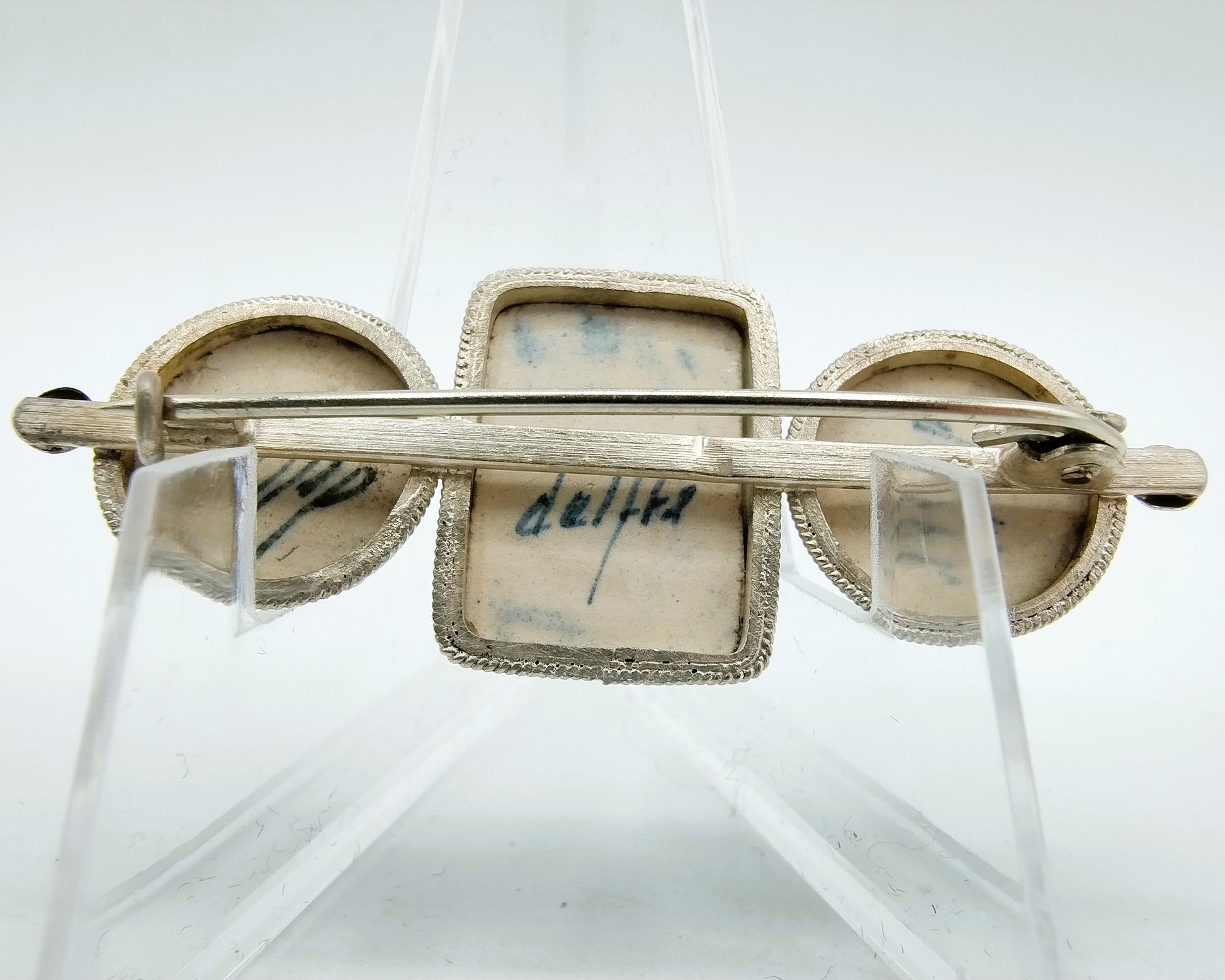 Silberbrosche mit 3 Delfter blauen Keramikbildern einer Mühle. Diese Bilder werden in einer glatten Hülle platziert.