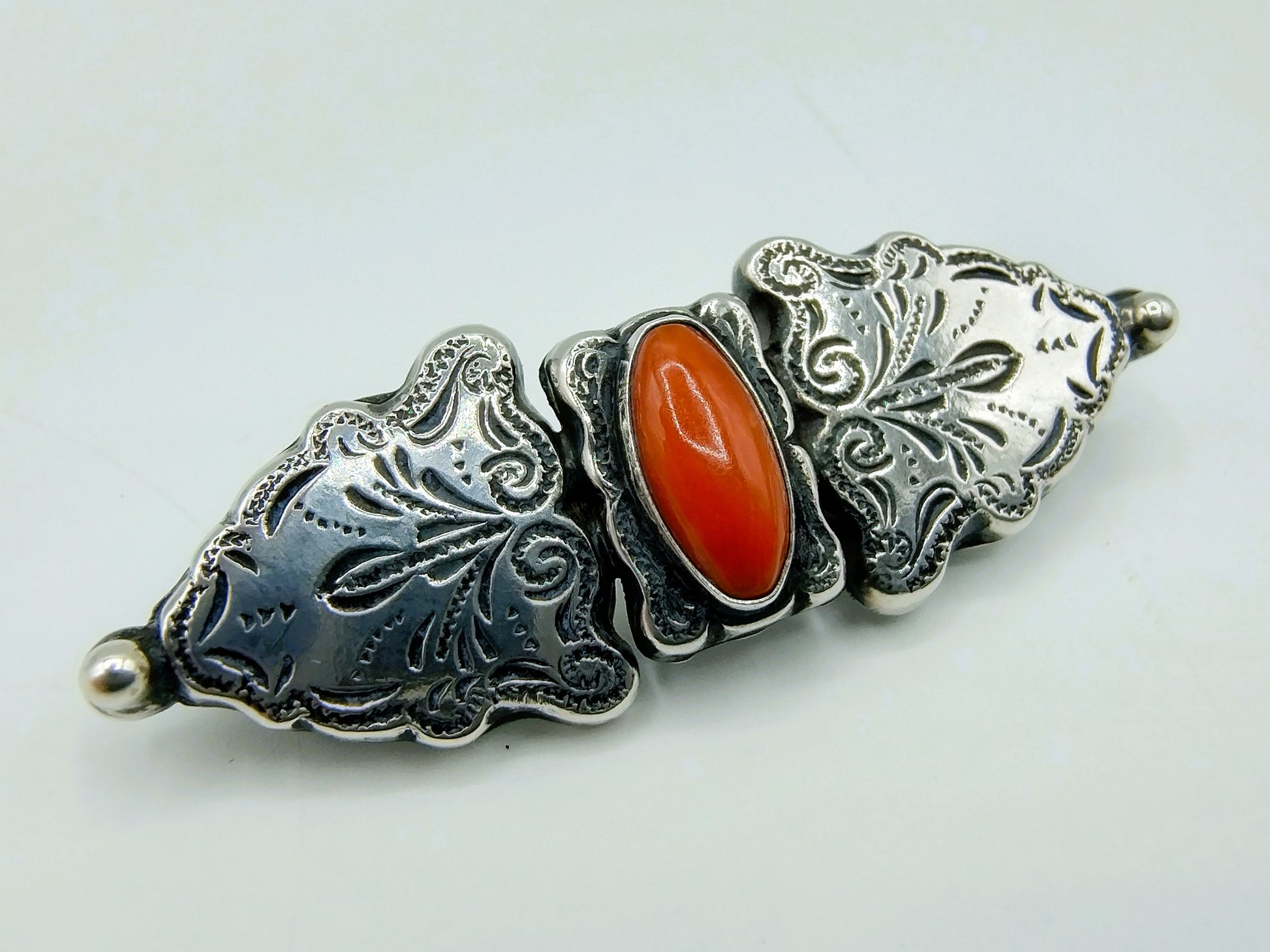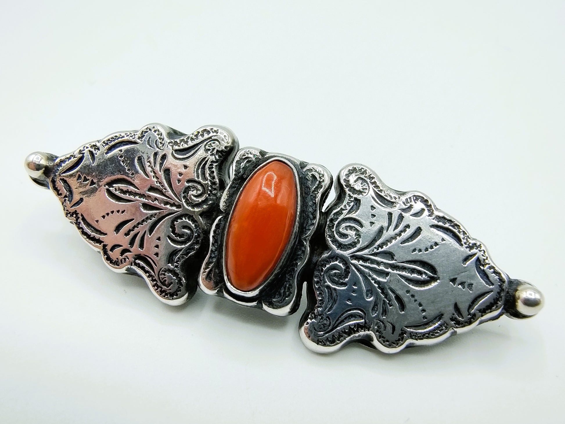 Silberbrosche mit einer roten Koralle im Cabochonschliff. Die Maße der roten Koralle betragen: 5 x 11 mm.