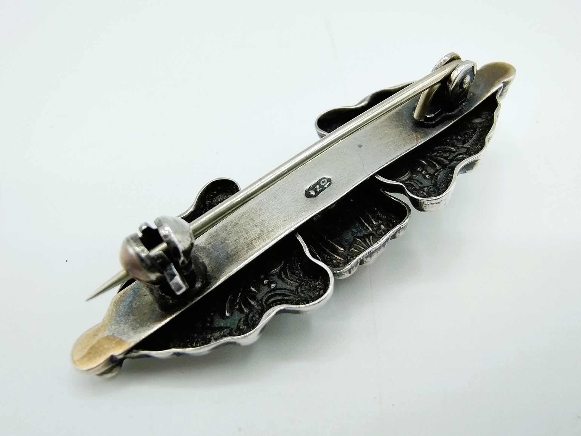 Die Silberbrosche ist mit der Meisterpunze Krone N10 für Niekerk in Schoonhoven versehen. Weitere Inspektion mit dem Schwert.