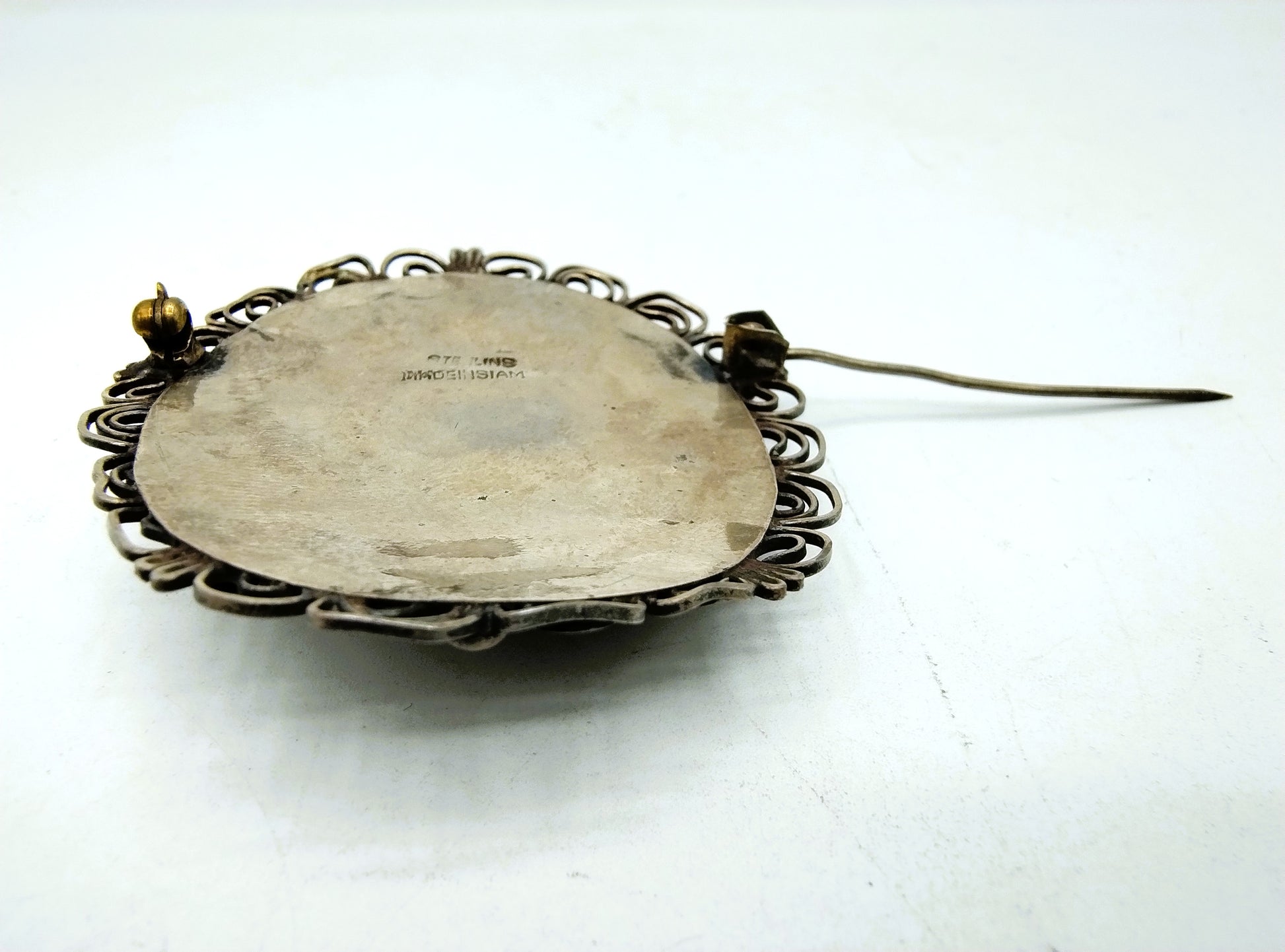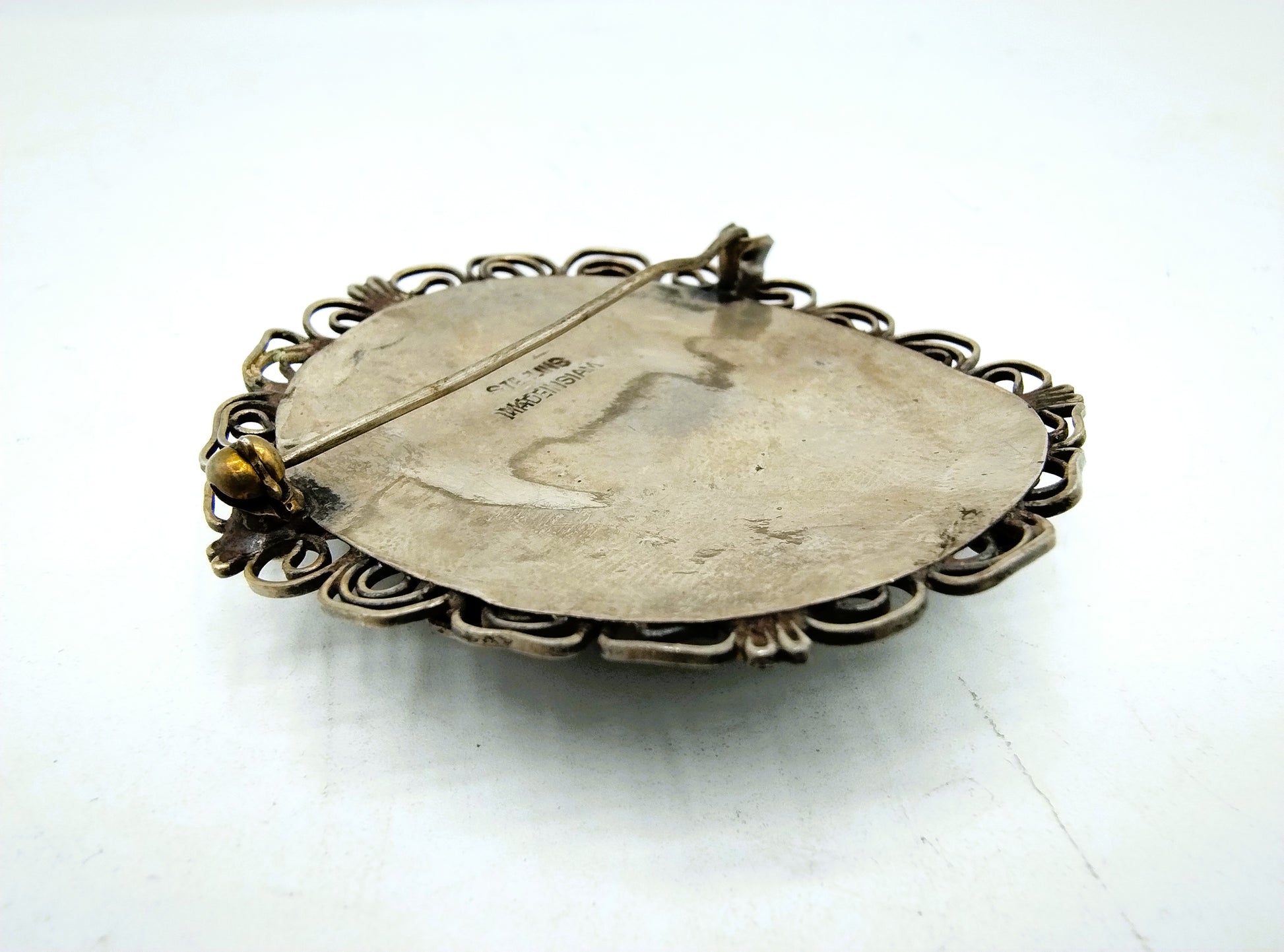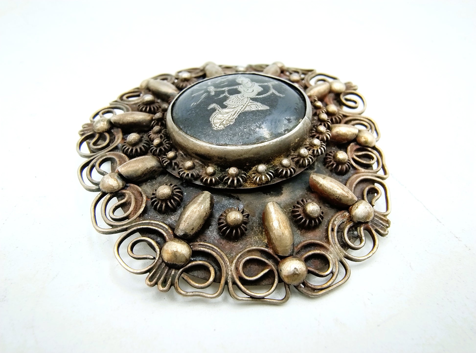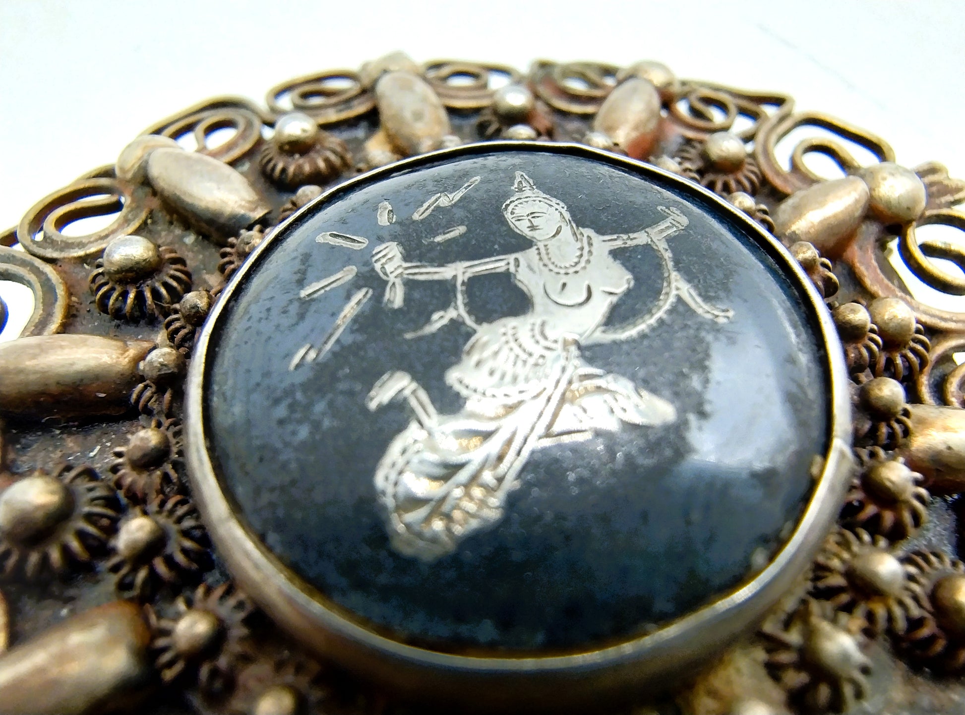 Vintage Silberbrosche mit dem Bild einer Tänzerin, umgeben von filigraner Silberschmiedearbeit.