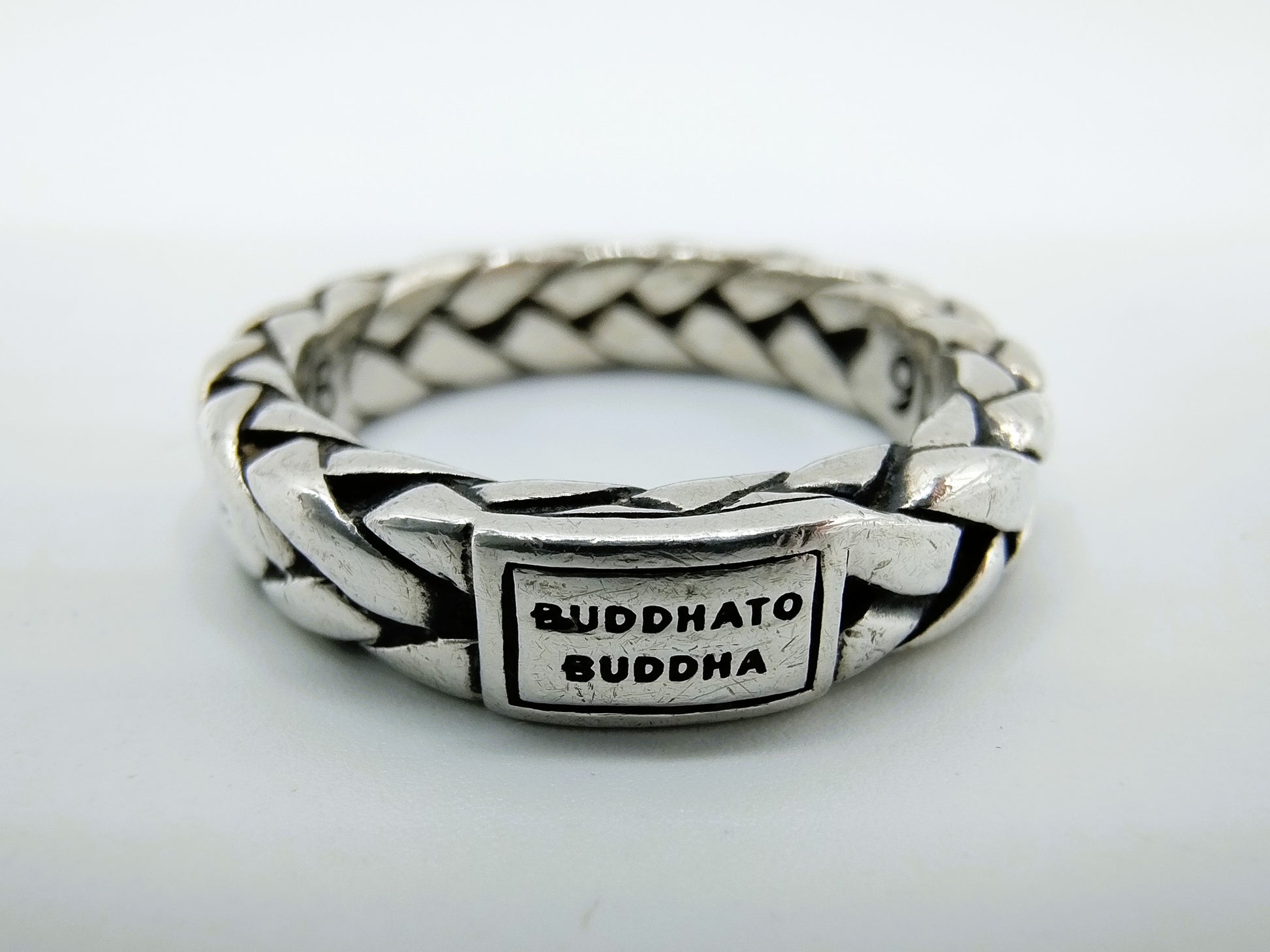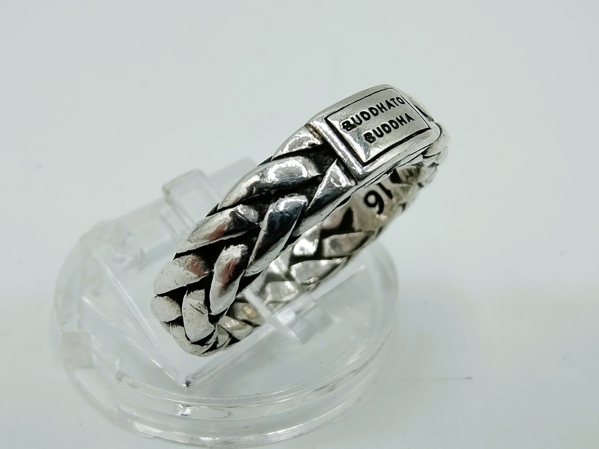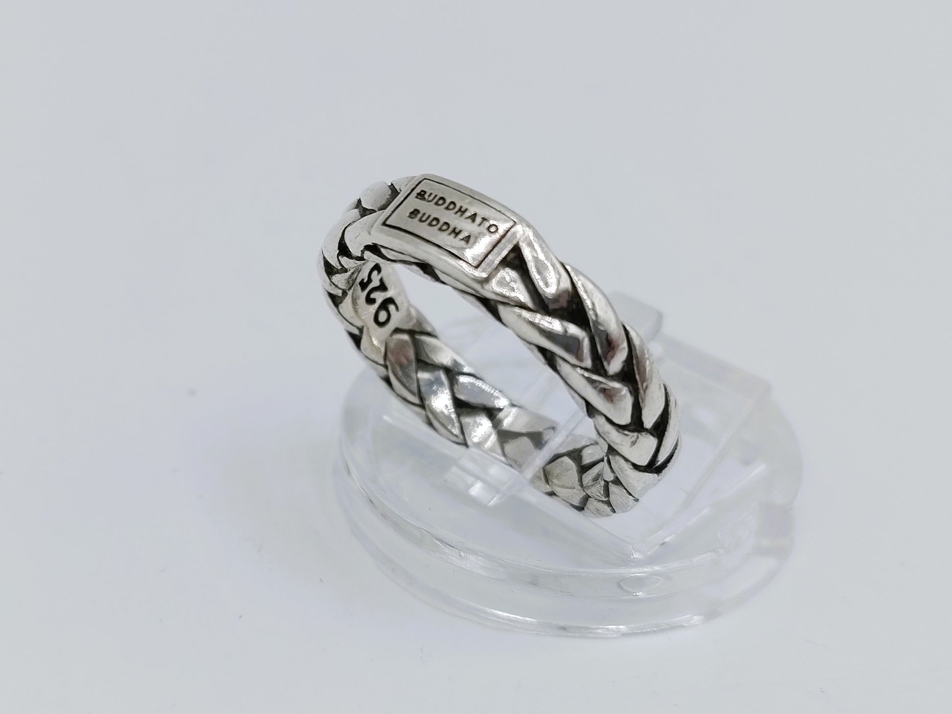 Silberner Buddha-to-Buddha-Ring mit geflochtenem Motiv.