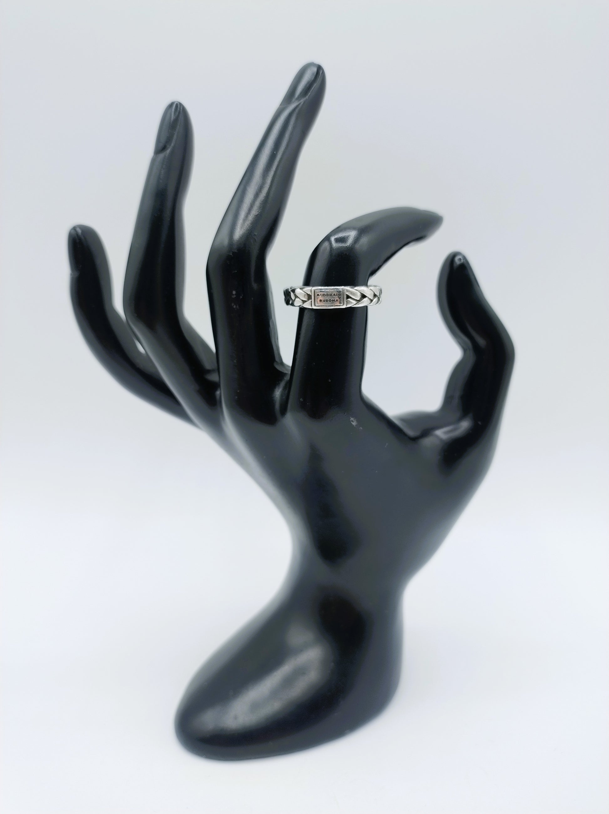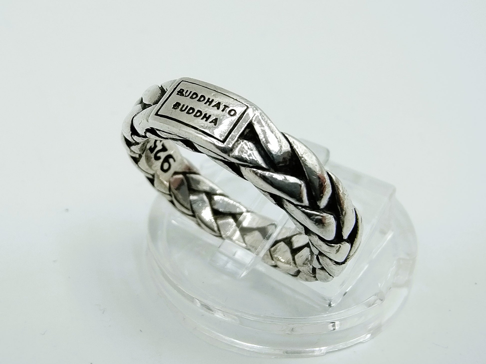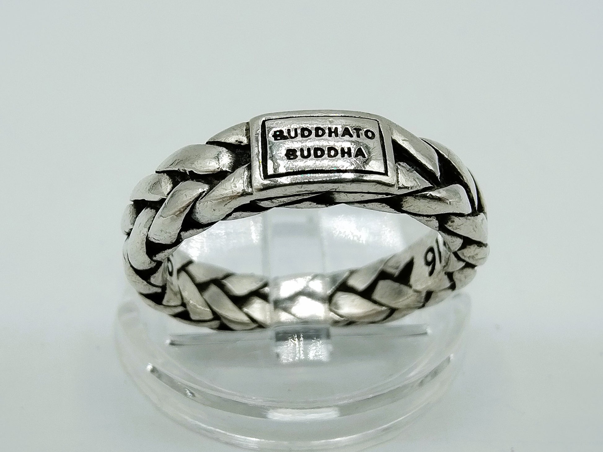 Silberner Buddha-to-Buddha-Ring mit geflochtenem Motiv.