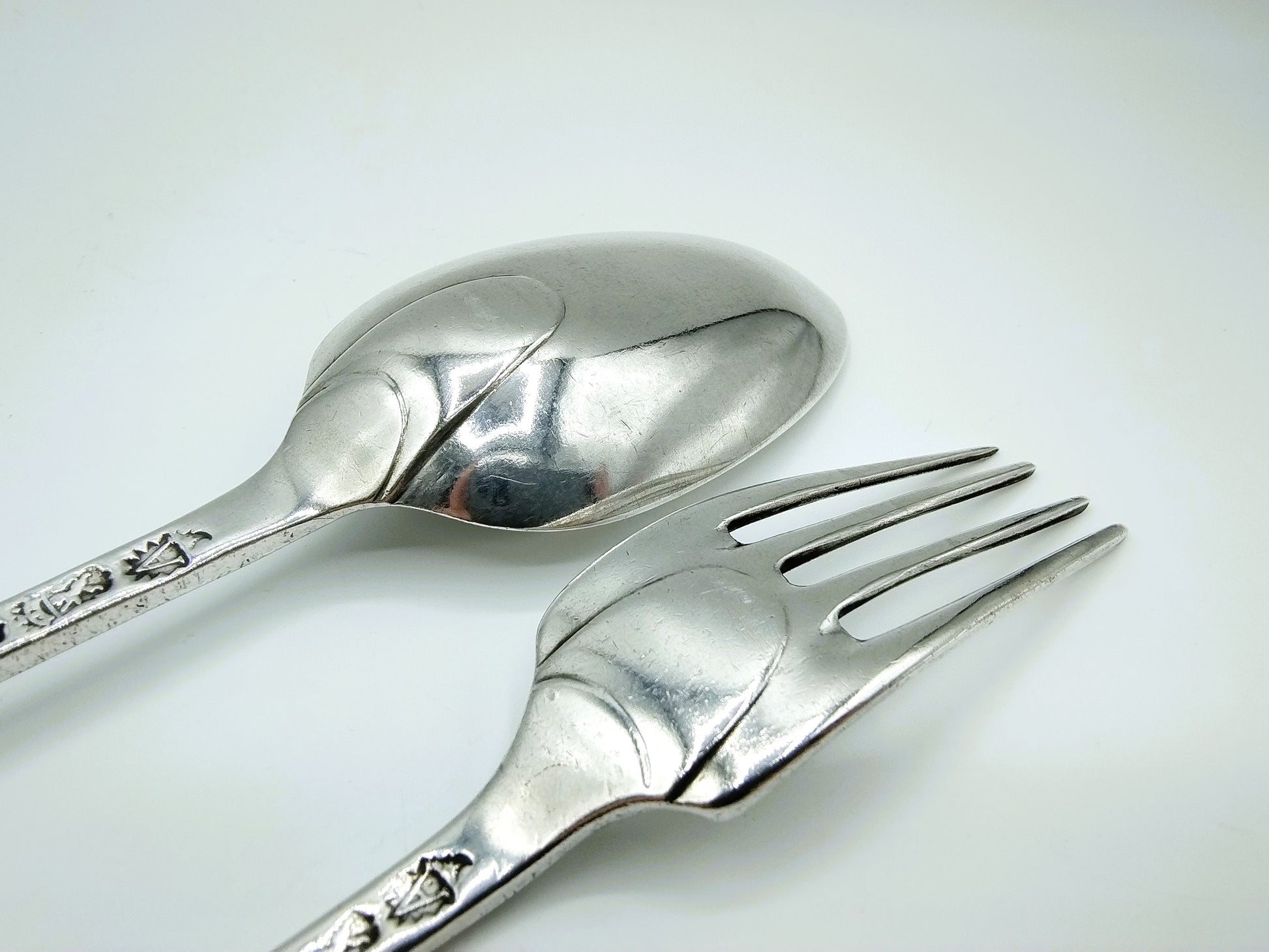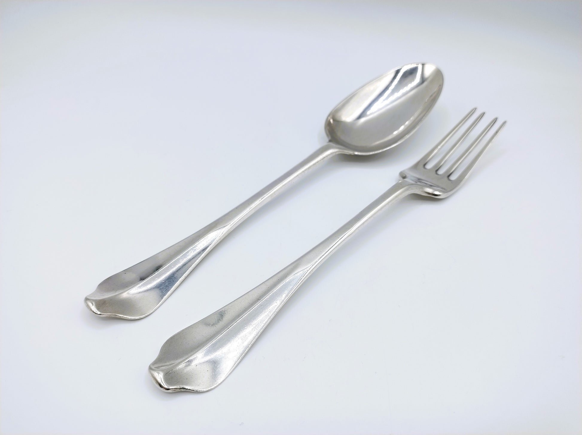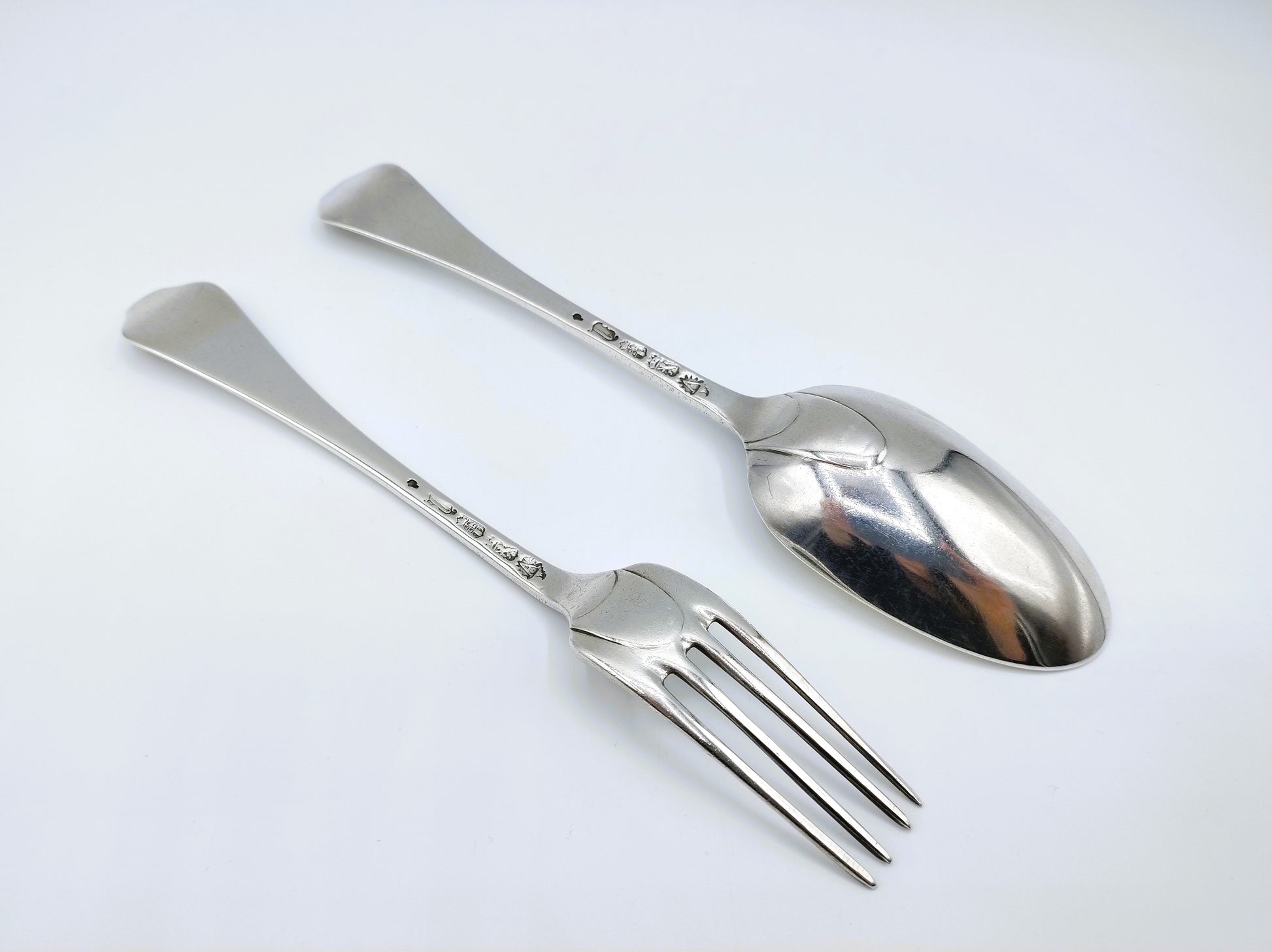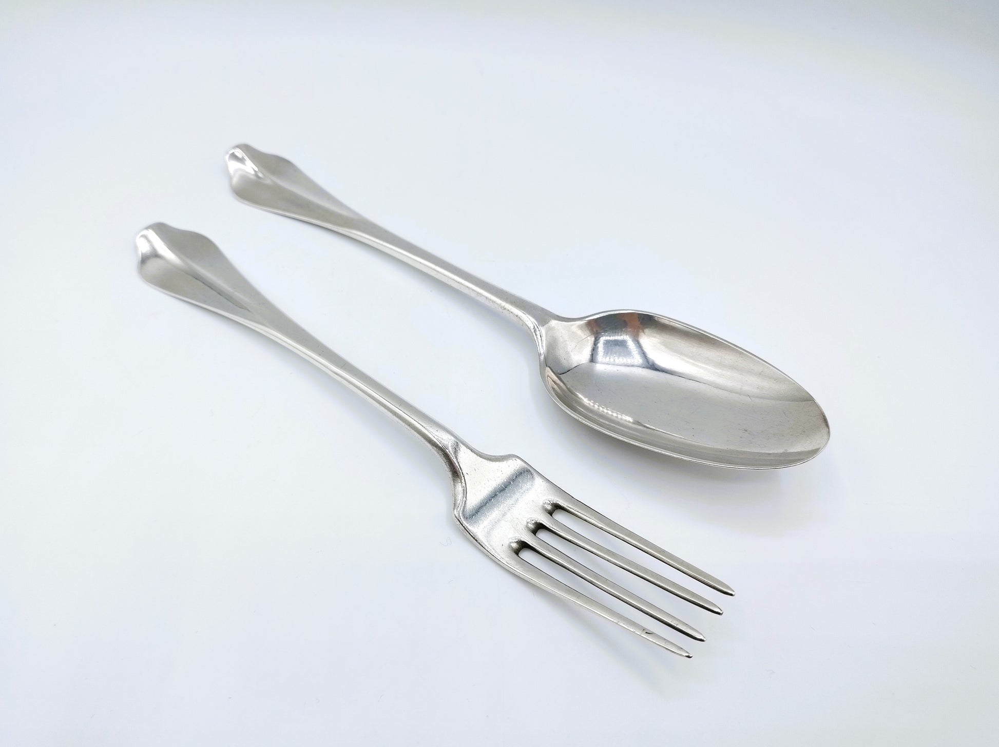 Zilveren couvert, bestaande uit een vork en een lepel, mogelijk gemaakt door de zilversmid Claas van der Aa II uit Rotterdam. Hij was werkzaam tussen 1768 en 1795.
