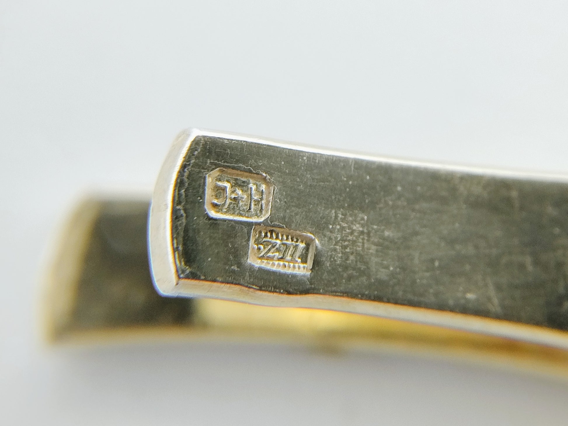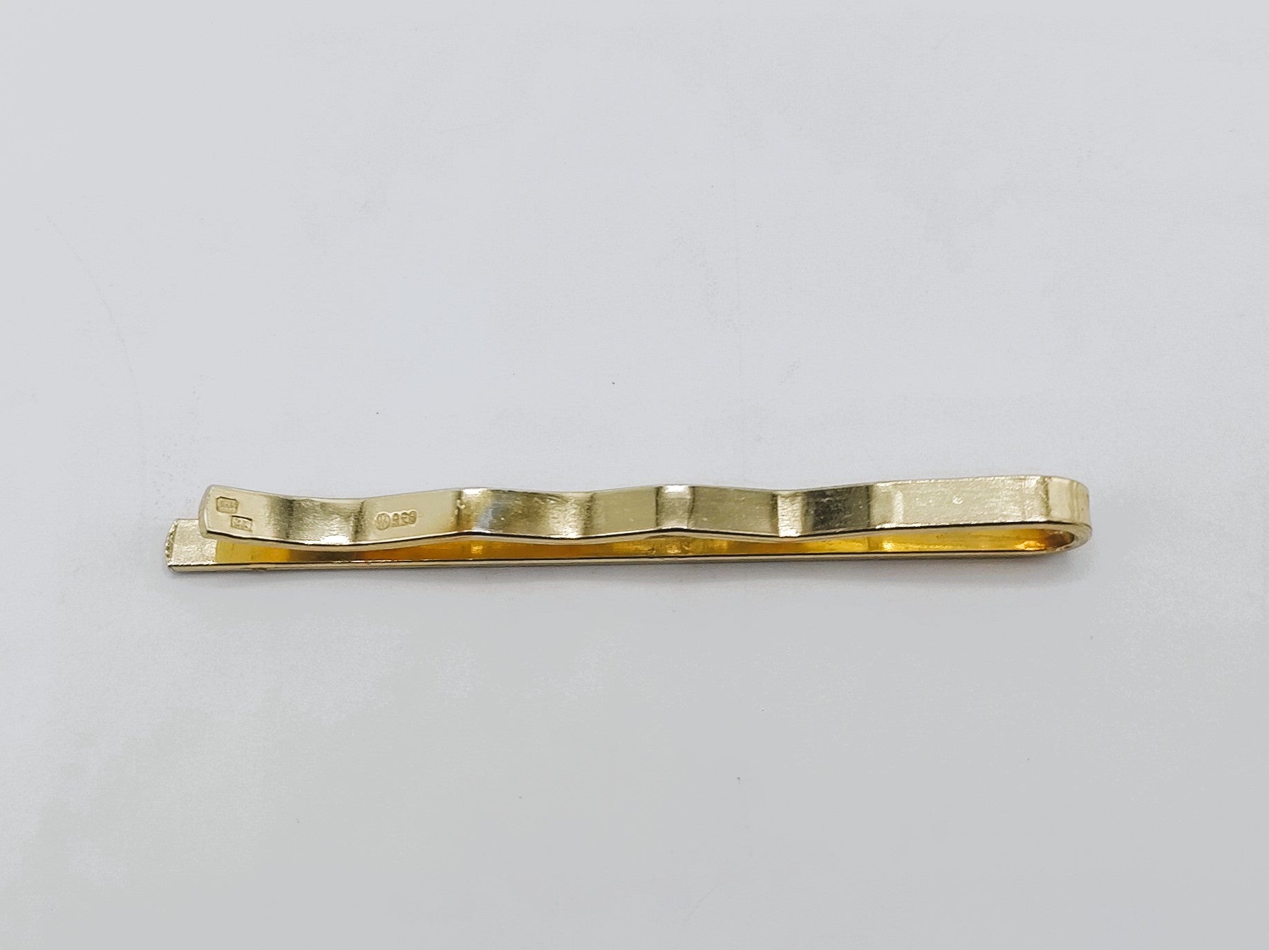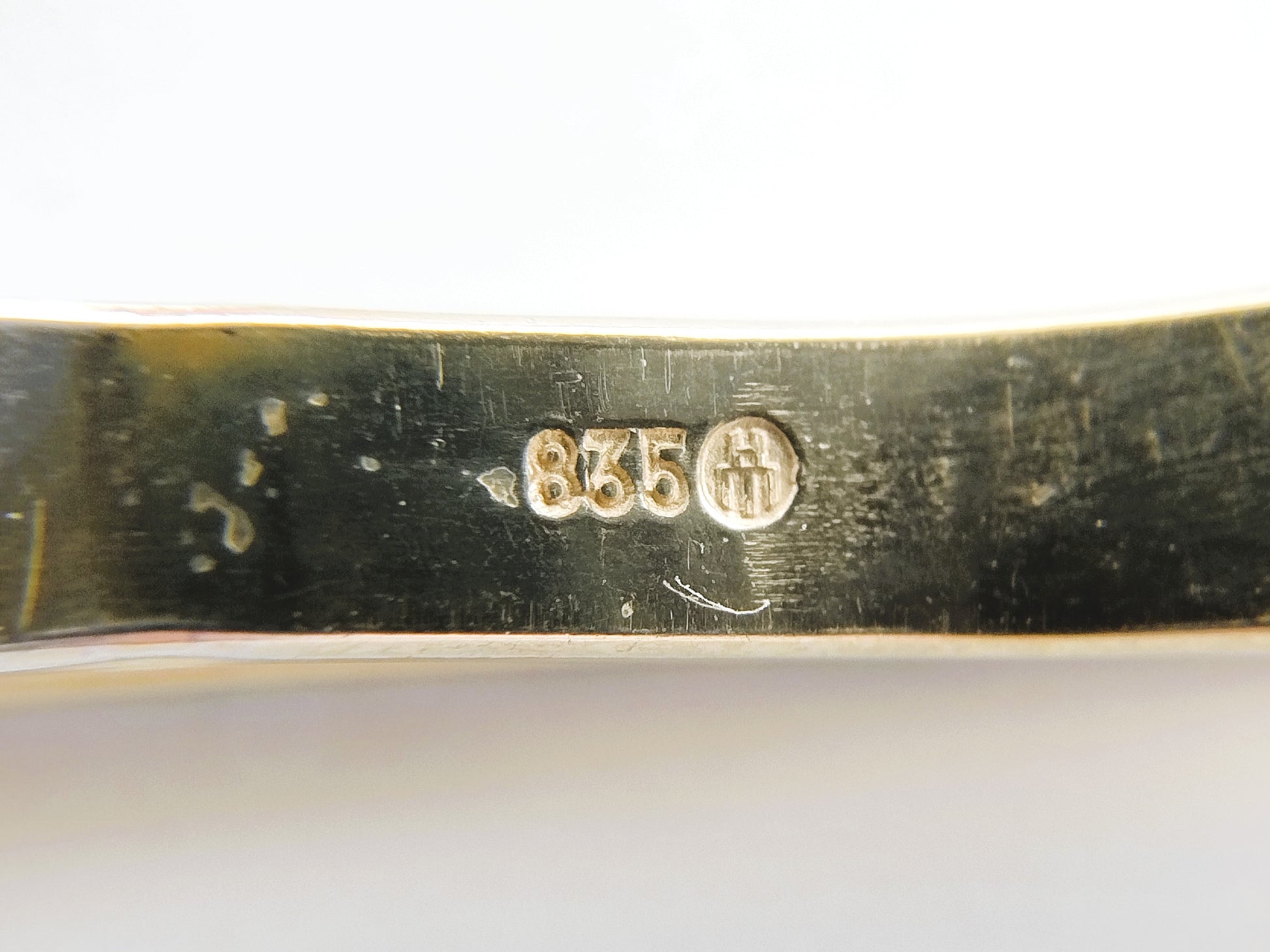 Die Krawattenklammer ist mit dem Feingehaltsstempel 835 und Z11 für Silber 2. Güteklasse gestempelt.