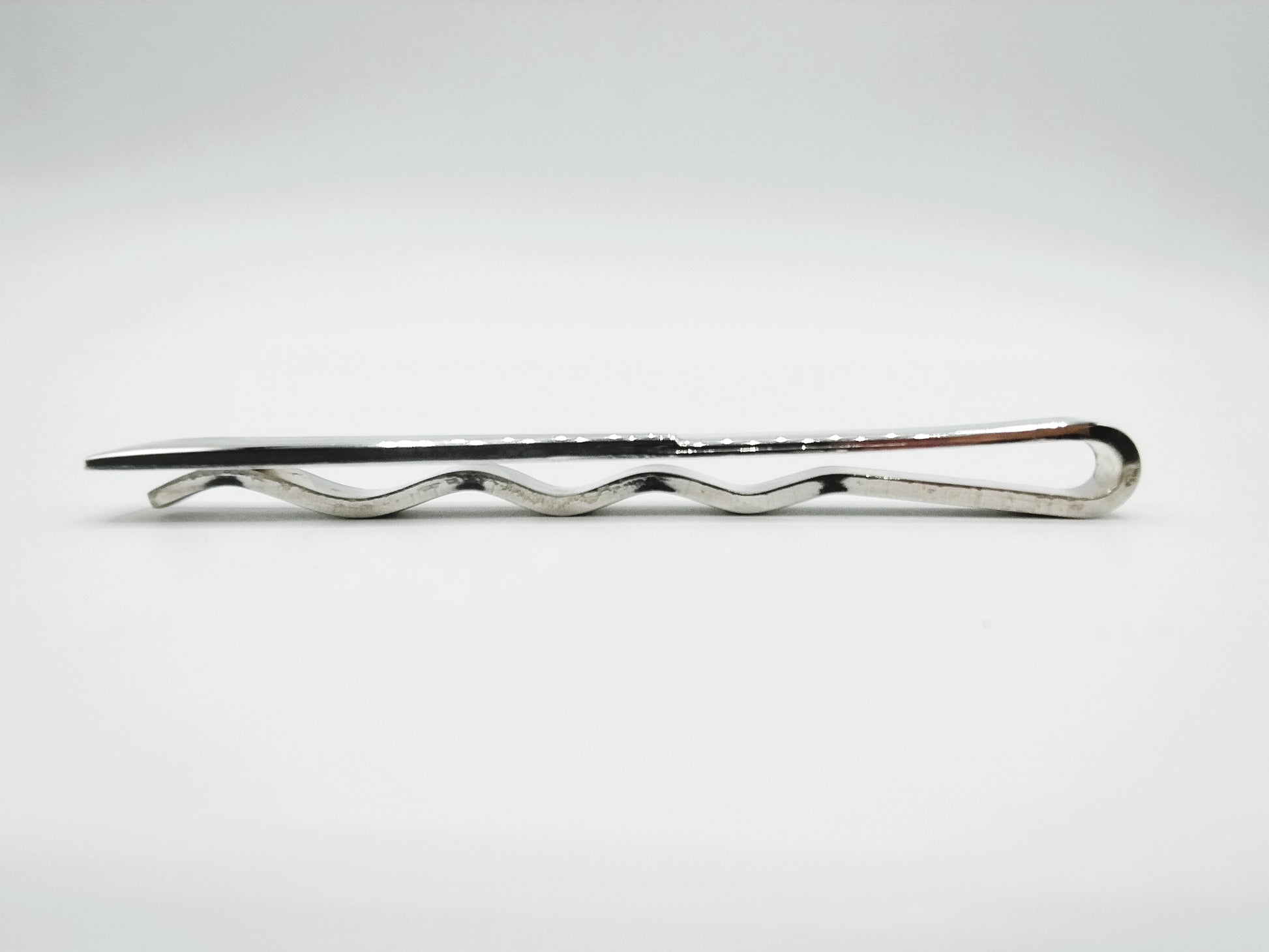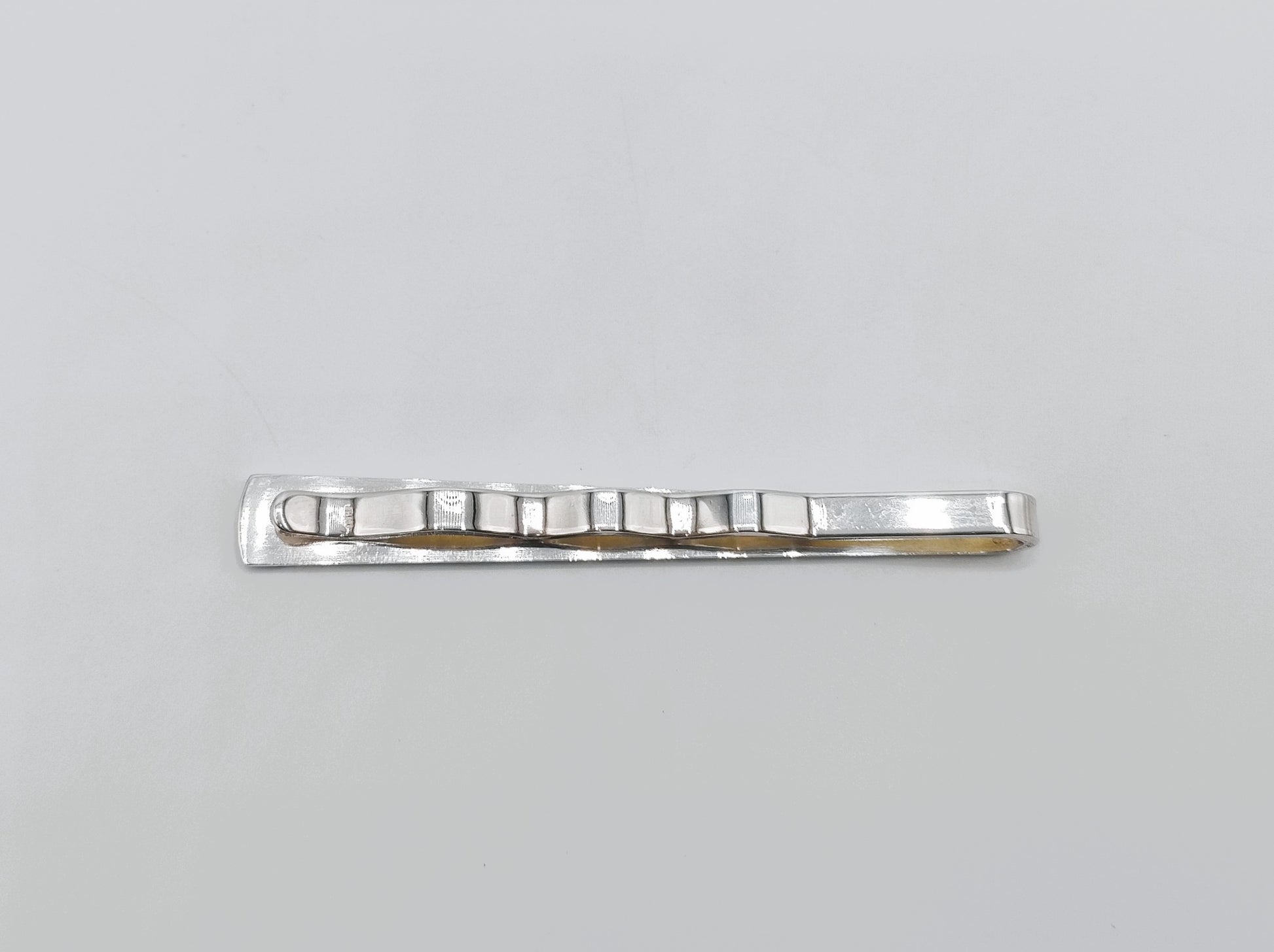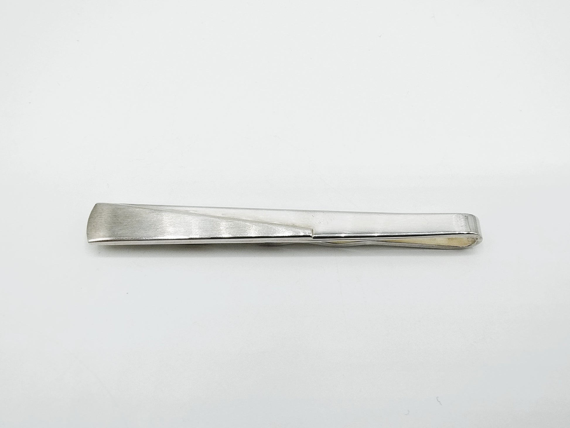 Schwere silberne Krawattenklammer mit modernem Design.