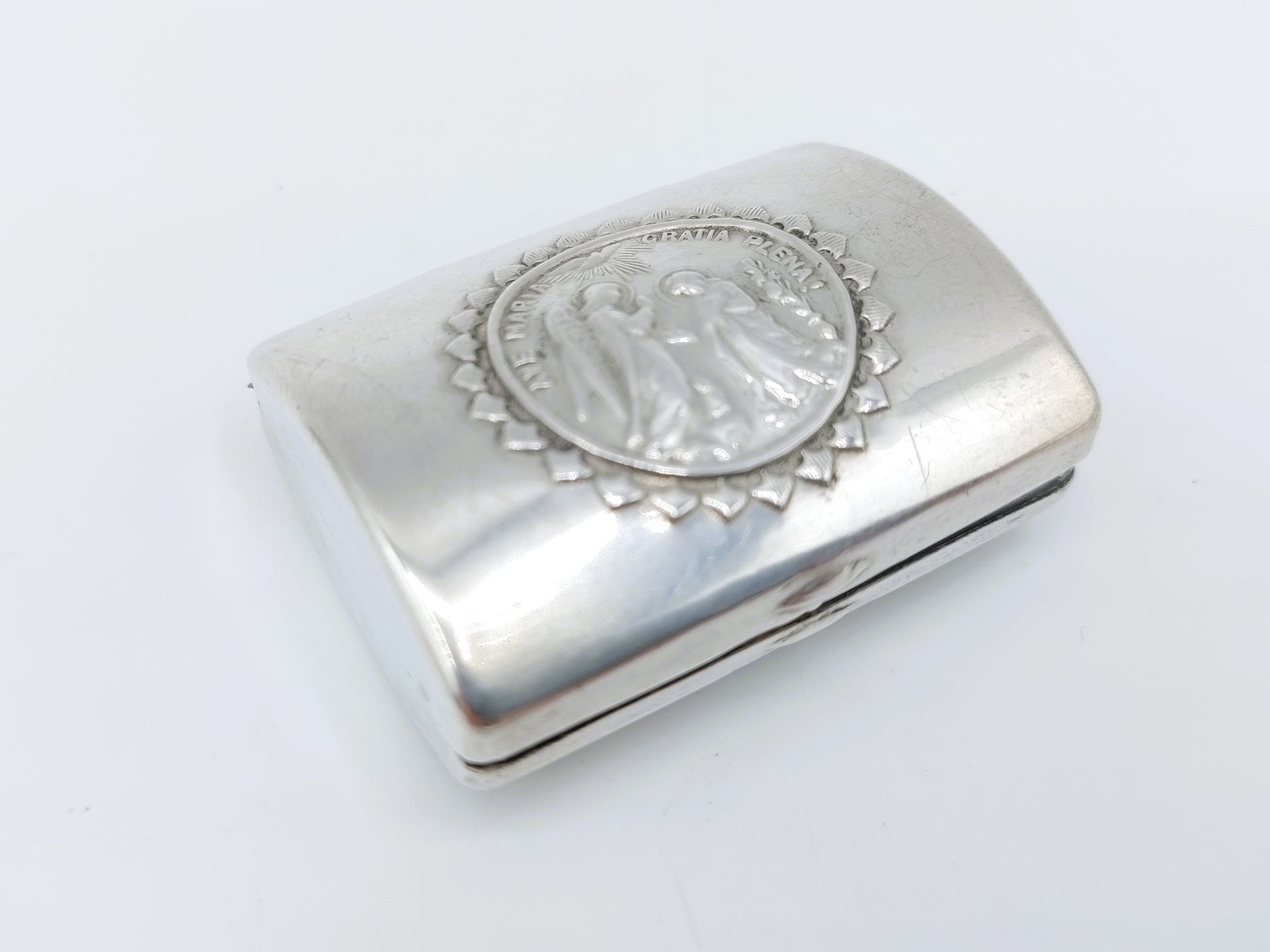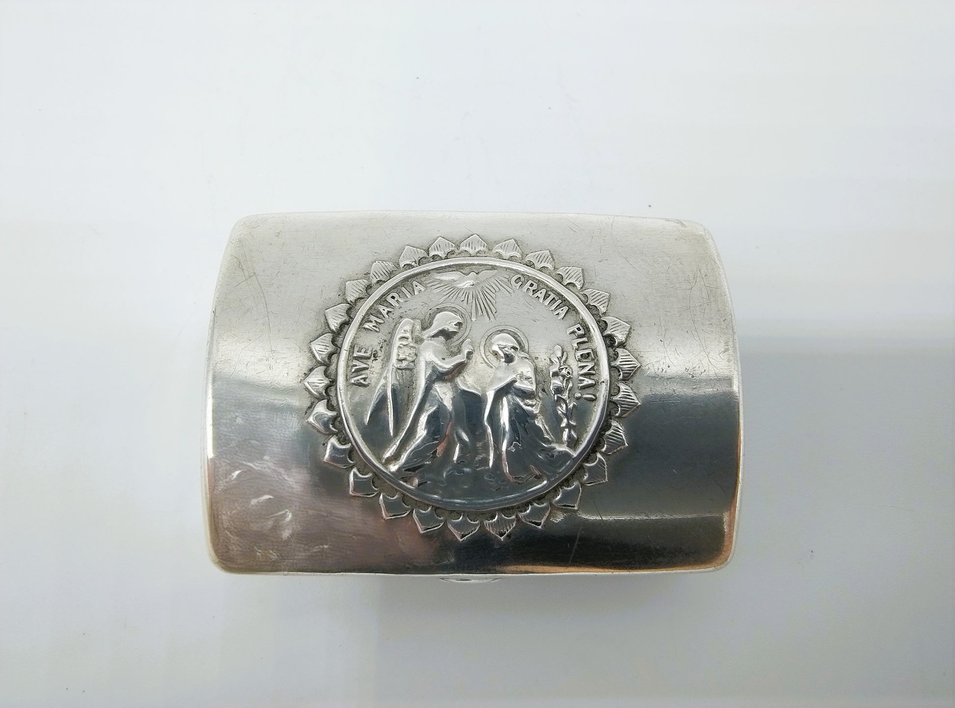 Silberne Dose mit dem Bild von Maria mit einem Engel und der Taube als Symbol des Heiligen Geistes. Wird zur Aufbewahrung eines Rosenkranzes oder Paternosters verwendet.