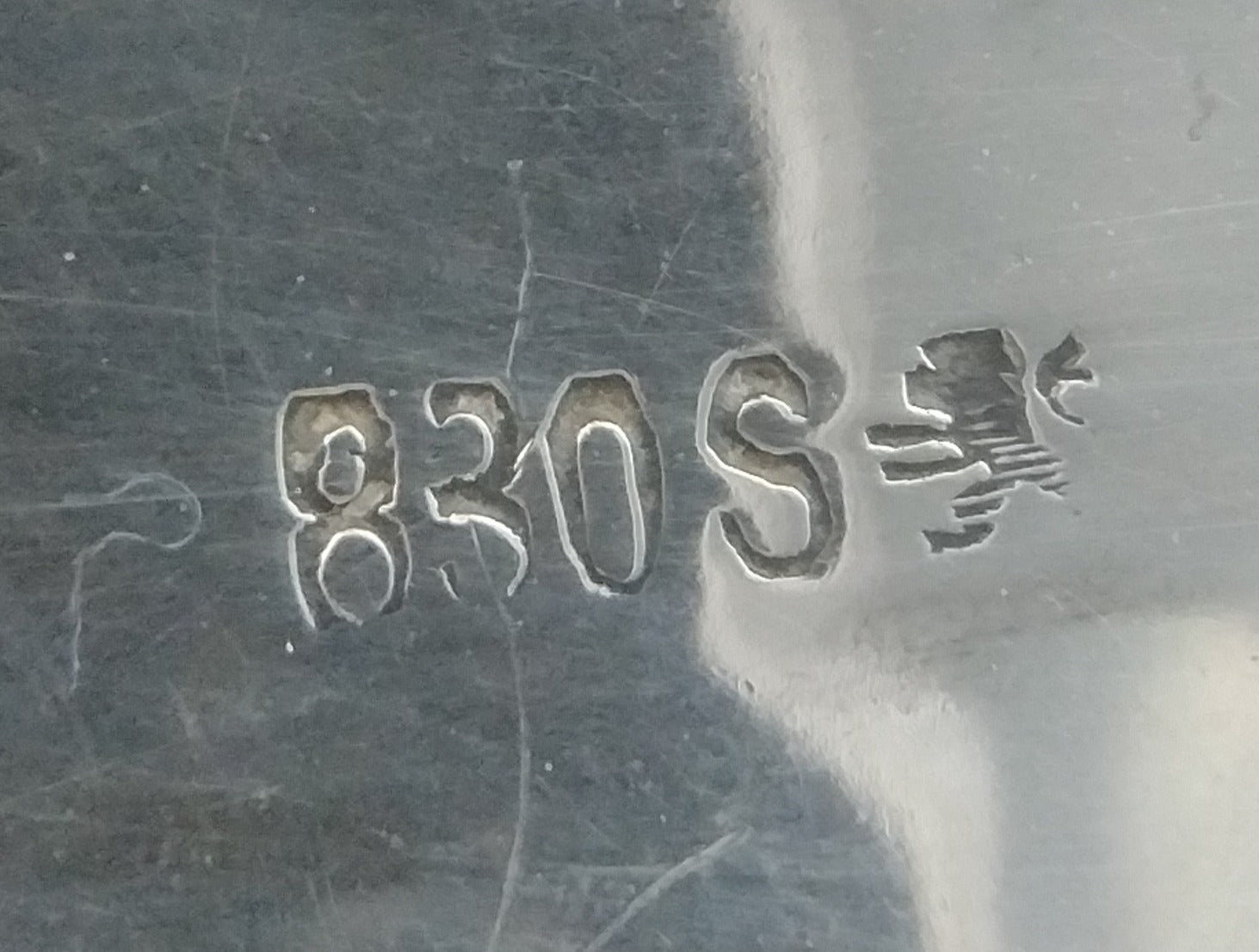 Die Schale ist mit dem Qualitätszeichen 830S (830/1000) und dem Meisterzeichen eines Löwen versehen.